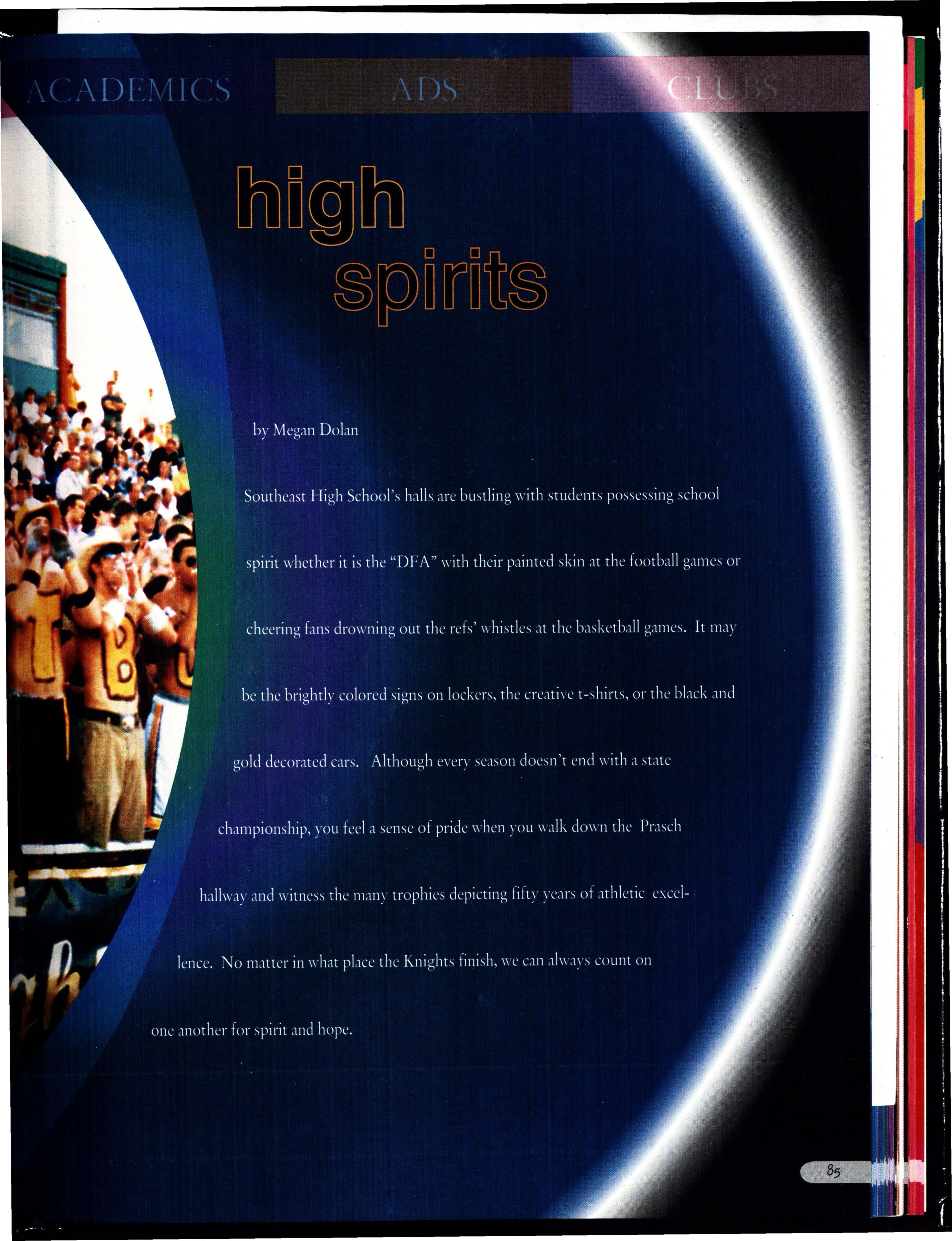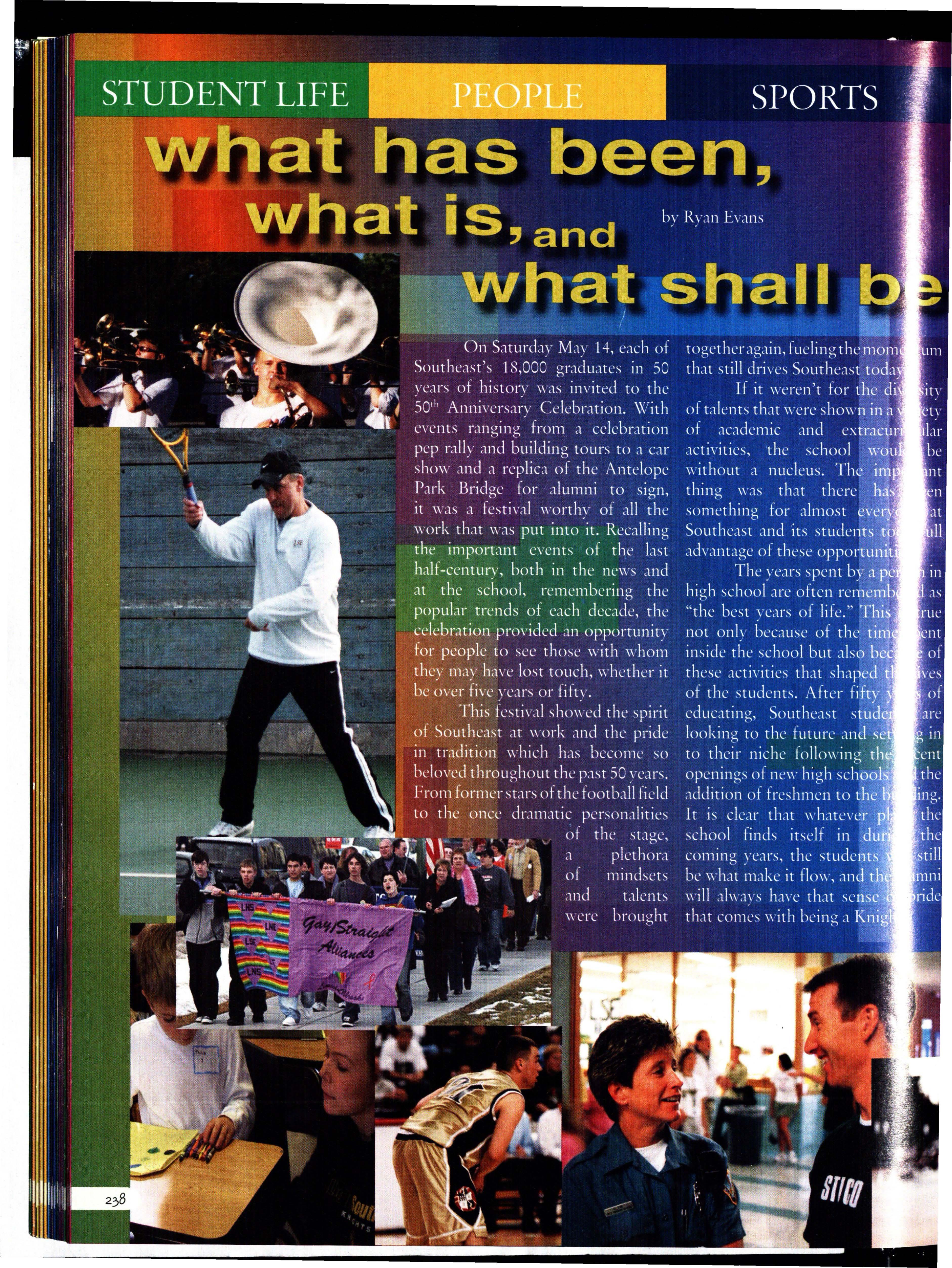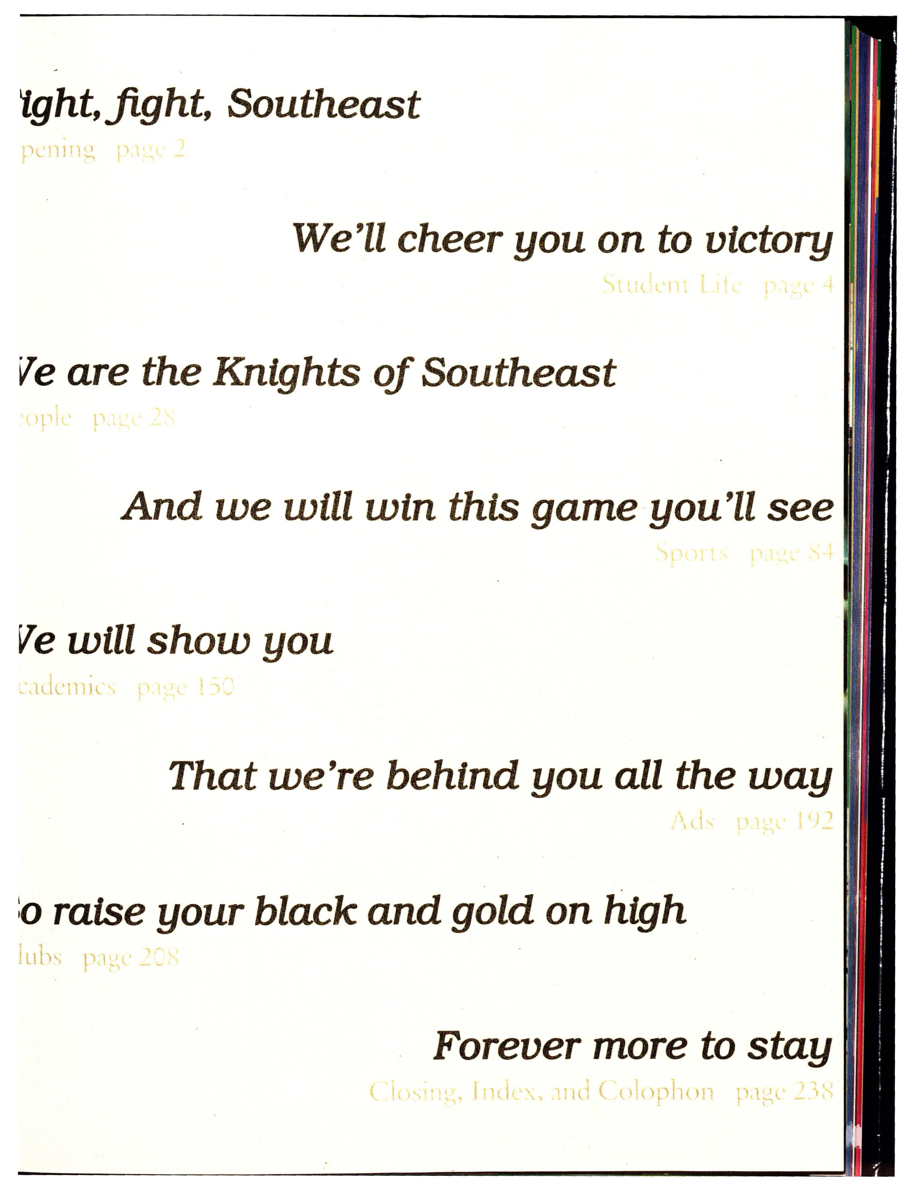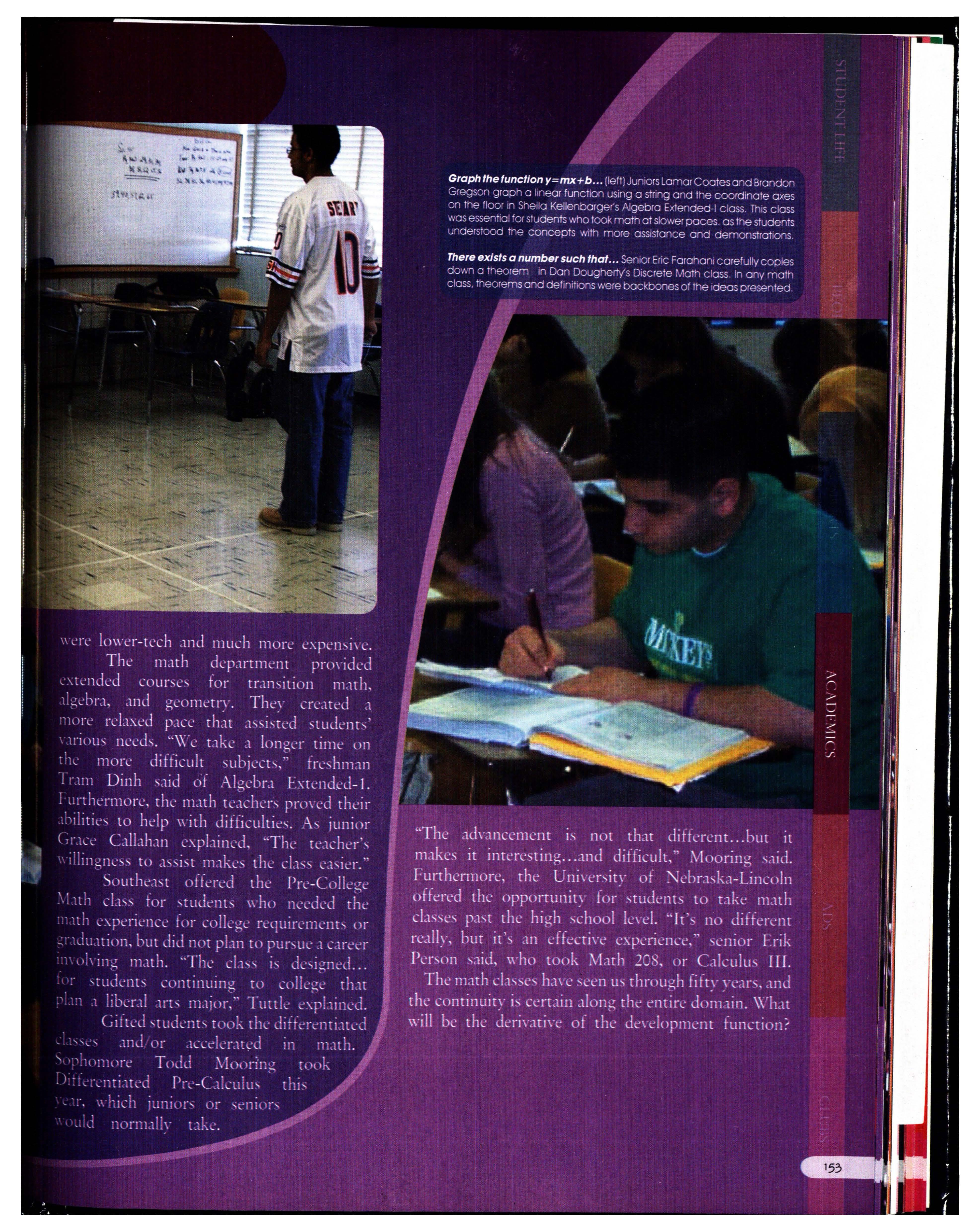 Finally, after thre e yea rs of high school, most seniors are ready to move on, as sen ior Sean Flowerday remarked, "I enjoy being able to look b~c;k on my academic career." While students work through these pr~xesses, the teachers and staff who surro und them do everything possible to provide a nurturing and po sitive learning environment. For the past fifty years, the character of Southeast ha s refused to be determined by the condition of the building. Its nature will always be a reflection of it s people