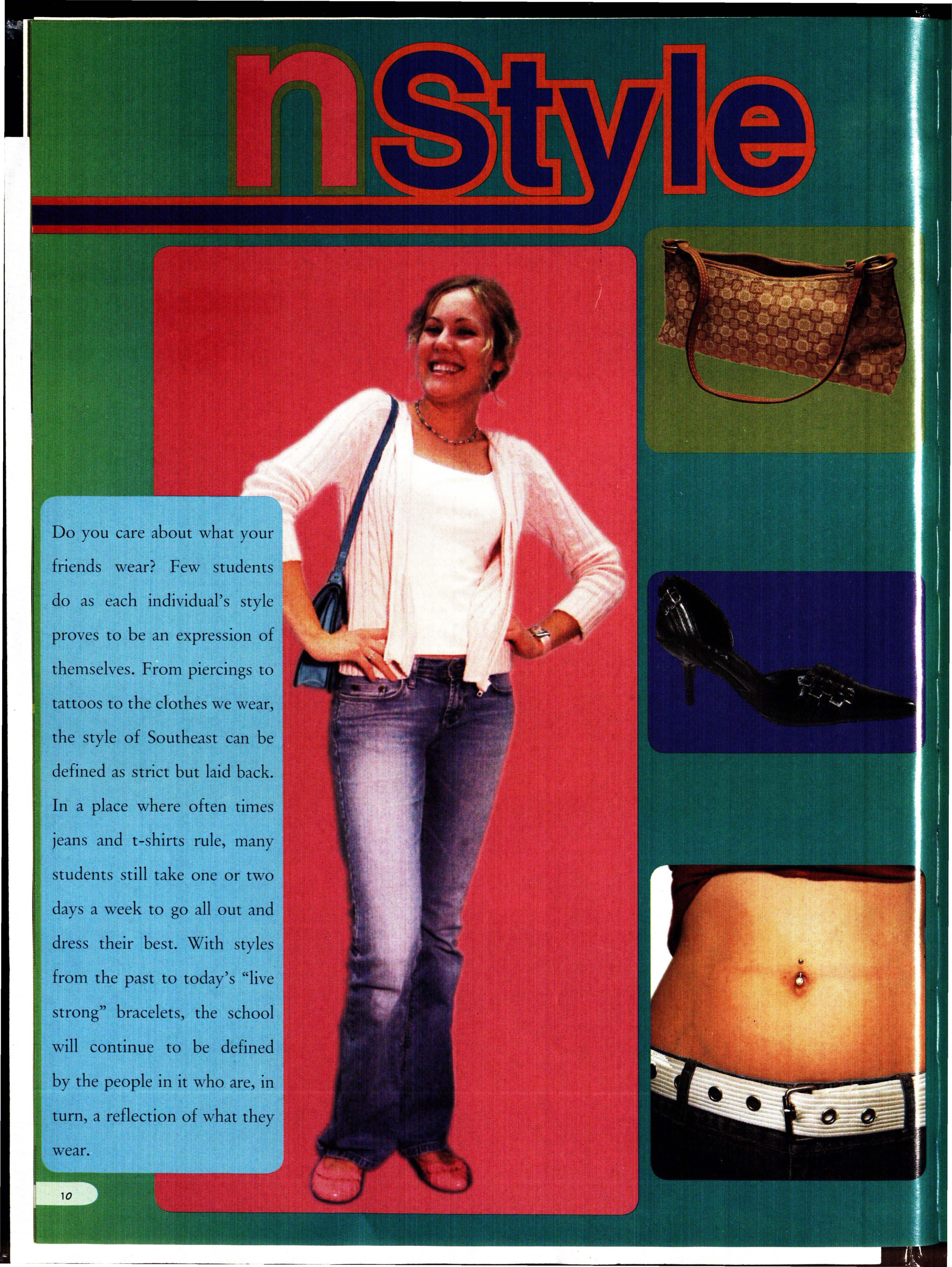 friends wear? Few students do as each individual's style proves to be an expression of themselves. From piercings to tattoos to the clothes we wear, • the style of Southeast can be defined as strict but laid back. In a place where often jeans and t-shirts rule, students still take one or two days a week to go all out and dress their best. With styles from the past to today's "live strong" bracelets, the school will continue to be defined by the people in it who are, in turn, a reflection of what they wear.