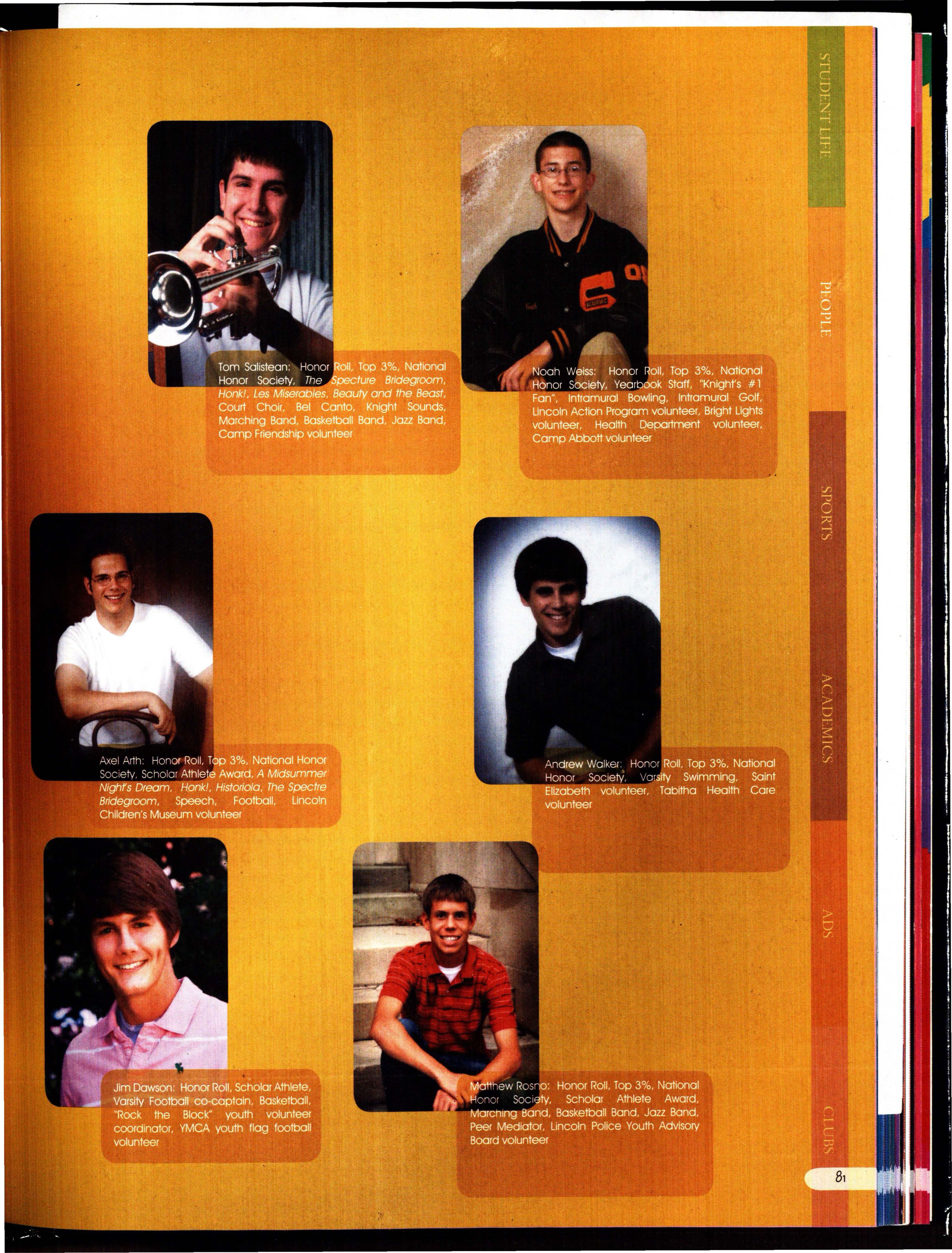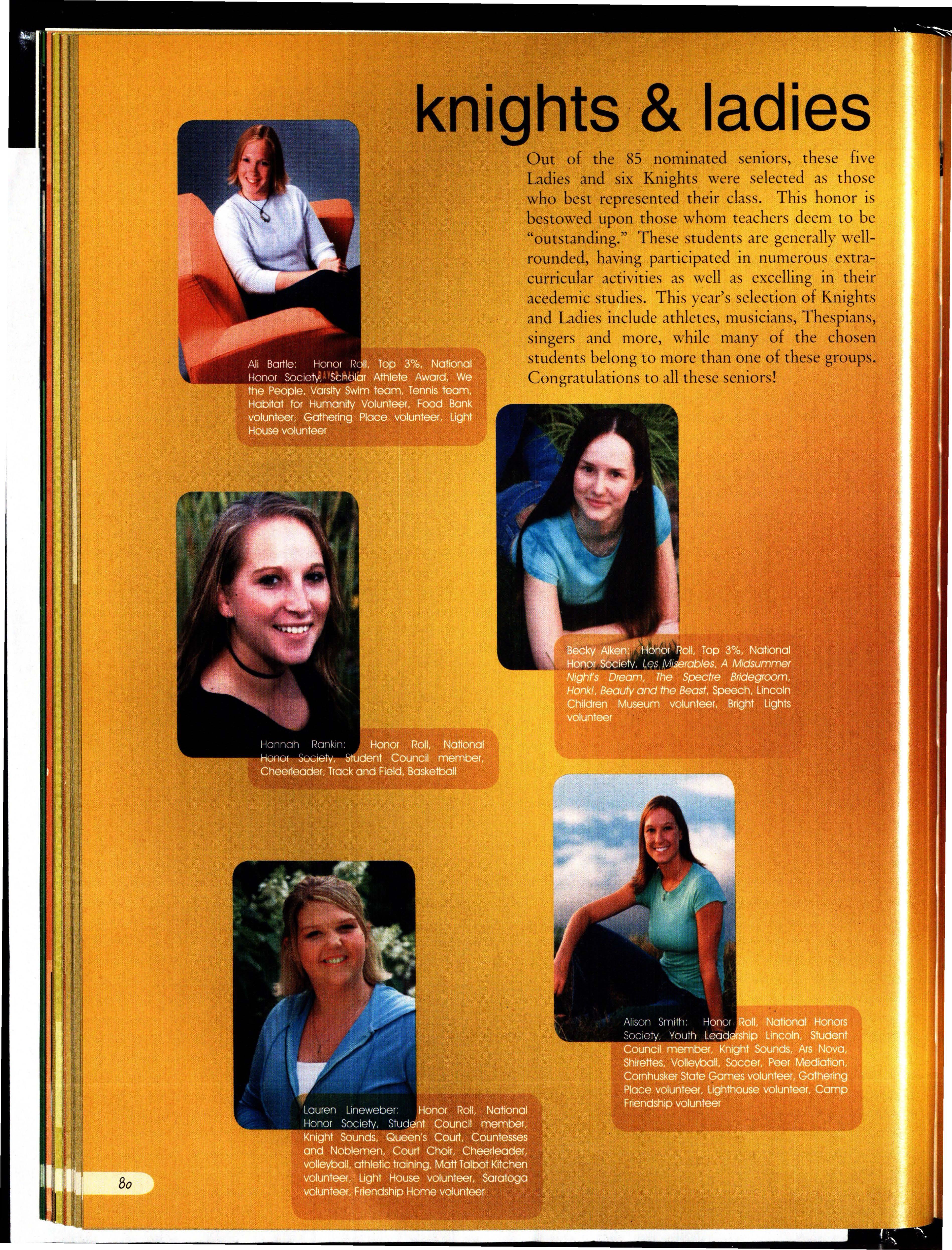 Out of the 85 nominated seniors, these five Ladies and six Knights were selected as those who best represented their class. This honor is bestowed upon those whom teachers deem to be "outstanding." These students are generally wellrounded, hav:ing participated in numerous extracurr icular activities as well as excelling in their acedemic studies This year's selection of Knights and Ladies include athletes, musicians, Thespians, singers and more, while many of the chosen students belong to more than one of these groups . Congratulations to all these seniors !
