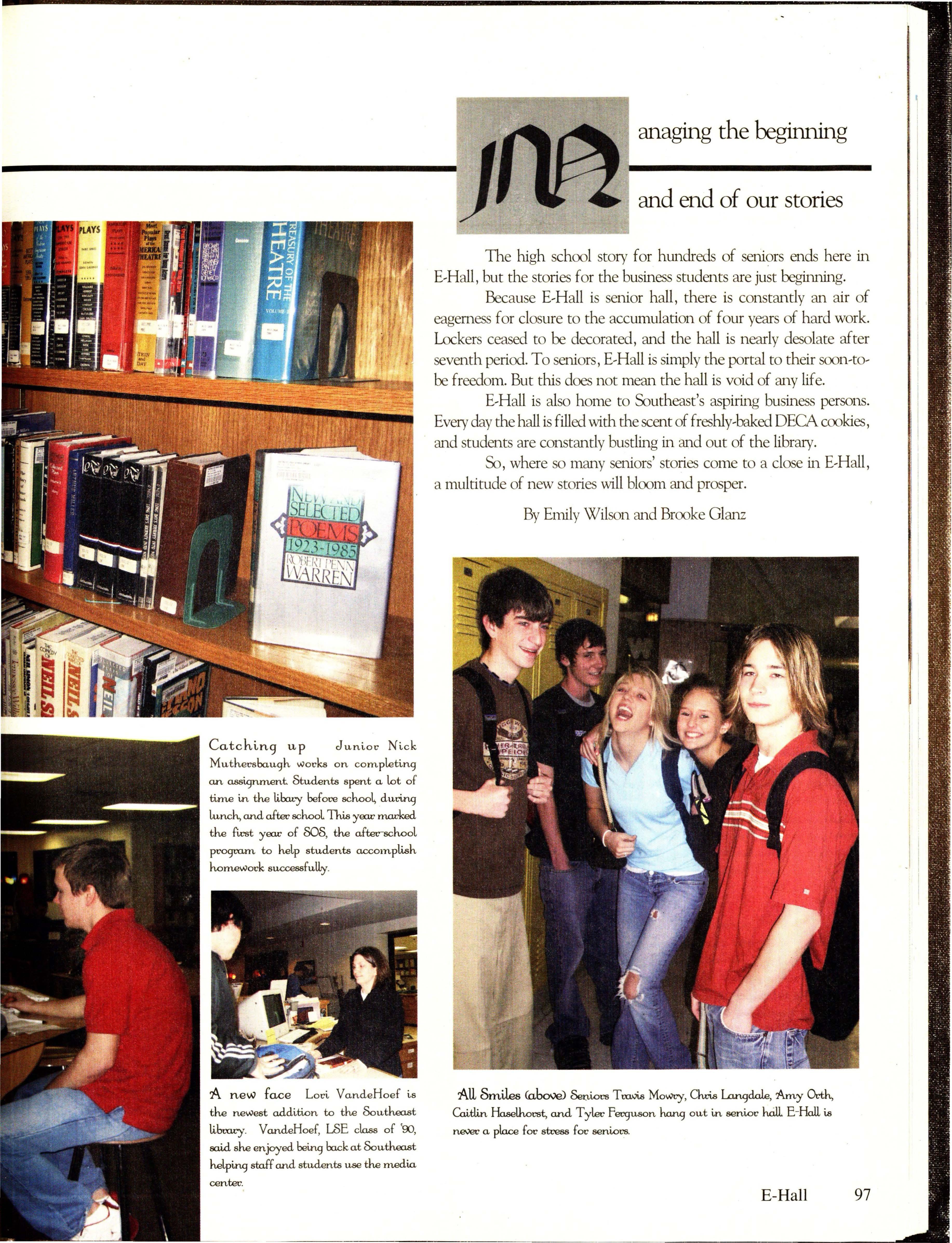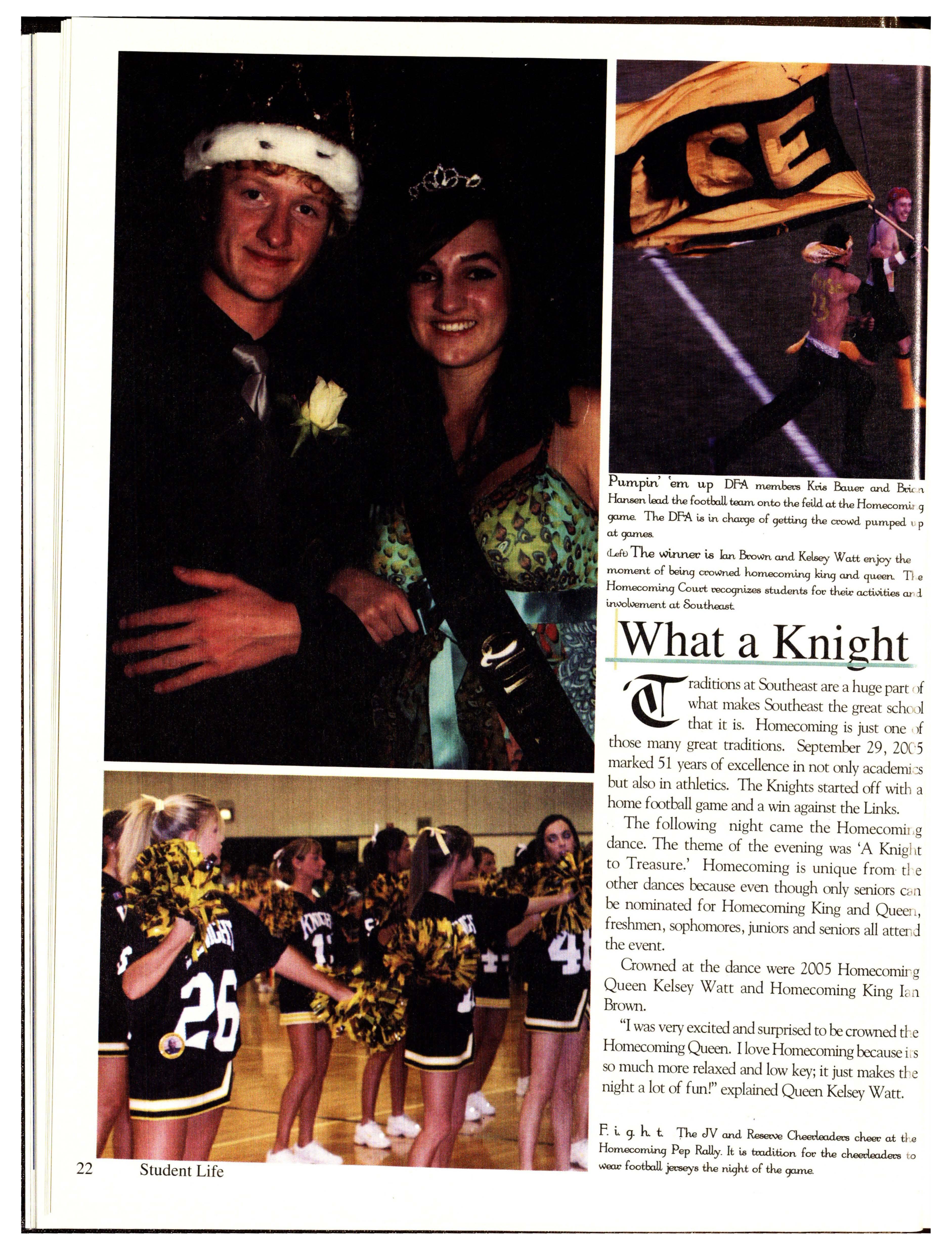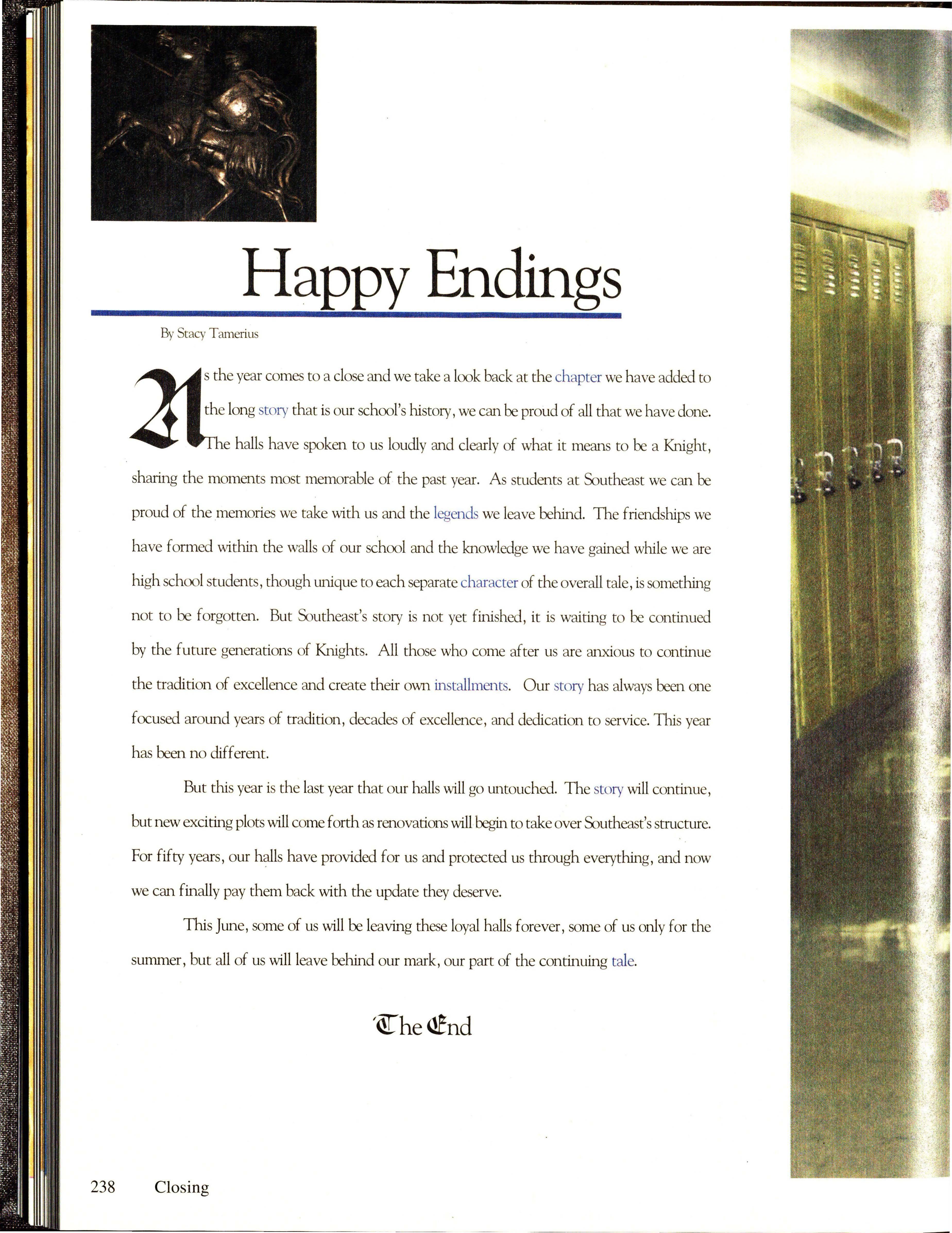 e halls have spoken to us loudly and clearly of what it means to be a Knight, sharing the moments most memorable of the past year. As students at Southeast we can be proud of the memories we take with us and the legends we leave behind. The friendships we have formed within the walls of our school and the knowledge we have gained while we are high school students, though unique to each separate character of the overall tale, is something not to be forgotten. But Southeast's story is not yet finished, it is waiting to be continued by the future generations of Knights. All those who come after us are anxious to continue the tradition of excellence and create their own installments . Our story has always been one focused around years of tradition, decades of excellence, and dedication to service. This year has been no different.