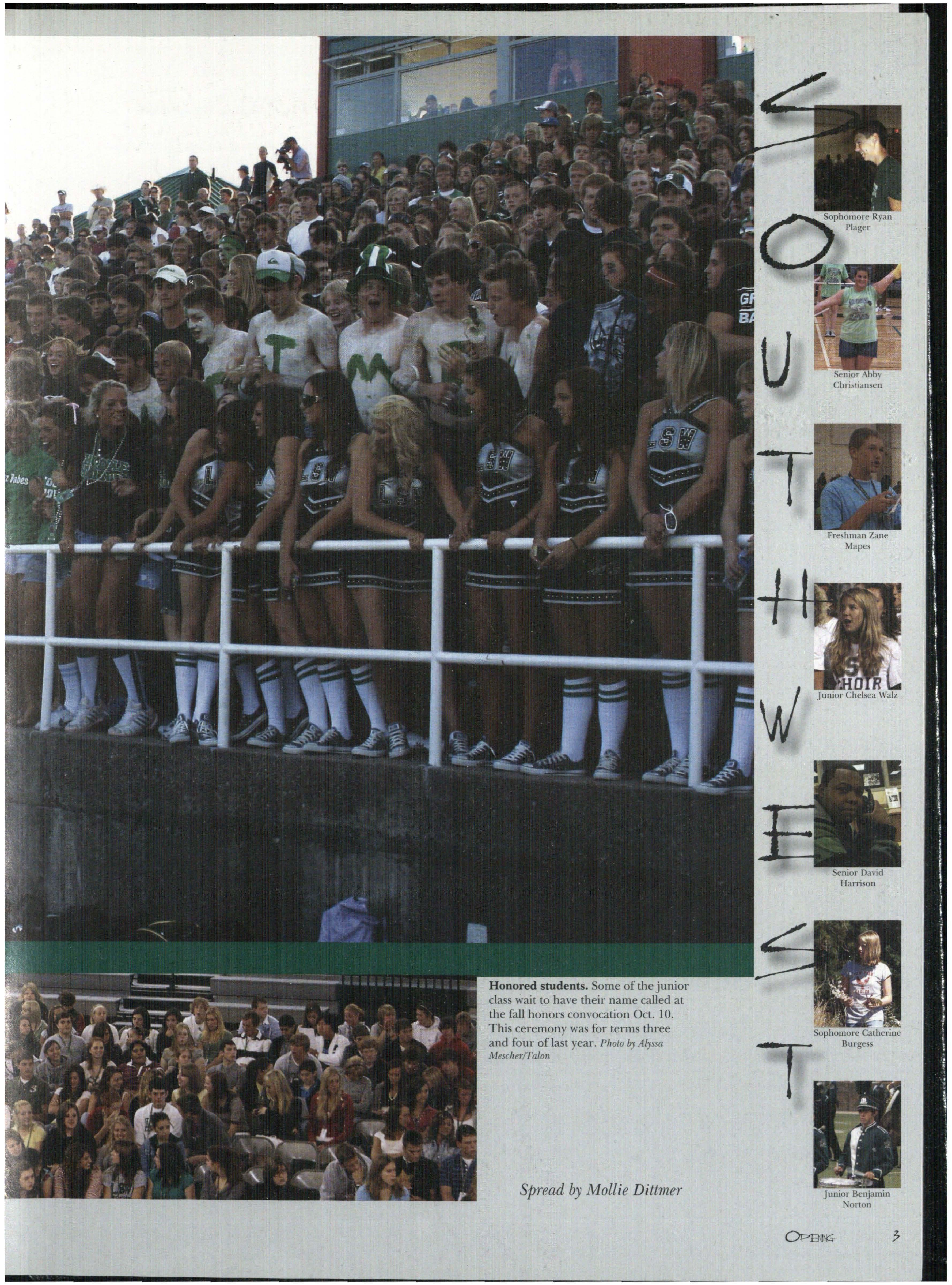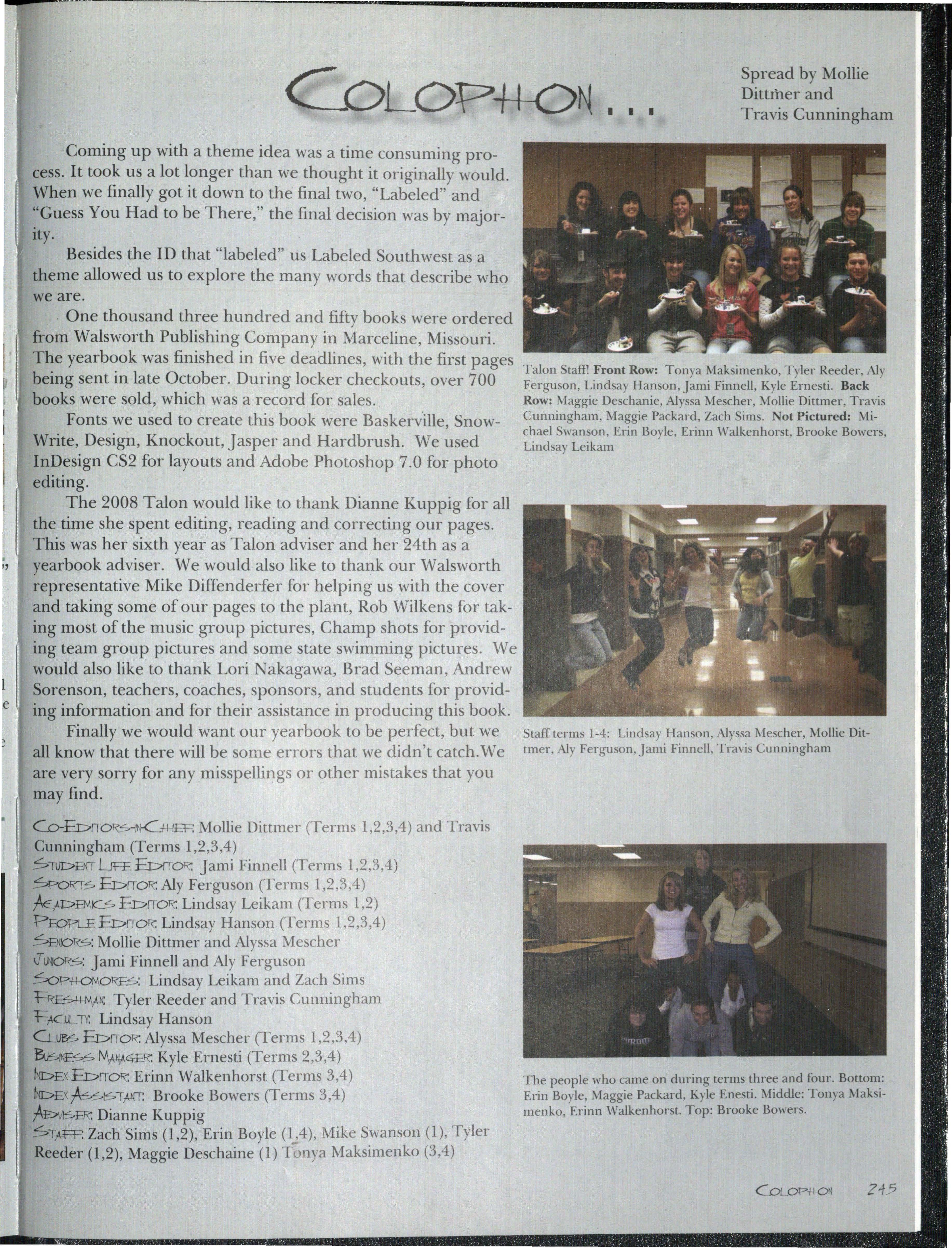 The 2008 Talon would like to thank Dianne Kuppig for all the time she spent editing, reading and correcting our pages. This was her sixth year as Talon adviser and her 24th as a yearbook adviser. We would also like to thank our Walsworth representative Mike Diffenderfer for helping us with the cover and taking some of our pages to the plant, Rob Wilkens for taking most of the music group pictures, Champ shots for providing team group pictures and some state swimming pictures. We would also like to thank Lori Nakagawa, Brad Seeman, Andrew Sorenson , teachers, coaches, sponsors, and students for providing information and for their assistance in producing this book.