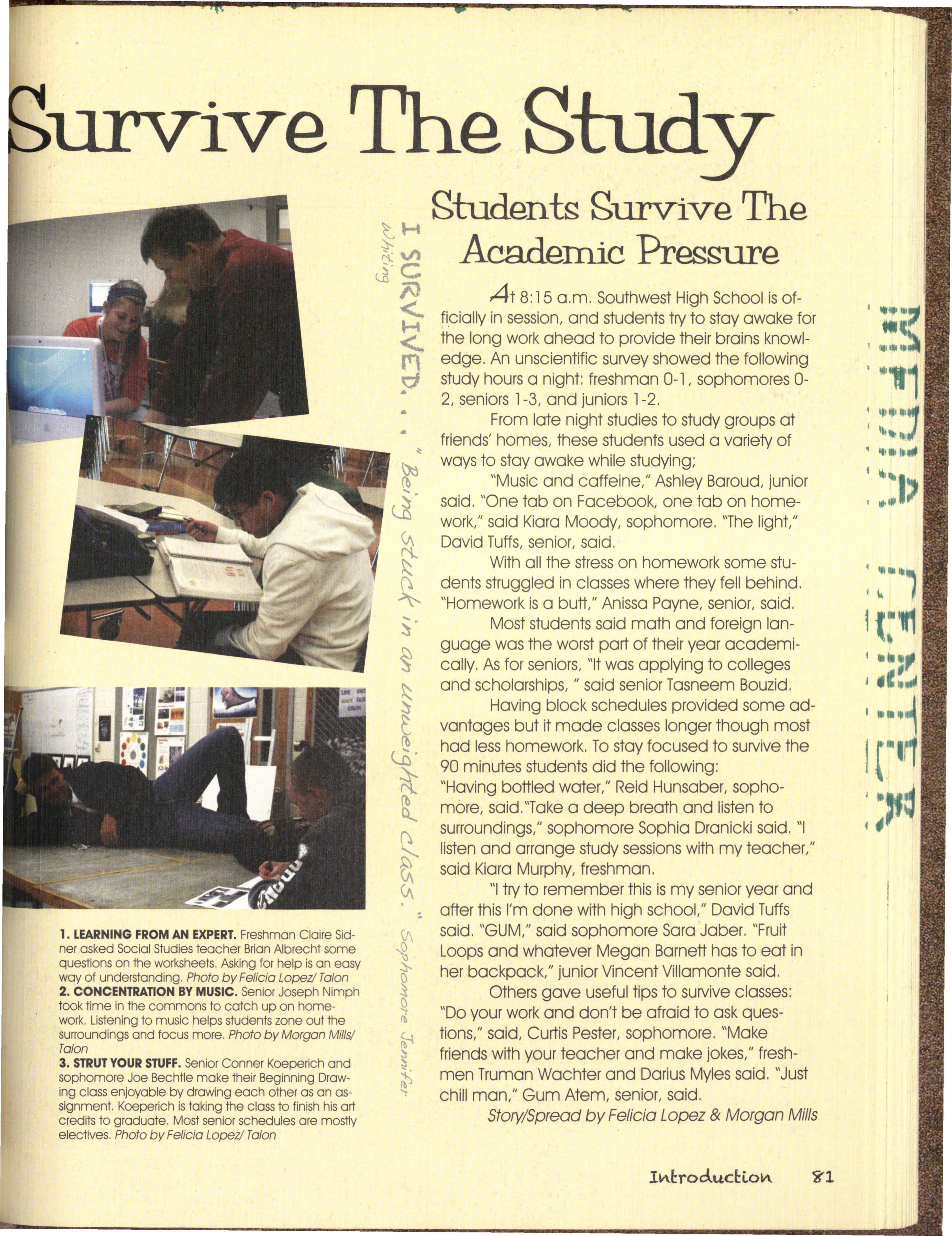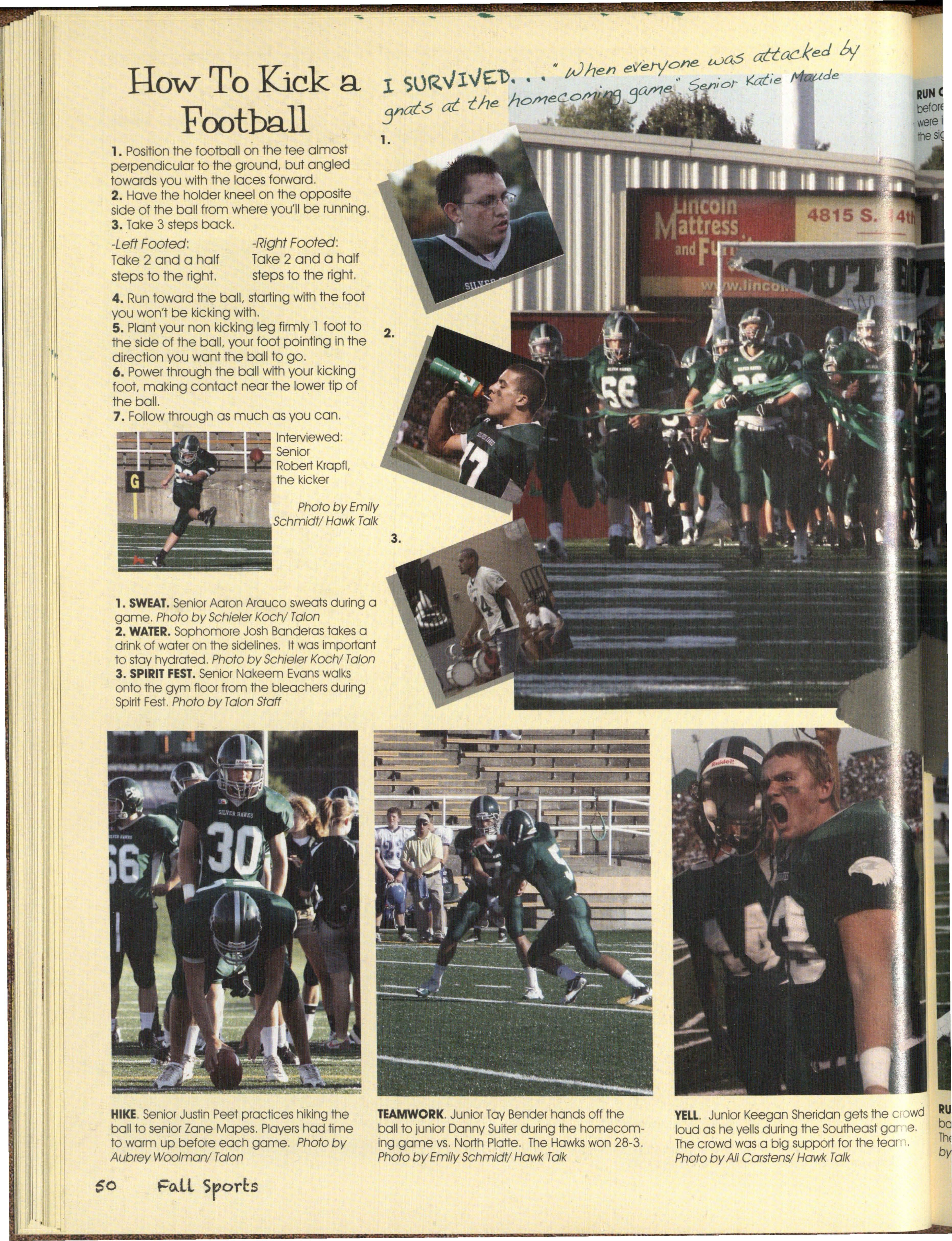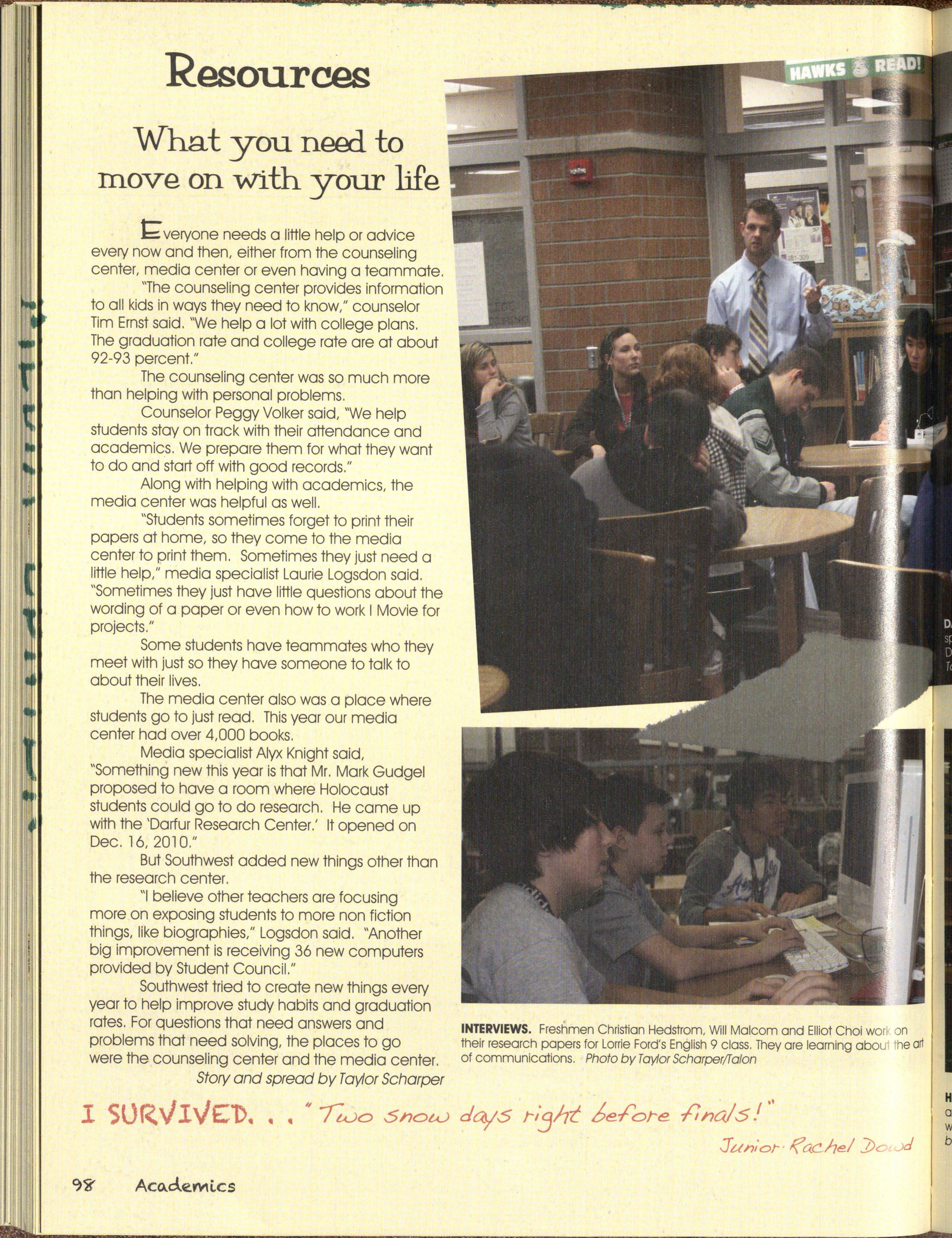 Also Hawks out witted our classes, by studying This book is about the past, present an<;t·· • long and hard on nights before tests, and even future of the Silver Hawks, from what we havei:>een ~: sometimes our own teachers, by texting in class and through , to where we are now, to what is ah:1CJ~J getting a'f:/ay. with it, qr sneaking out for lunch as an of us. The Hawks give advice on how to survive undercJossman withoul getting caught. years to come and- what we have gone through to ,. /we all oatlivedJhe school year, as we all suNive this year.