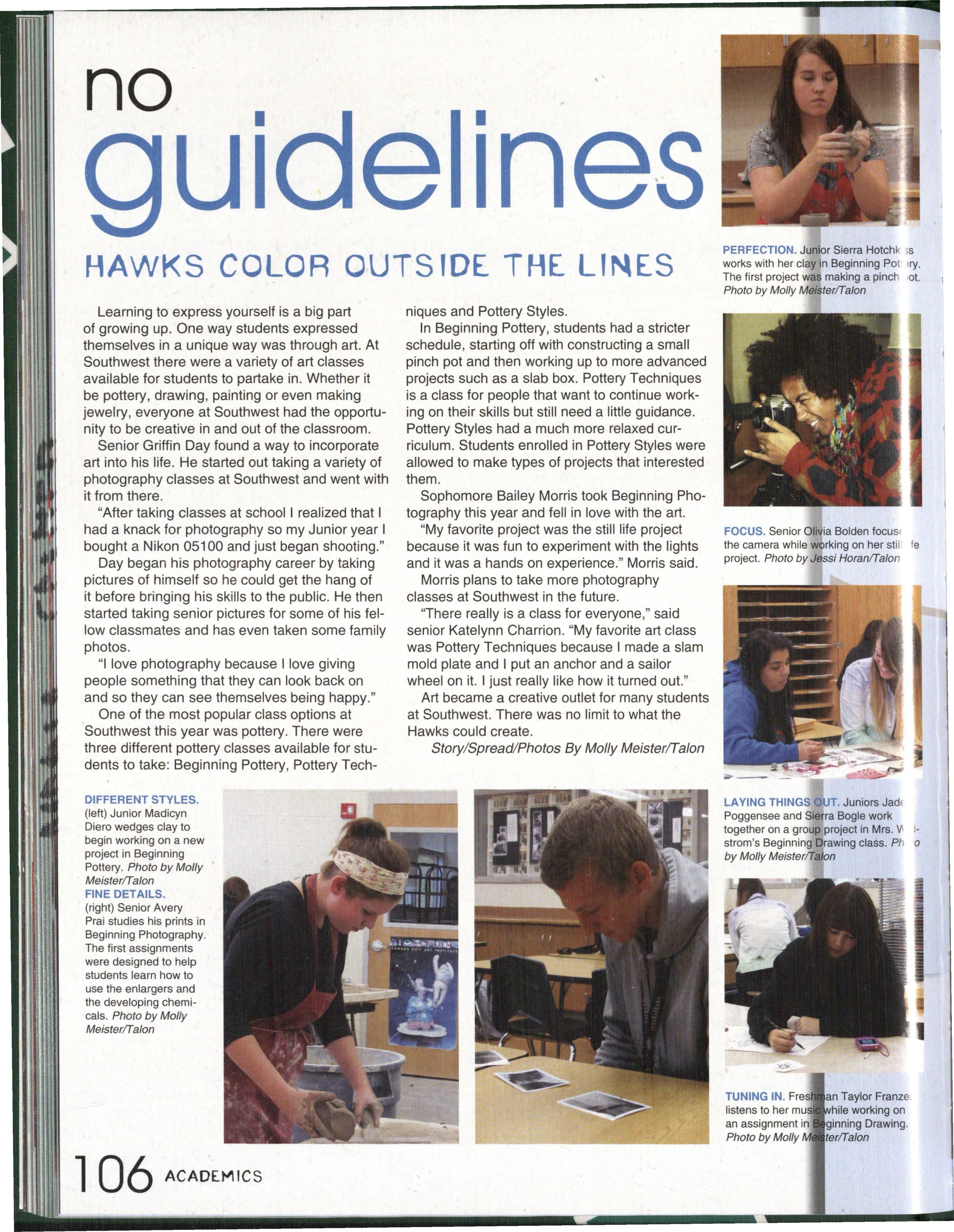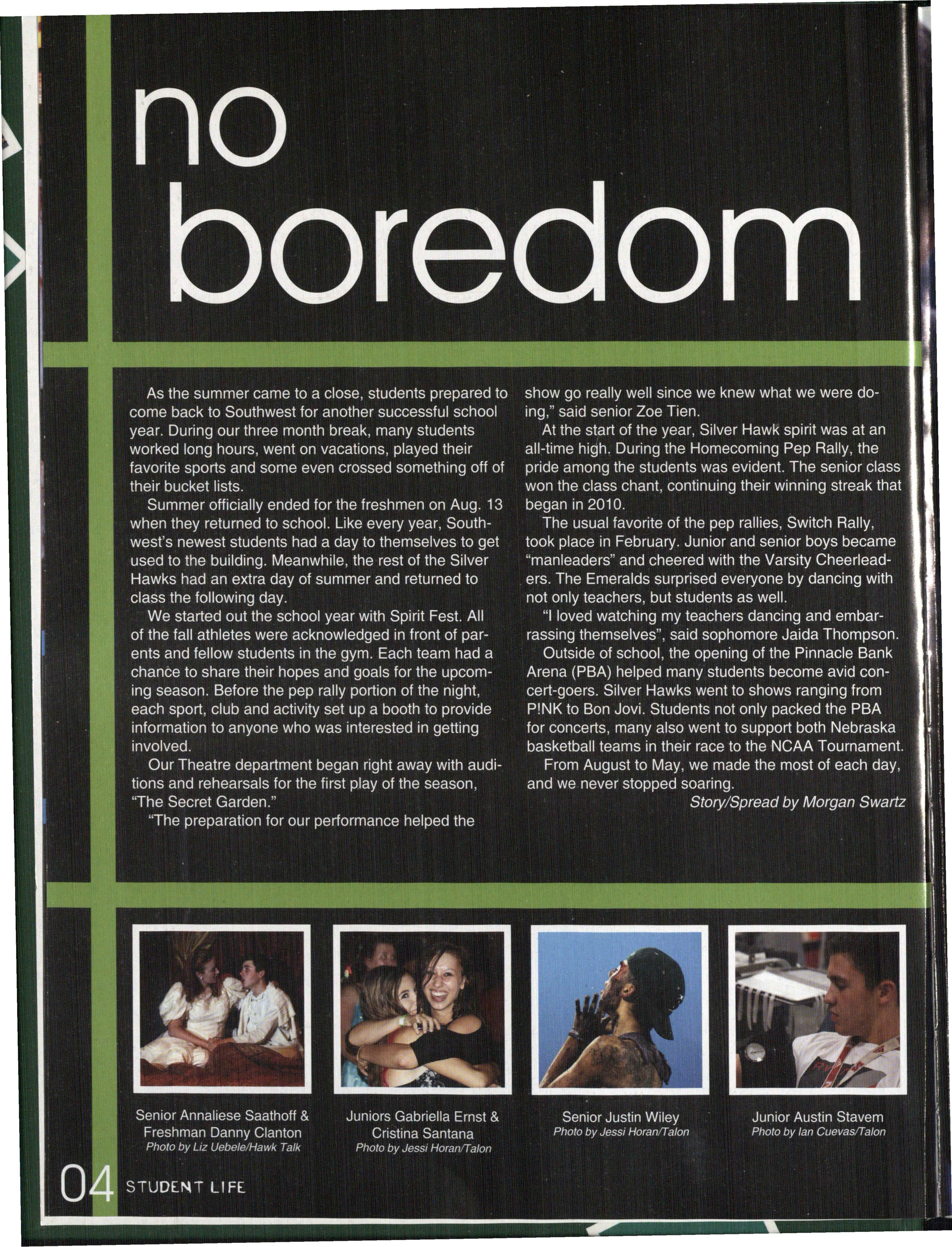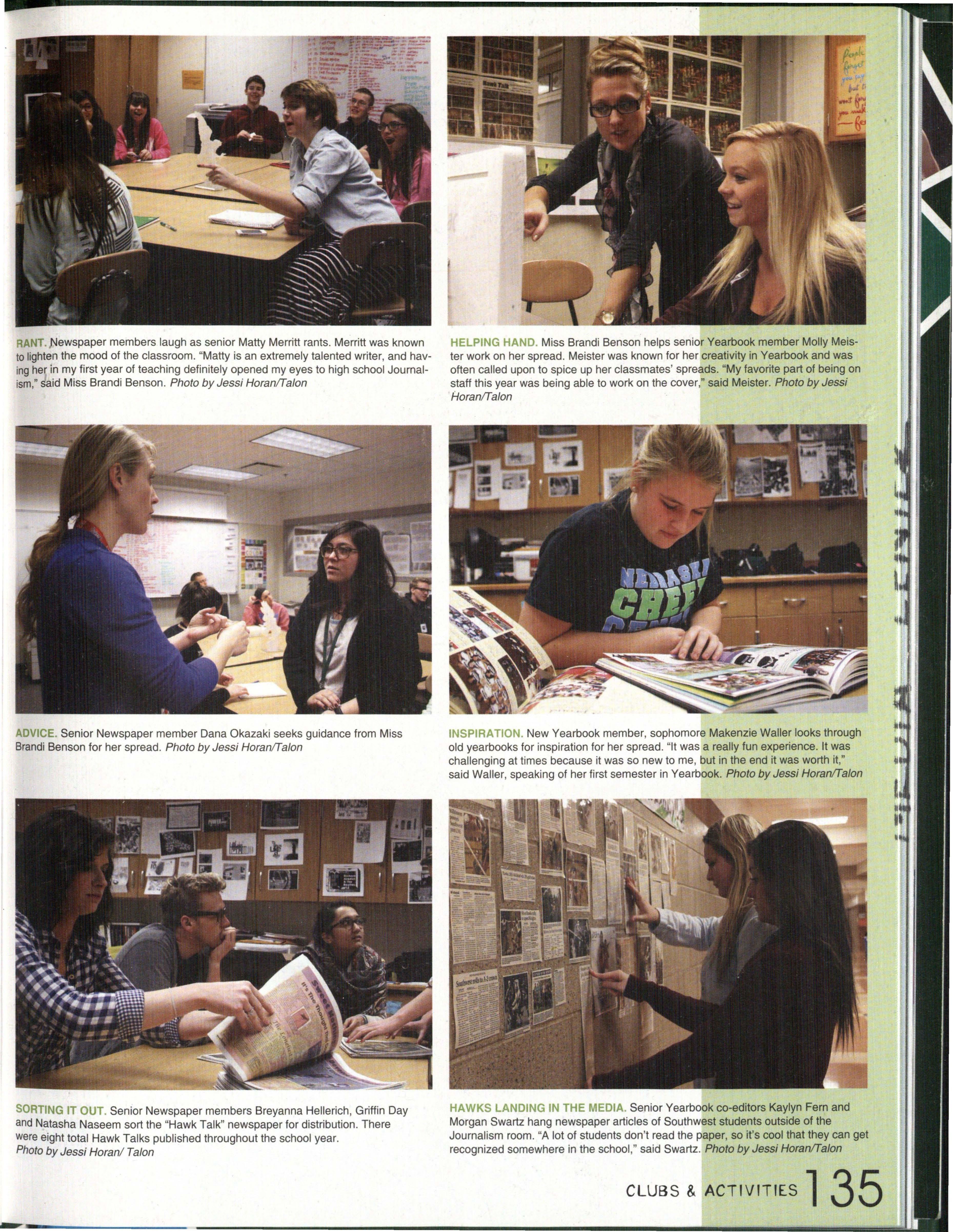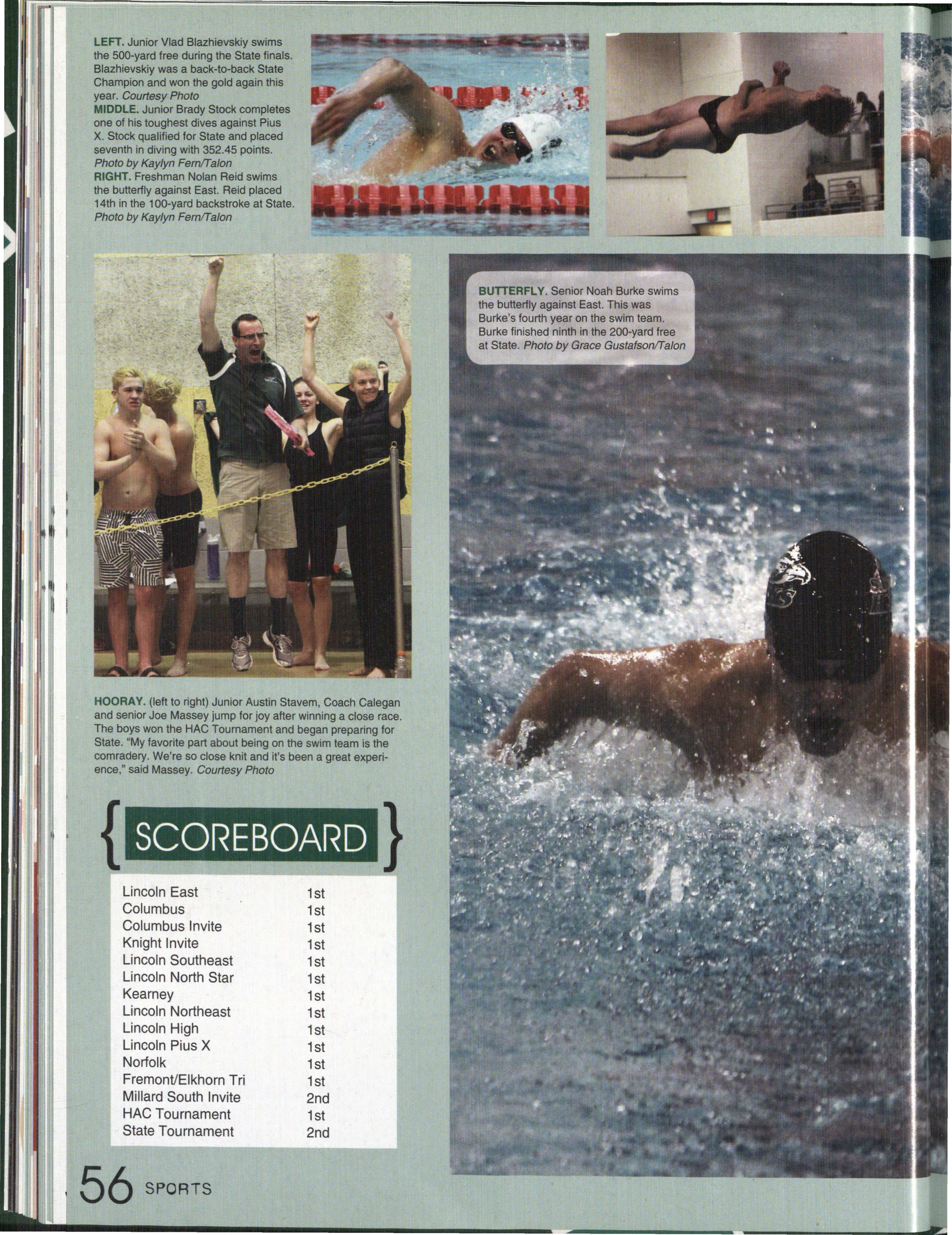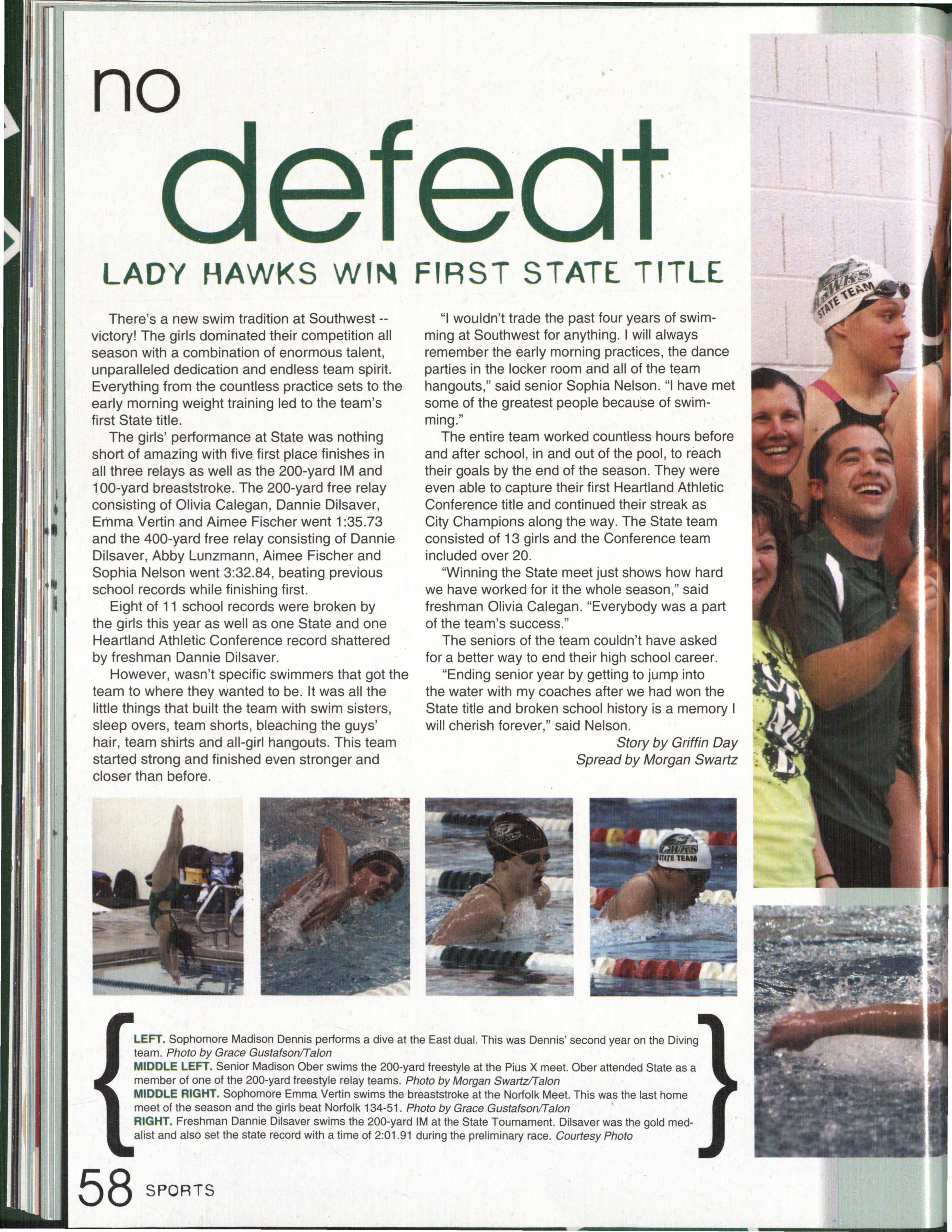 Photo by Jessi Horan/Talon MAKING WAVEc,, Junior Mitchell Charron swims the butterfly at the first swim meet of the season against Lincoln East. Southwest won the meet 103-80 . Photo by Grace Gustafson/Talon FINDING MISSINu PIEr r'" Senior Baleigh Miller works to construct muscles on her " maniken " for Differentiated Anatomy