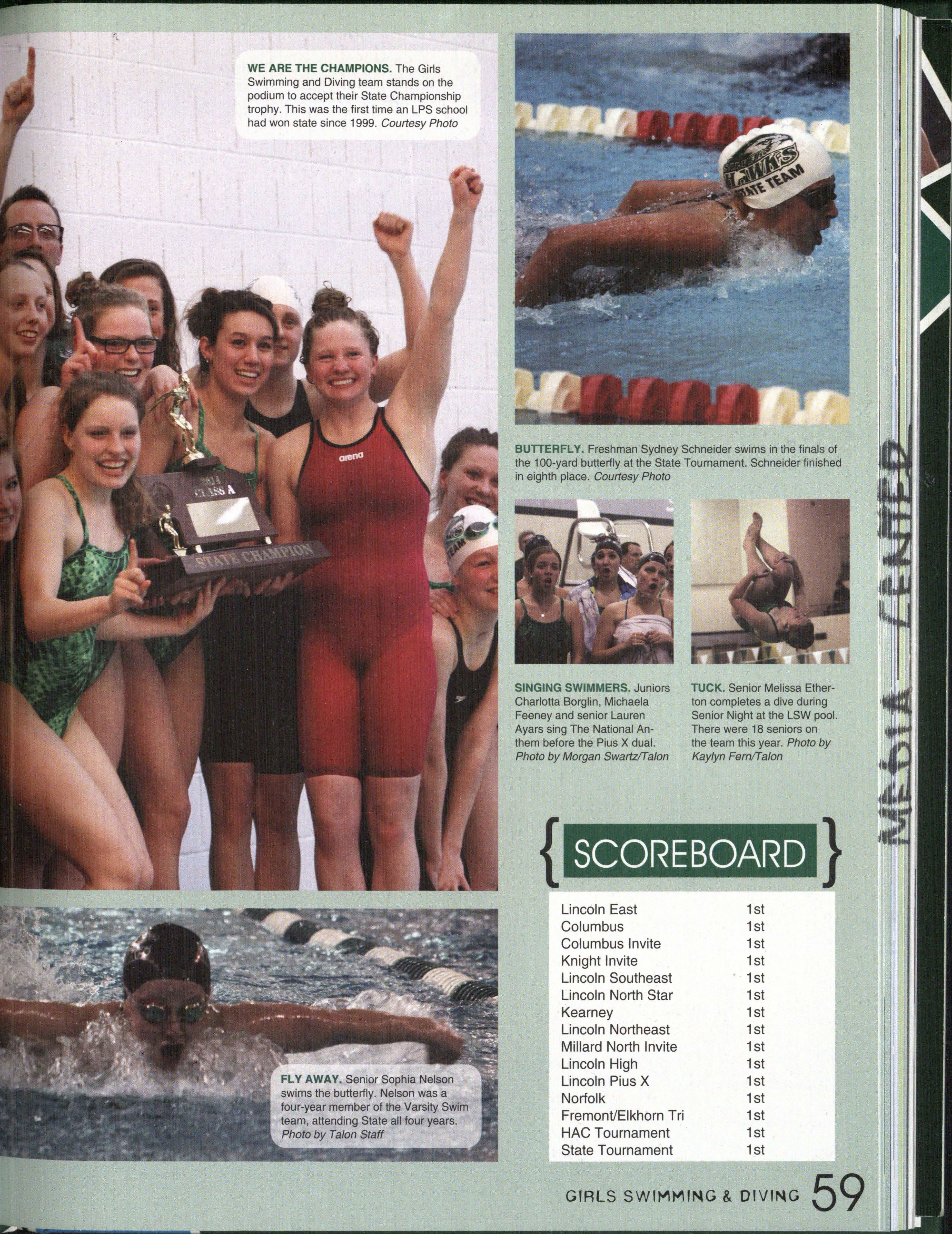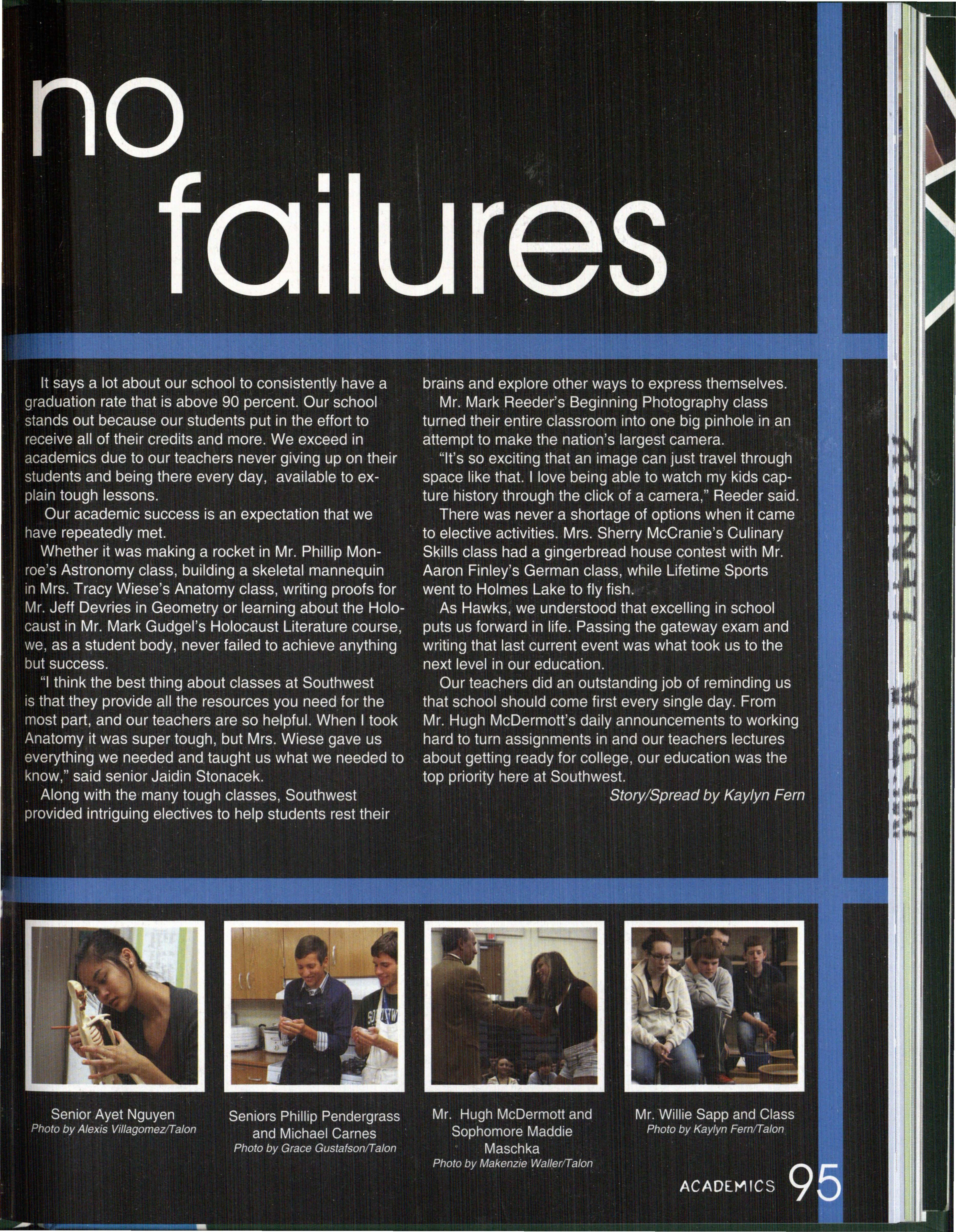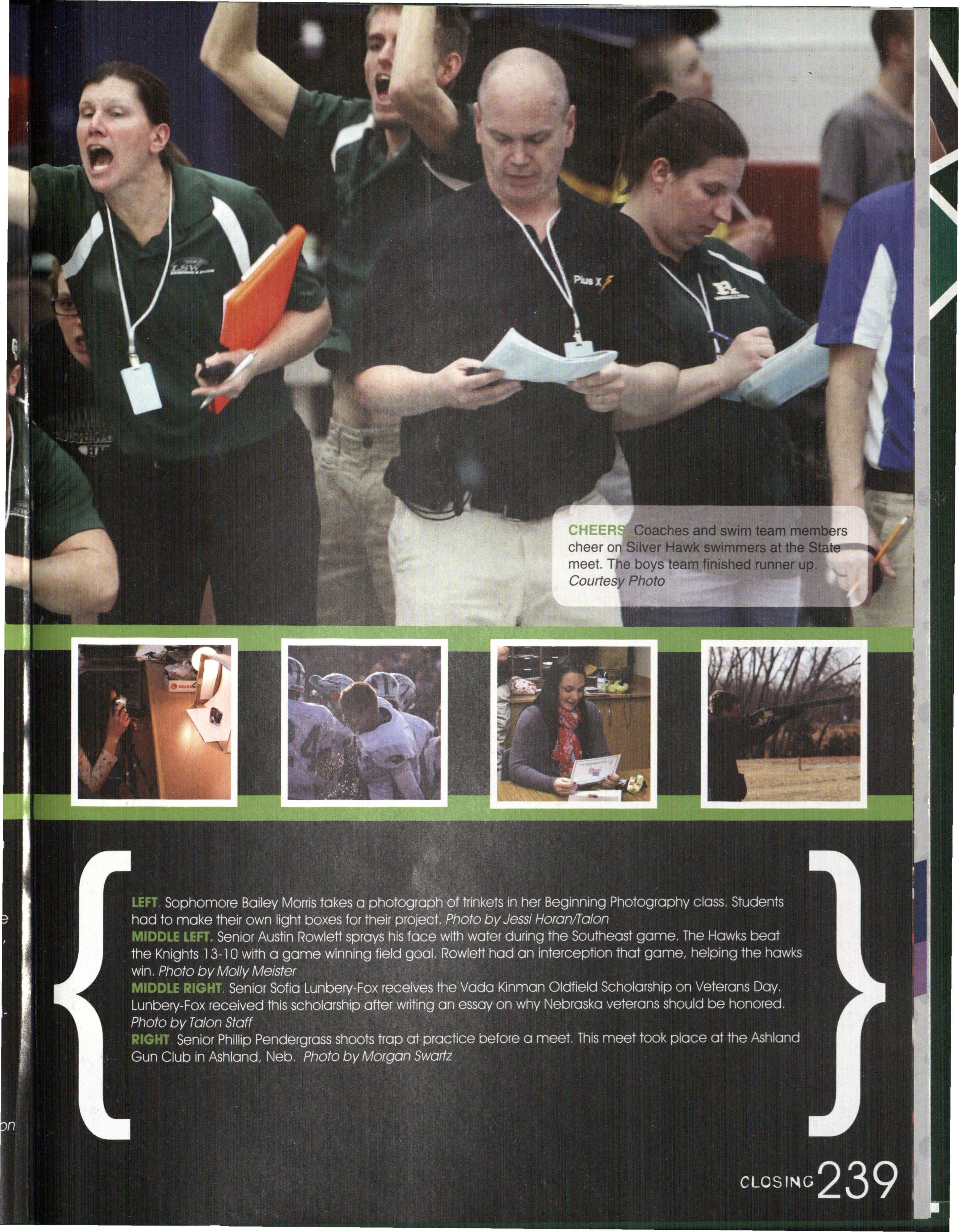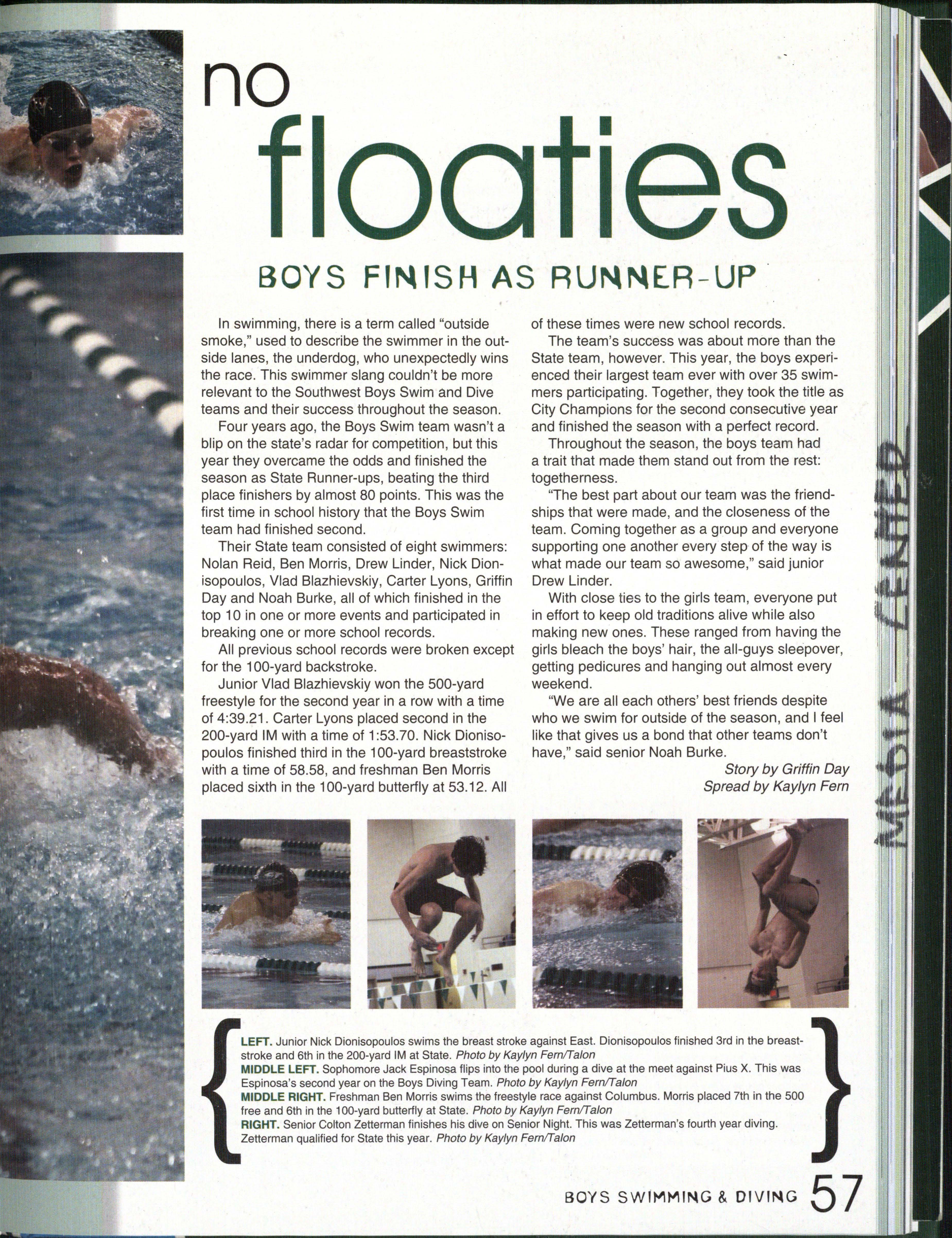 Photo by Jessi Horan/Talon MAKING WAVEc,, Junior Mitchell Charron swims the butterfly at the first swim meet of the season against Lincoln East. Southwest won the meet 103-80 . Photo by Grace Gustafson/Talon FINDING MISSINu PIEr r'" Senior Baleigh Miller works to construct muscles on her " maniken " for Differentiated Anatomy