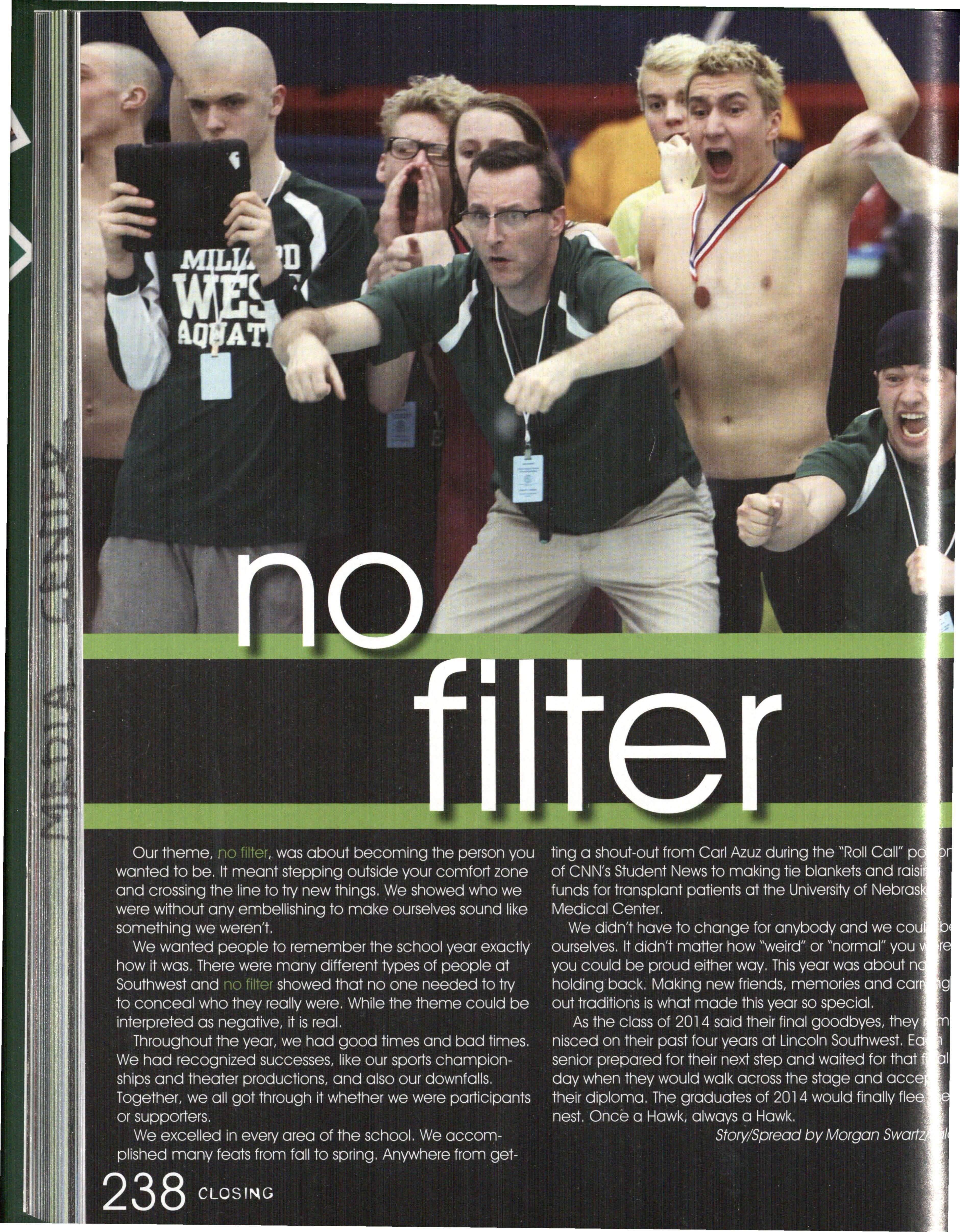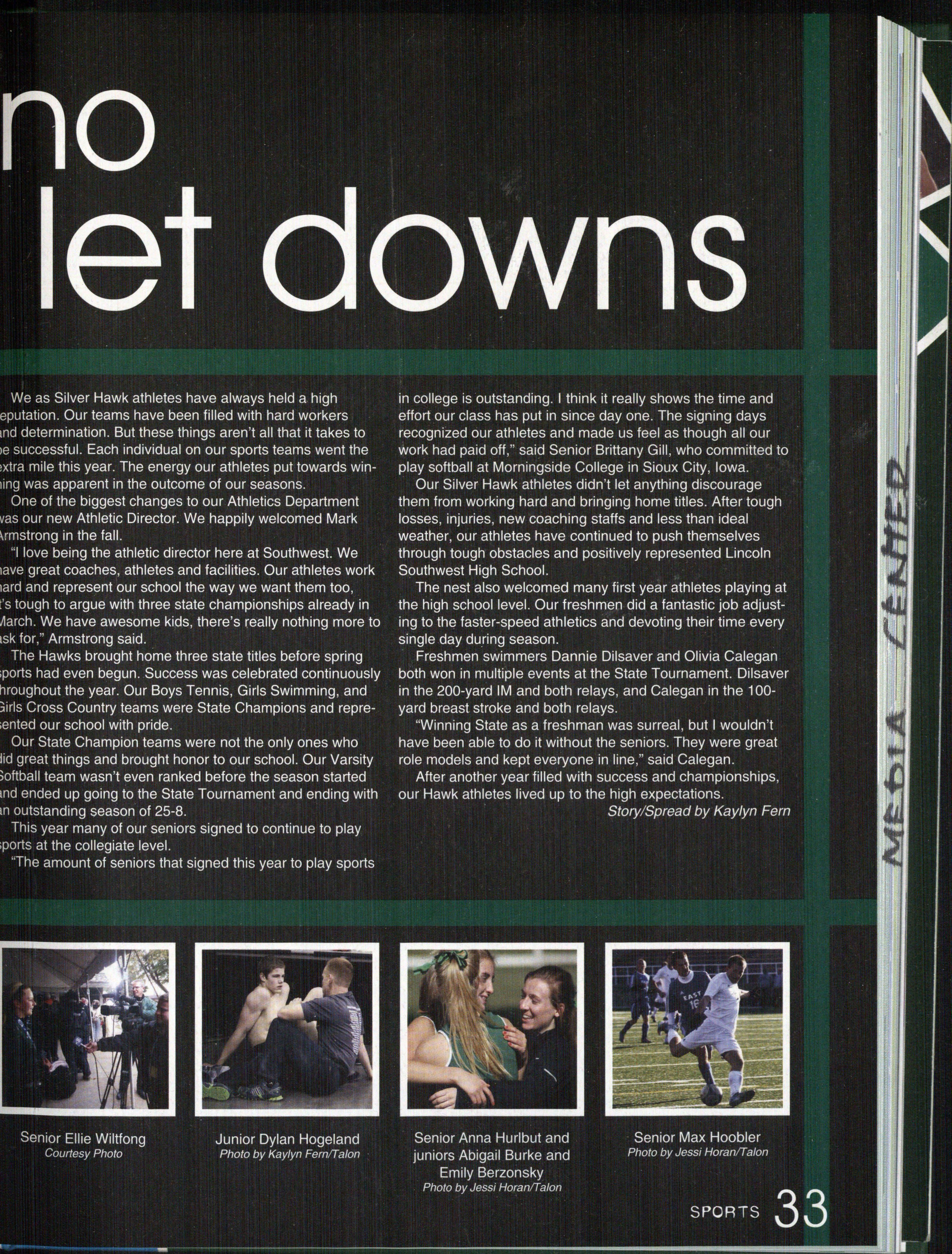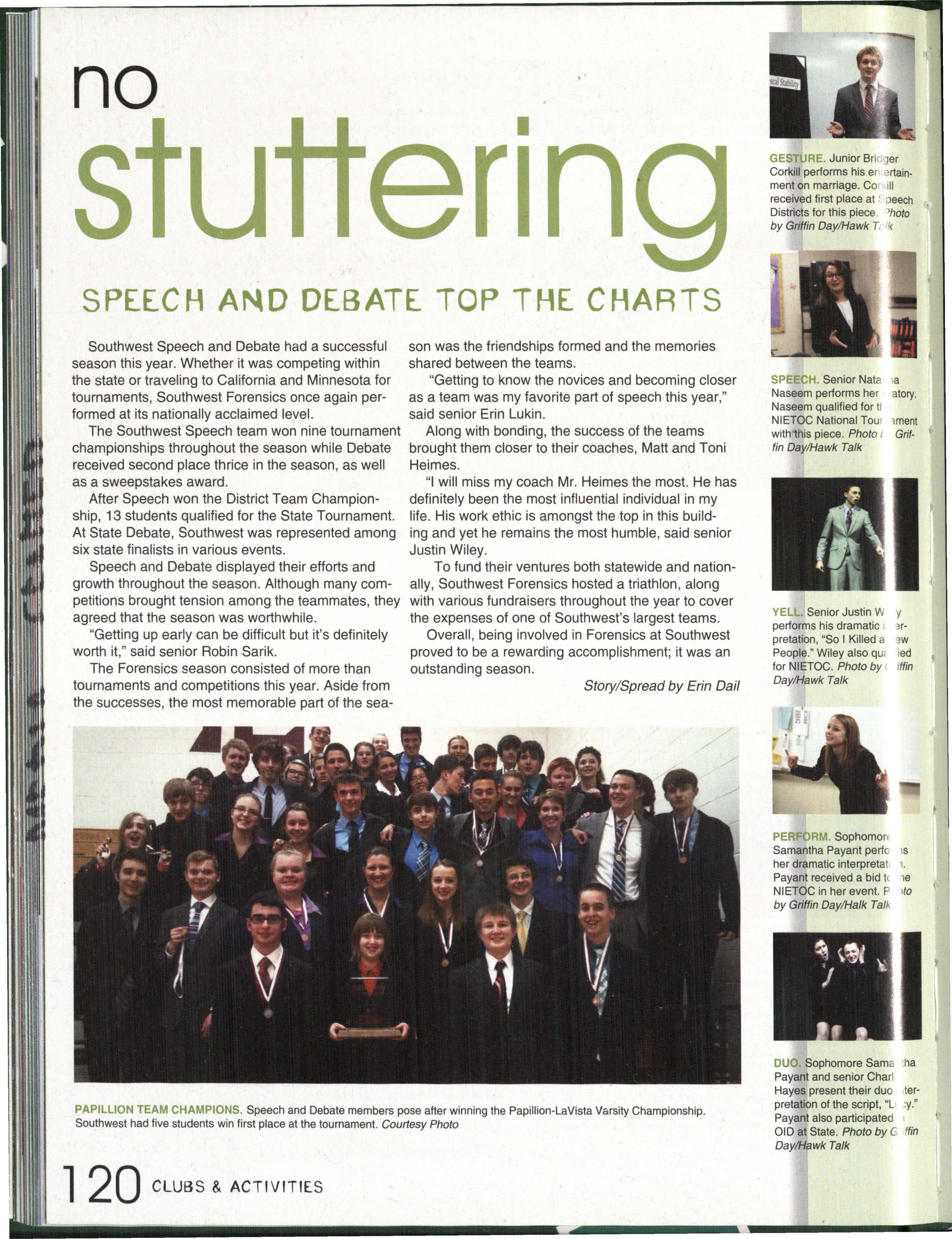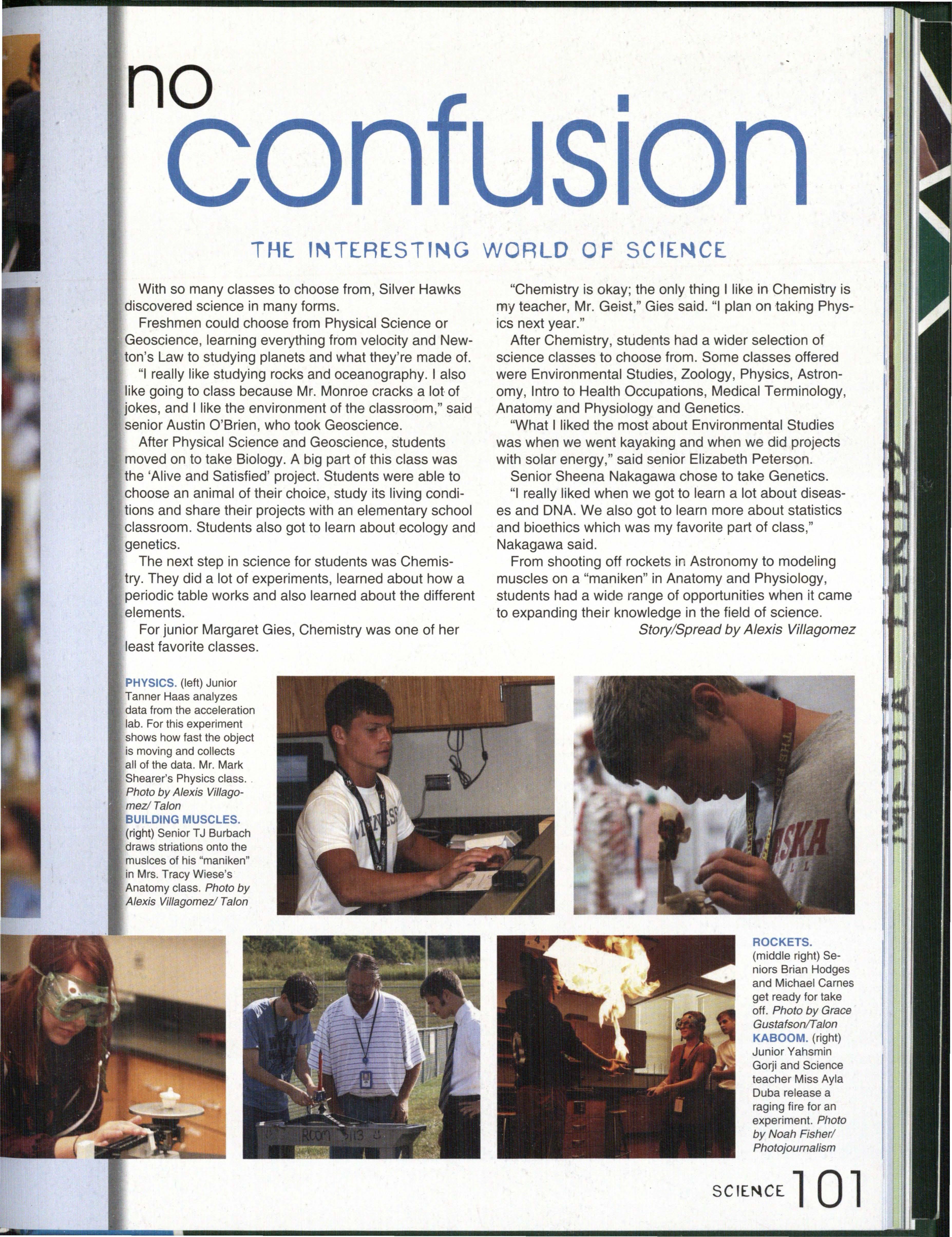 Photo by Jessi Horan/Talon MAKING WAVEc,, Junior Mitchell Charron swims the butterfly at the first swim meet of the season against Lincoln East. Southwest won the meet 103-80 . Photo by Grace Gustafson/Talon FINDING MISSINu PIEr r'" Senior Baleigh Miller works to construct muscles on her " maniken " for Differentiated Anatomy