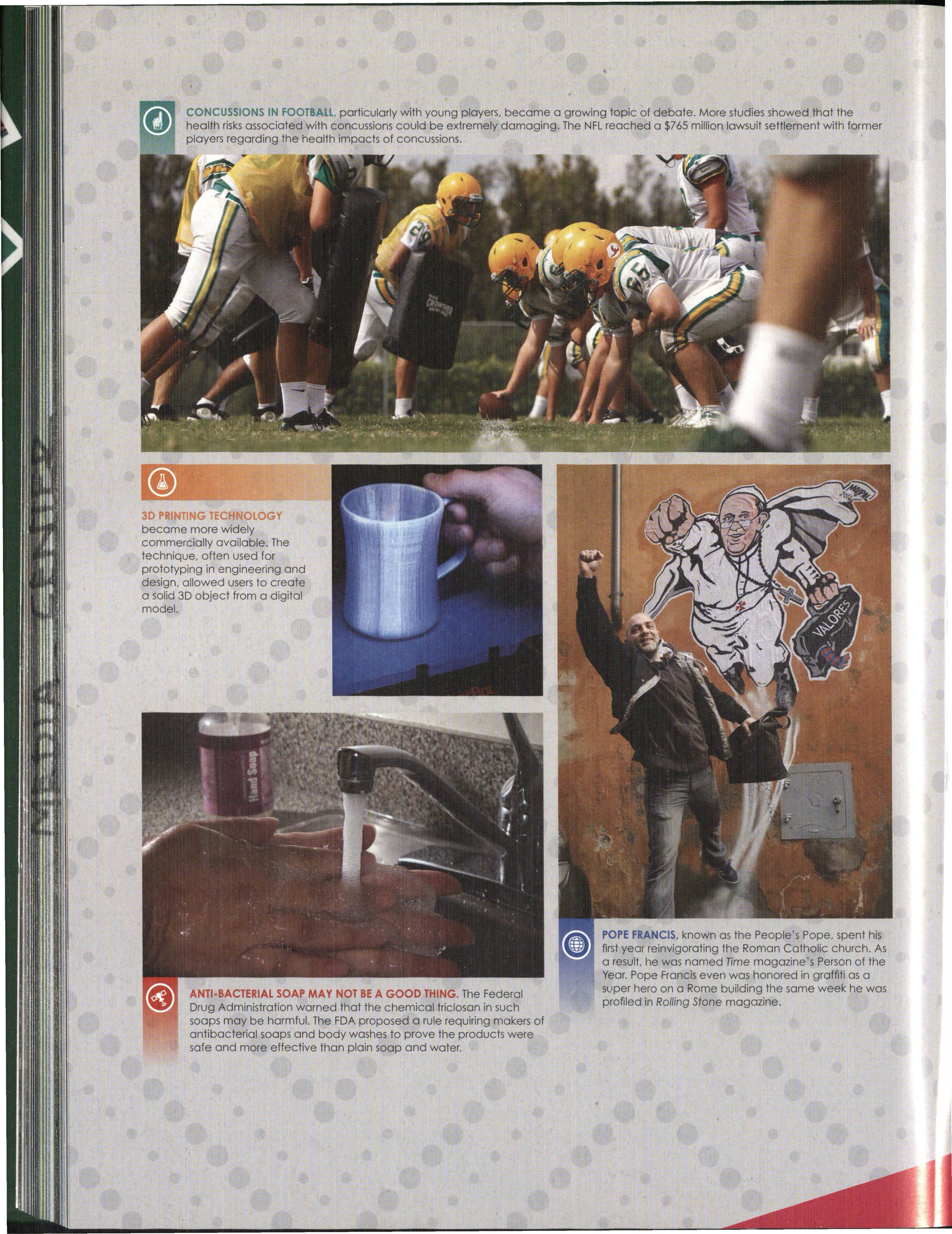 CONCUSSIONS IN FOOTBALL, particularly with young players, became a growing topic of debate. More studies showed that the health risks associated with concussions could be extremely damaging. The NFL reached a $765 million lawsuit settlement with former players regarding the health impacts of concussions.