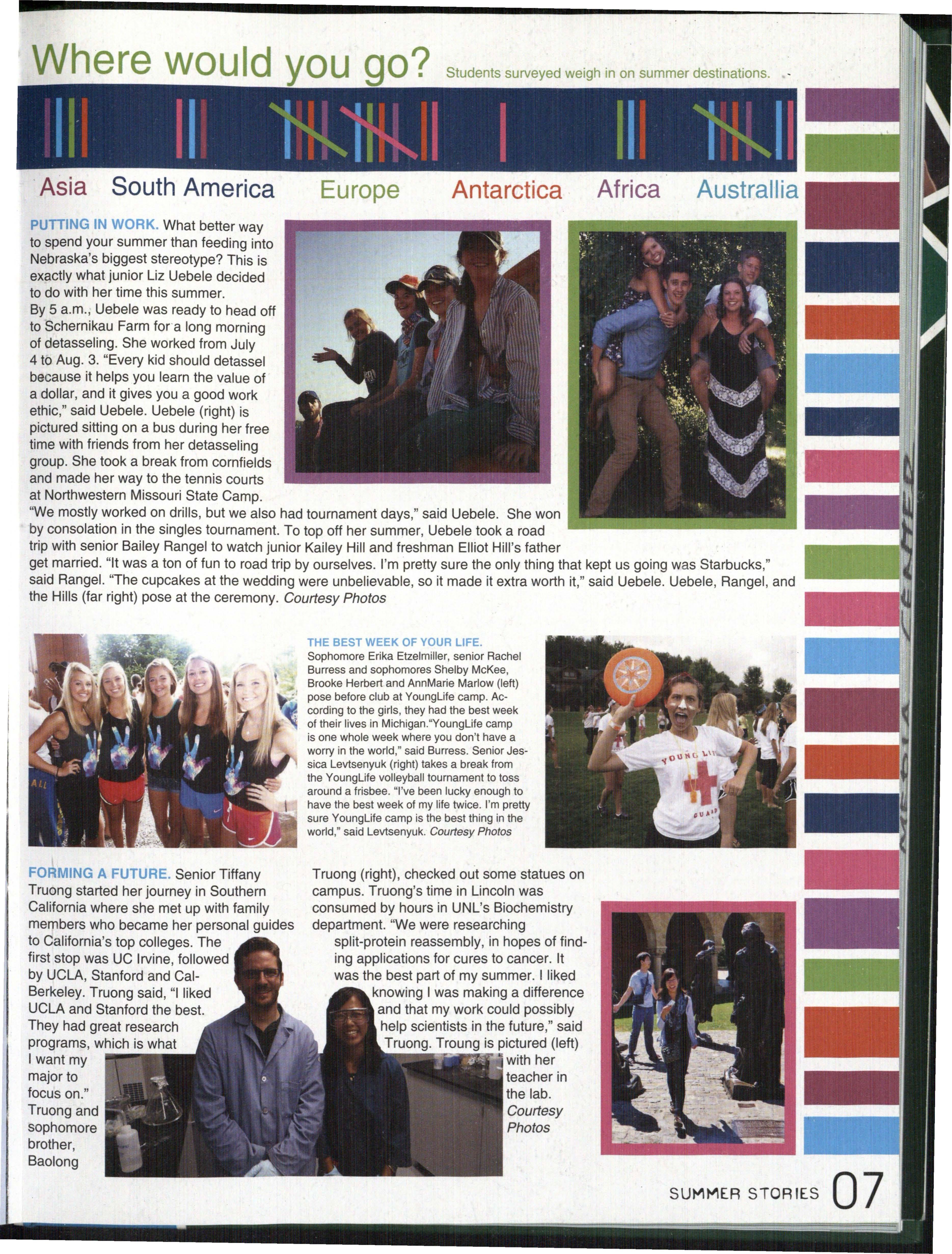 PUTTING IN WORK. What better way to spend your summer than feeding into Nebraska's biggest stereotype? This is exactly what junior Liz Uebele decided to do with her time this summer. By 5 a.m.; Uebele was ready to head off to Schernikau Farm for a long morning of detasseling. She worked from July 4 to Aug. 3. "Every kid should detassel because it helps you learn the value of a dollar, and it gives you a good work ethic," said Uebele. Uebele (right) is pictured sitting on a bus during her free time with friends from her detasseling group. She took a break from cornfields and made her way to the tennis courts at Northwestern Missouri State Camp.