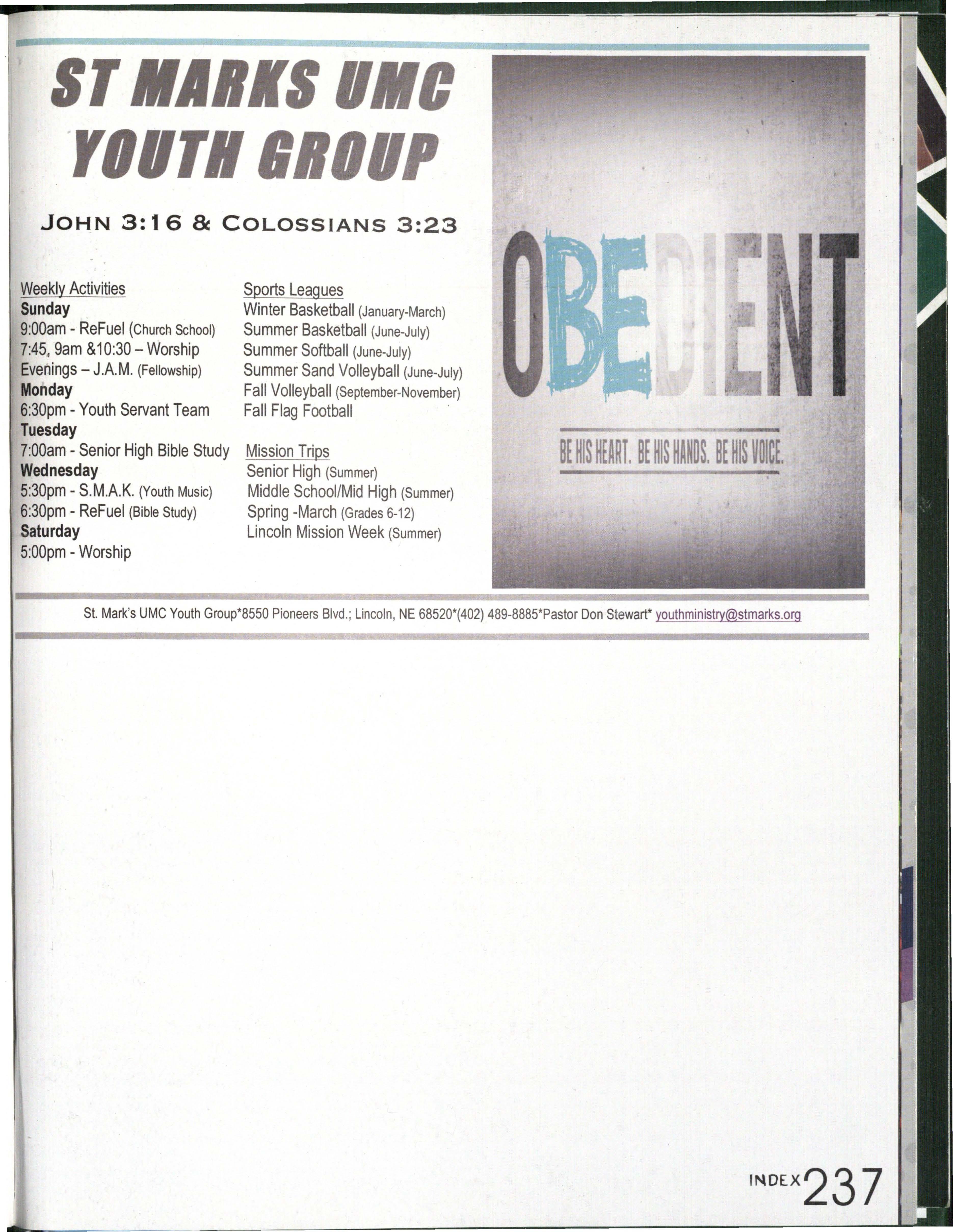 St. Mark's UMC Youth Gro up*8550 Pioneers Blvd .; Lincoln , NE 68520*(402) 489-8885*Pastor Don Stewart* youthministry@stmarks org