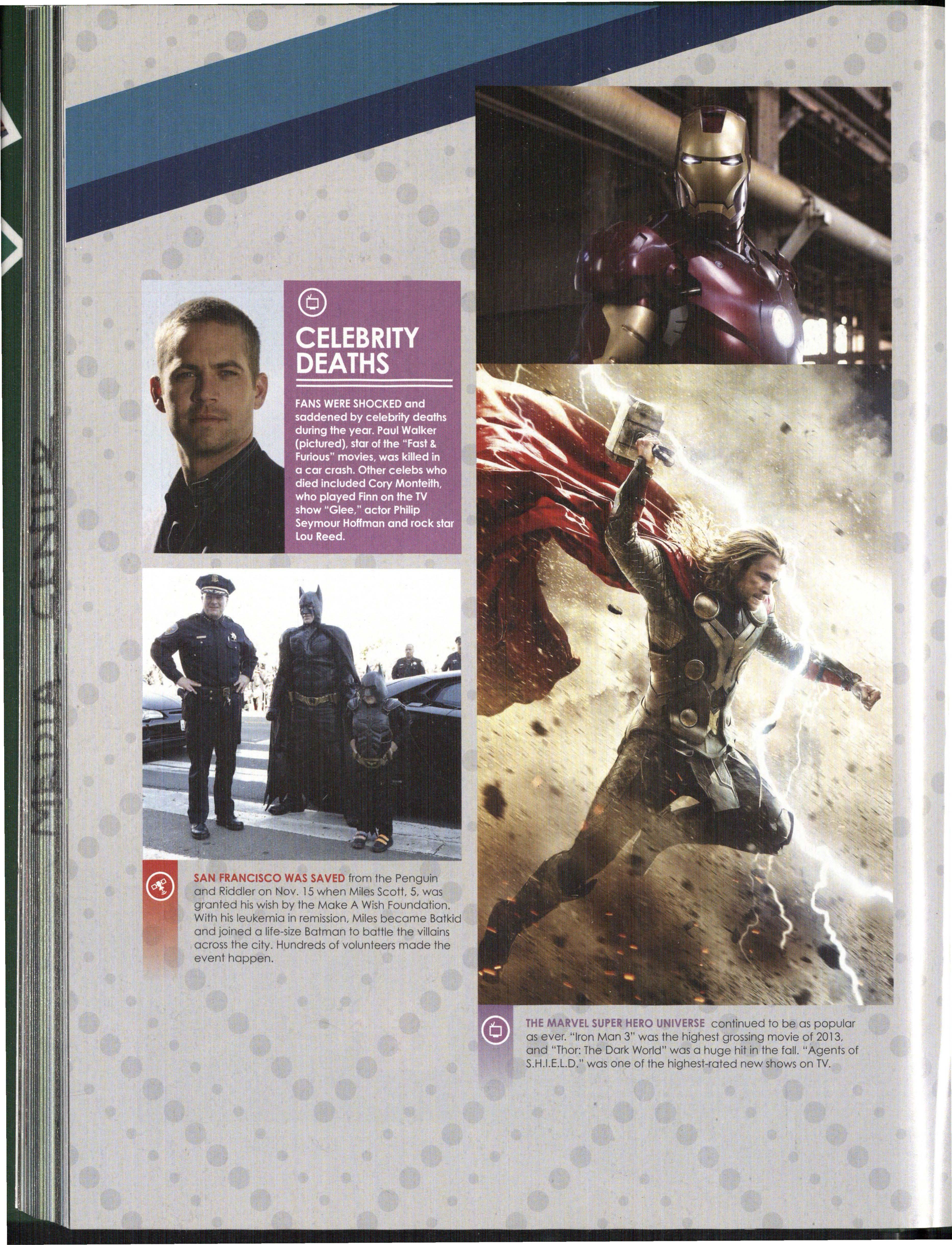 THE MARVEL SUPER HERO UNIVERSE continued to be as popular as ever. "Iron Man 3" was the highest grossing movie of 2013, and "Thor: The Dark World" was a huge hit in the fall. "Agents of S.H.I.E.L.D." was one of the highest-rated new shows on TV.