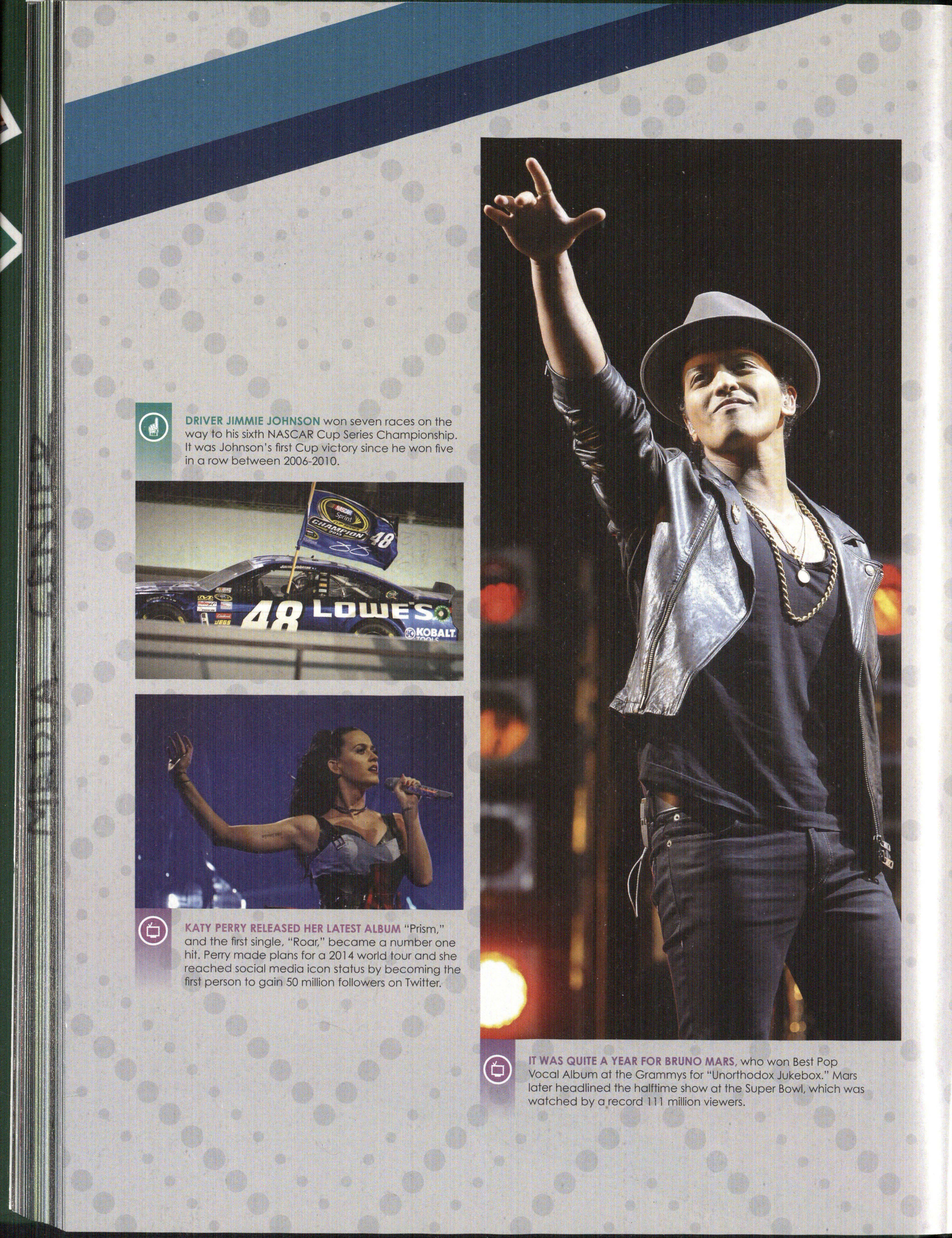 KATY PERRY RELEASED HER LATEST ALBUM "Prism," and the first single, "Roar," became a number one hit. Perry made plans for a 2014 world tour and she reached social media icon status by becoming the first person to gain 50 million followers on Twitter.