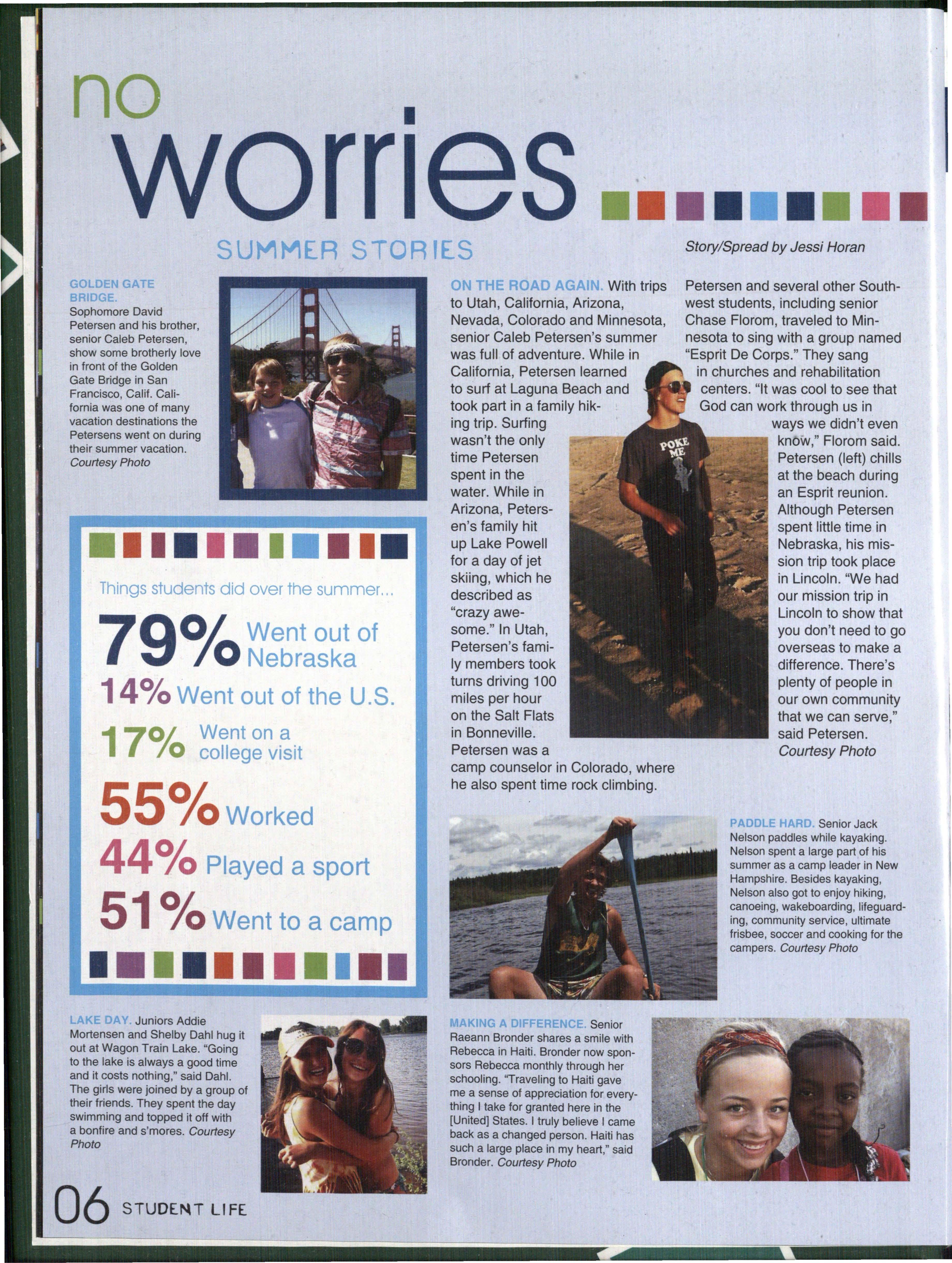 Petersen and several other Southwest students, including senior Chase Florom, traveled to Minnesota to sing with a group named "Esprit De Corps." They sang in churches and rehabilitation centers. "It was cool to see that God can work through us in ways we didn't even e=---.--.... know," Florom said. Petersen (left) chills at the beach during an Esprit reunion. Although Petersen spent little time in Nebraska, his mission trip took place in Lincoln. "We had our mission trip in Lincoln to show that you don't need to go overseas to make a difference. There's plenty of people in our own community that we can serve," said Petersen.