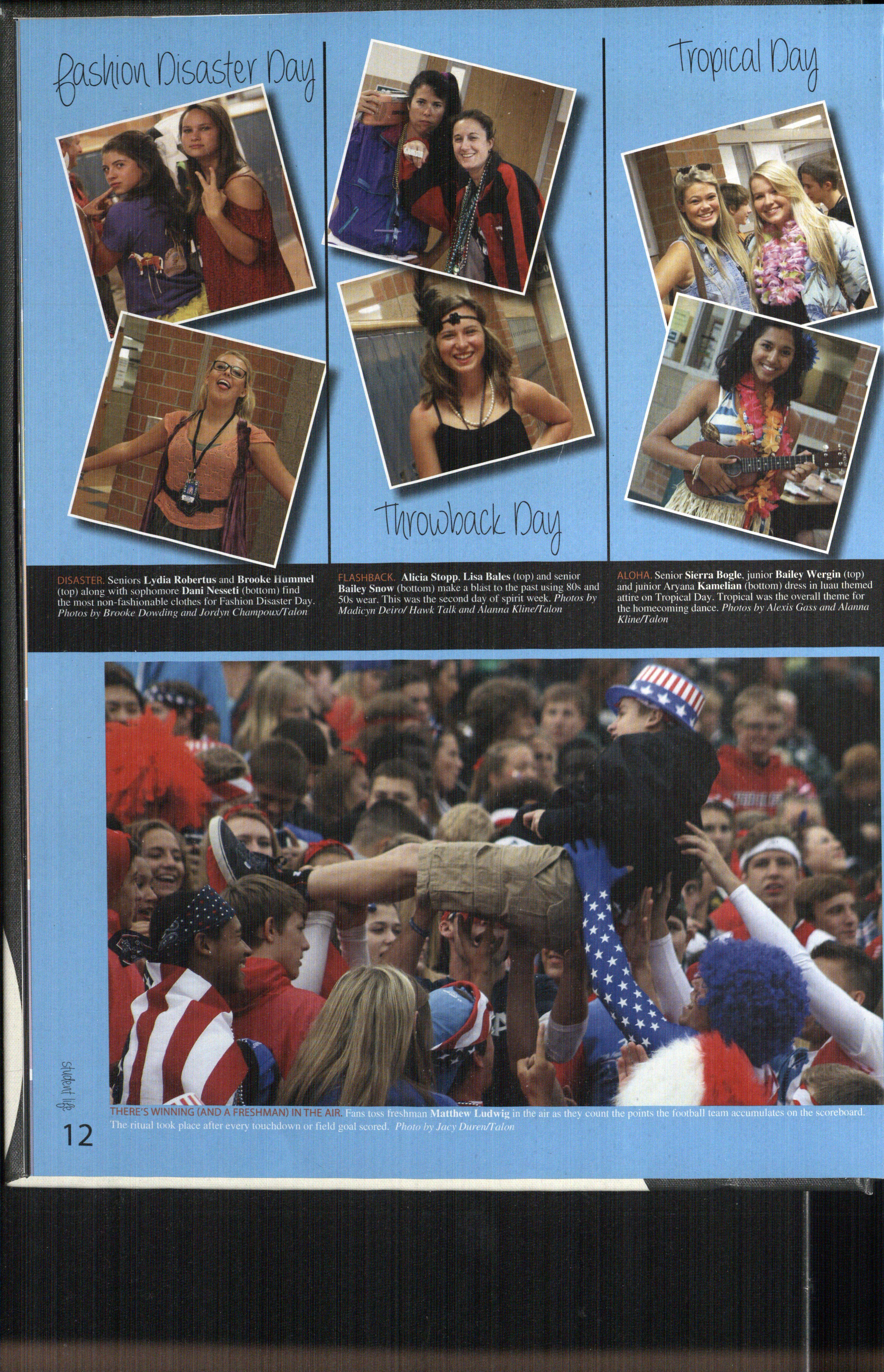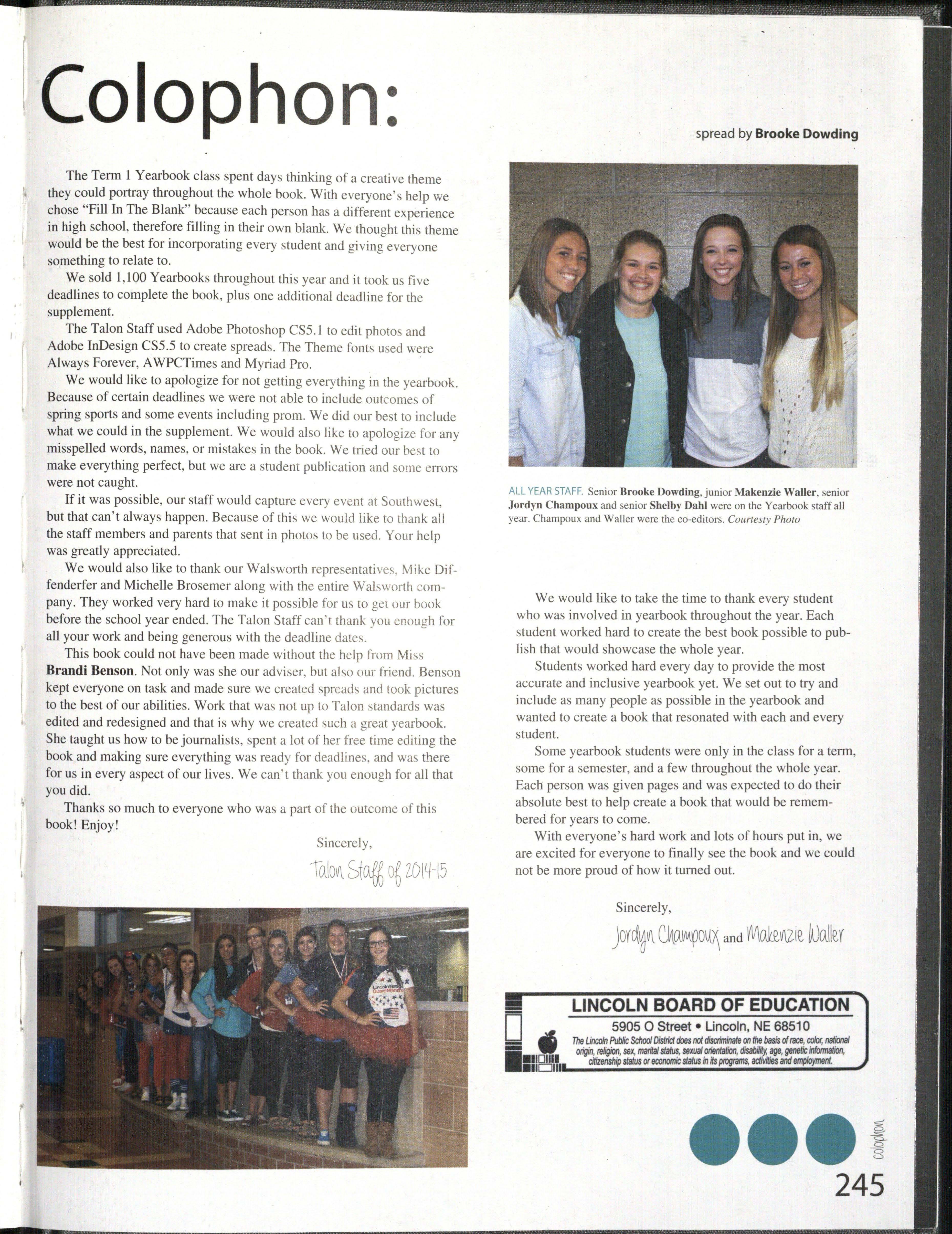 The Talon Staff used Adobe Photo shop CS5 l to ed it photos and Adobe InDesign CS5.5 to create spreads. The Theme fonts used were Always Forever, AWPCTimes and Myriad Pro.
