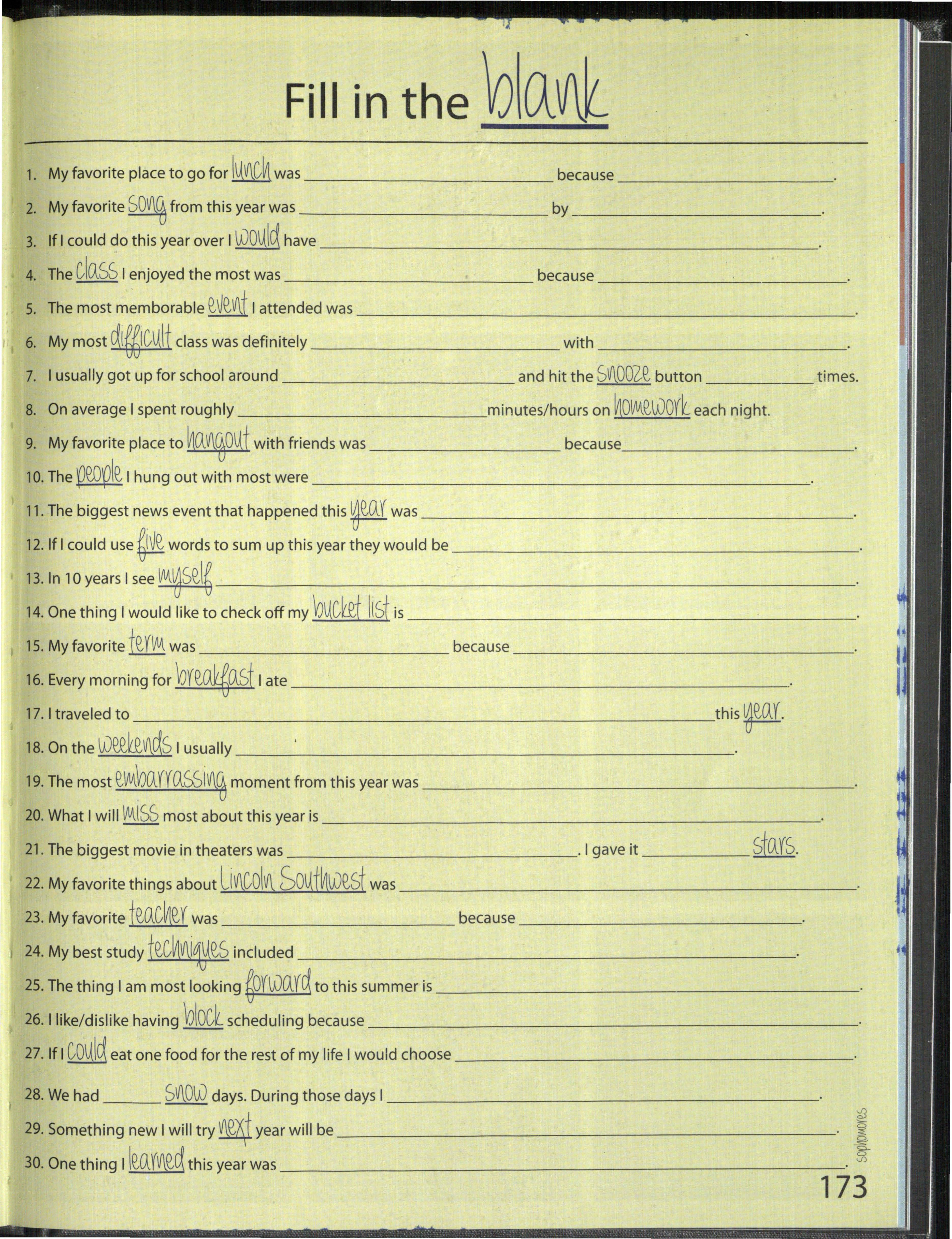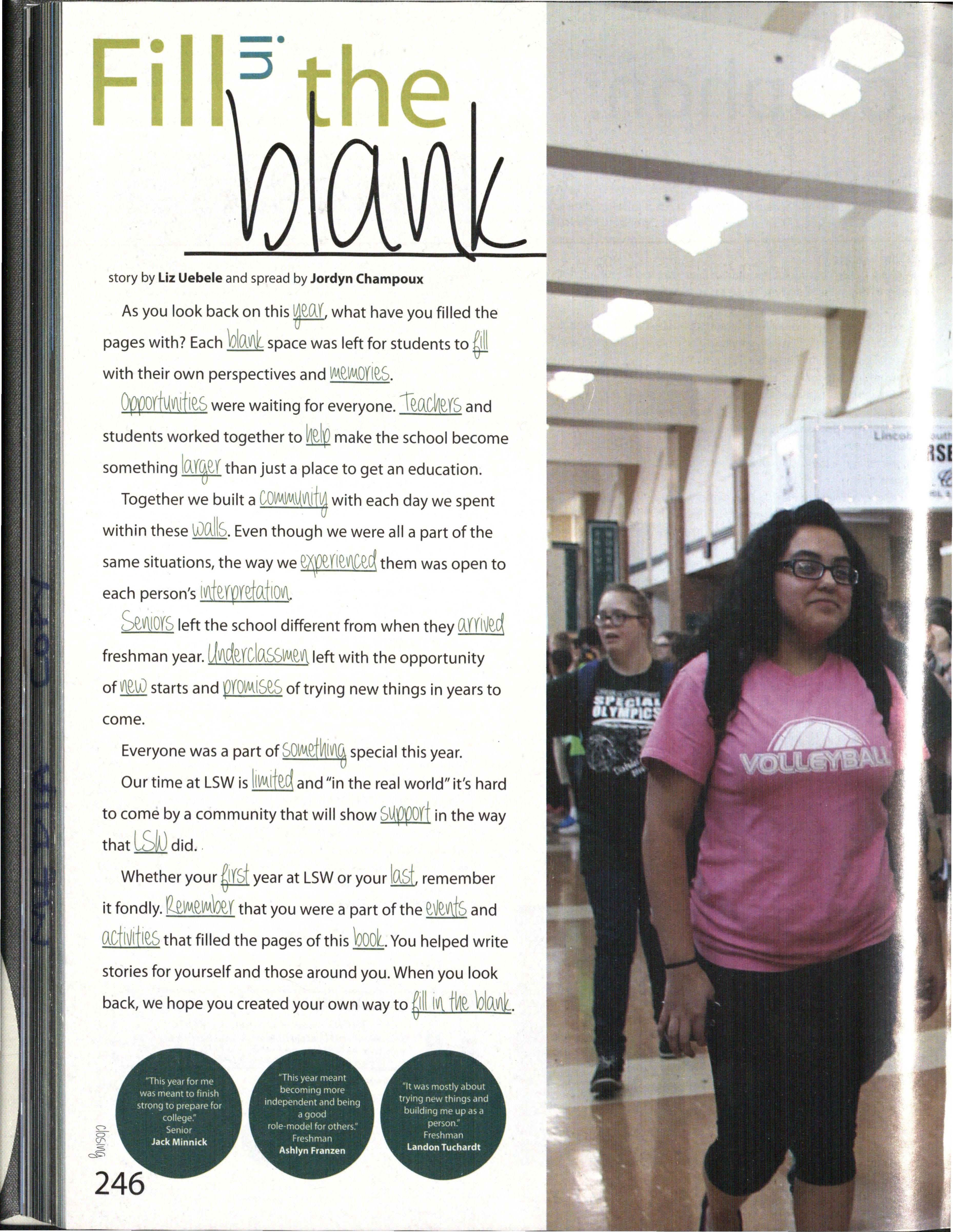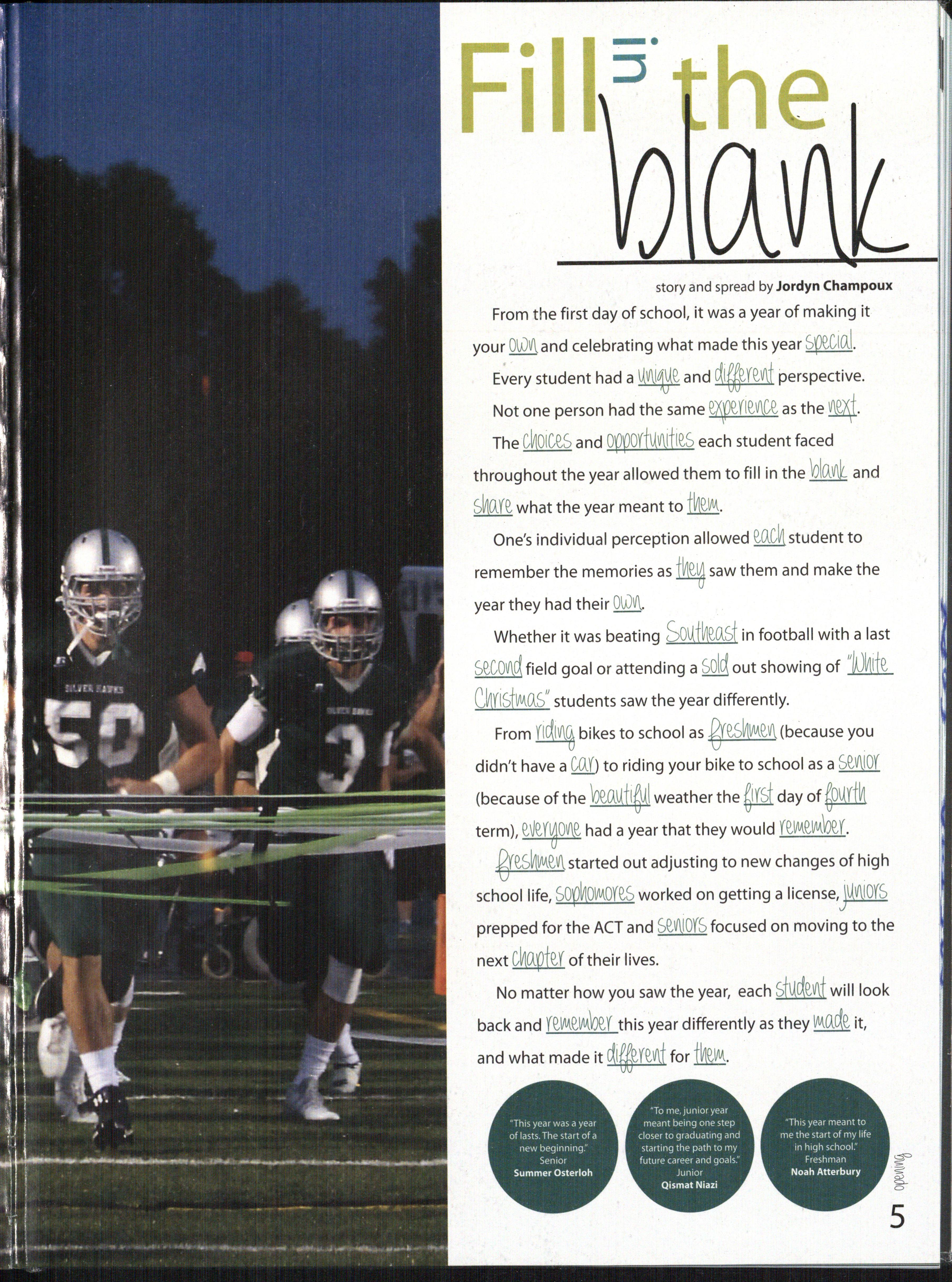 The cnoices and 099odVV\it ies each student faced throughout the year allowed them to fill in the ½lo.i and sno_ye, what the year meant to fnelM