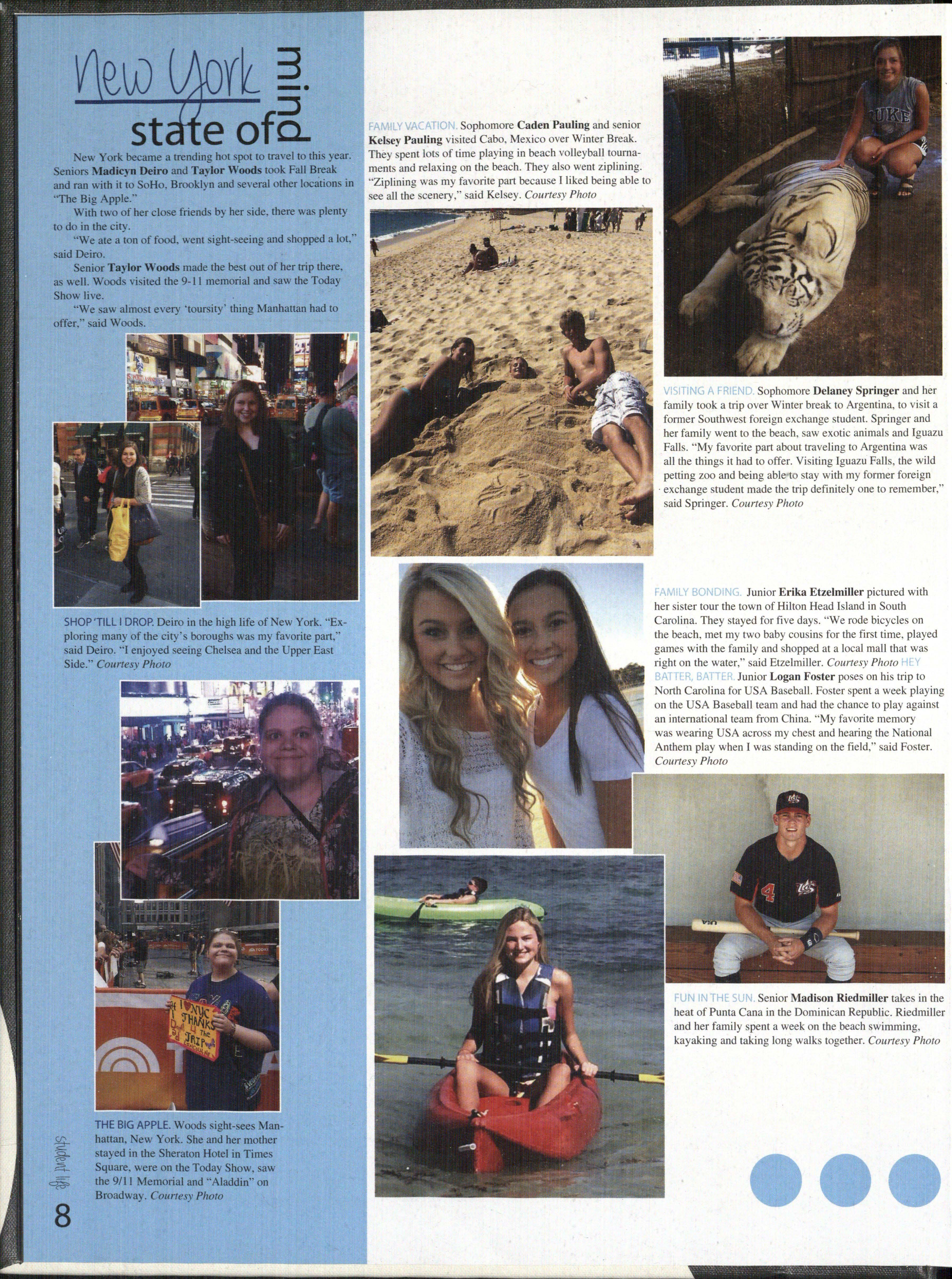 f-Al,i IL Y B01" D N Junior Erika Etzelmiller pictured with her sister tour the town of Hilton Head Island in South Carolina They stayed for five days. "We rode bicycles on the beach, met my two baby cousins for the first time , played games with the family and shopped at a local mall that was right on the water," said Etzelmiller. Courtesy Photo [ Y RA fl b Ln Junior Logan Foster poses on his trip to North Carolina for USA Baseball. Foster spent a week playing on the USA Baseball team and had the chance to play against an international team from China. " My favorite memory was wearing USA across my chest and hearing the National Anthem play when I was standing on the field," said Foster.