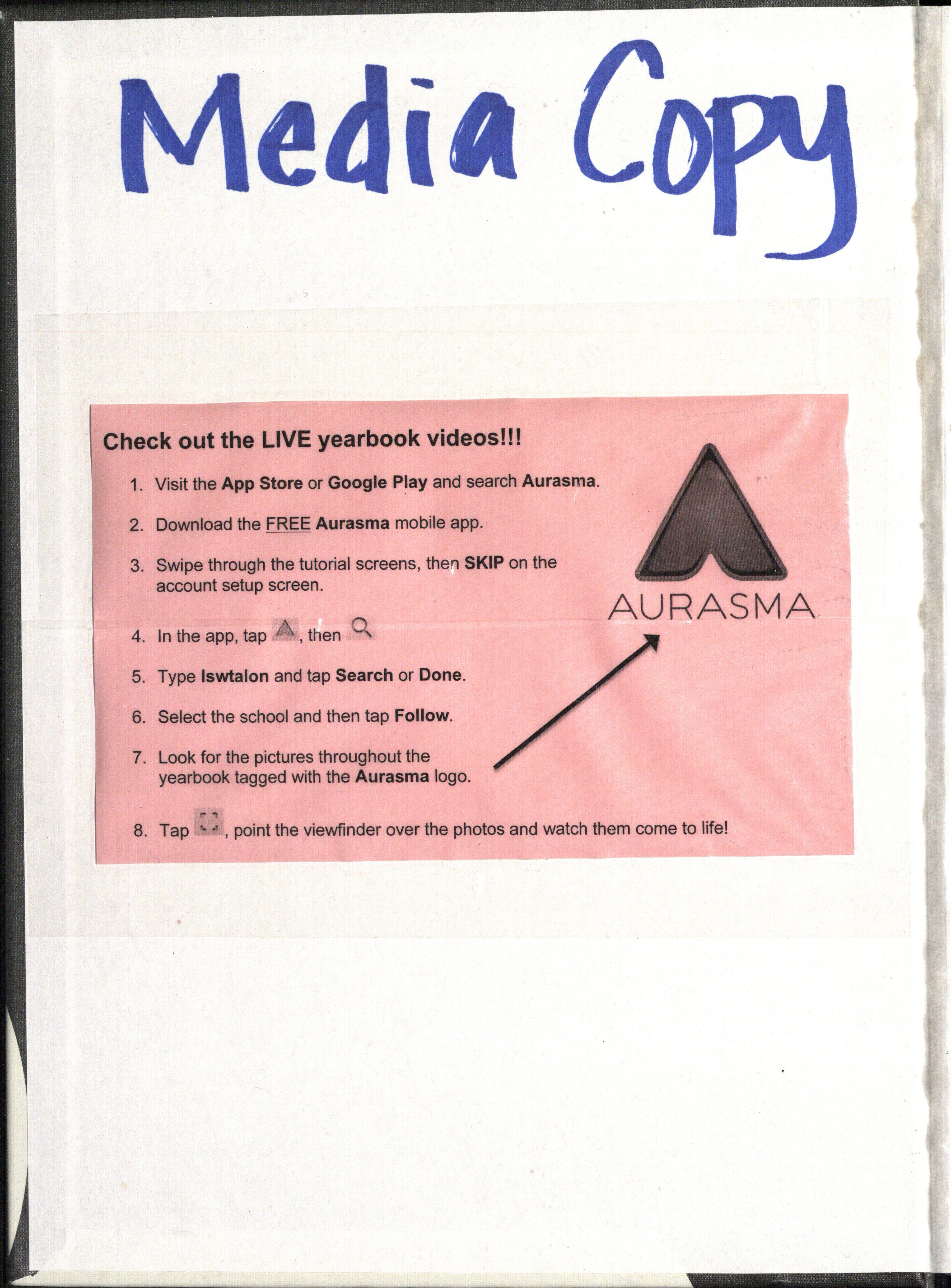 7. Look for the pictures throughout the yearbook tagged with the Aurasma logo.