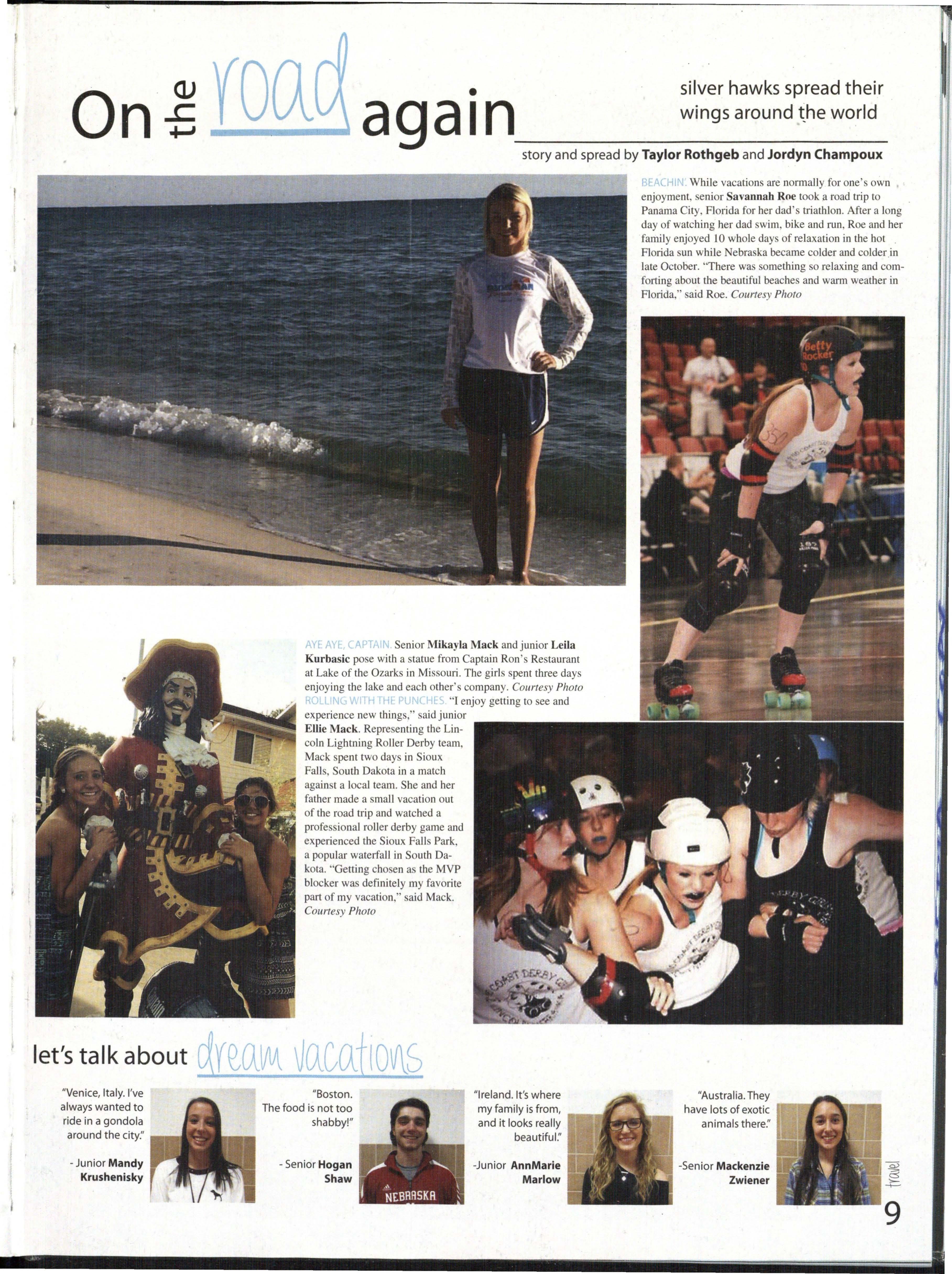 Senior .Mikayla .Mack and junior Leila Kurbasic pose with a statue from Captain Ron 's Re sta urant at Lake of the Ozarks in Missouri. The girls spent three days enjoying the lake and each other's company. Courtesy Photo "I enjoy getting to see and experience new things," said junior Ellie .Mack. Representing the Lincoln Lightning Roller Derby team, Mack spe nt two days in Sioux Falls, South Dakota in a match again t a local team. She and her father made a smaJI vacation out of the road trip and watched a profes ional roller derby game and experienced the Sioux Falls Park, a popular waterfall in South Dakota. "Getting cho en a the MVP blocker was definitely my favorite part of my vacation," said Mack.