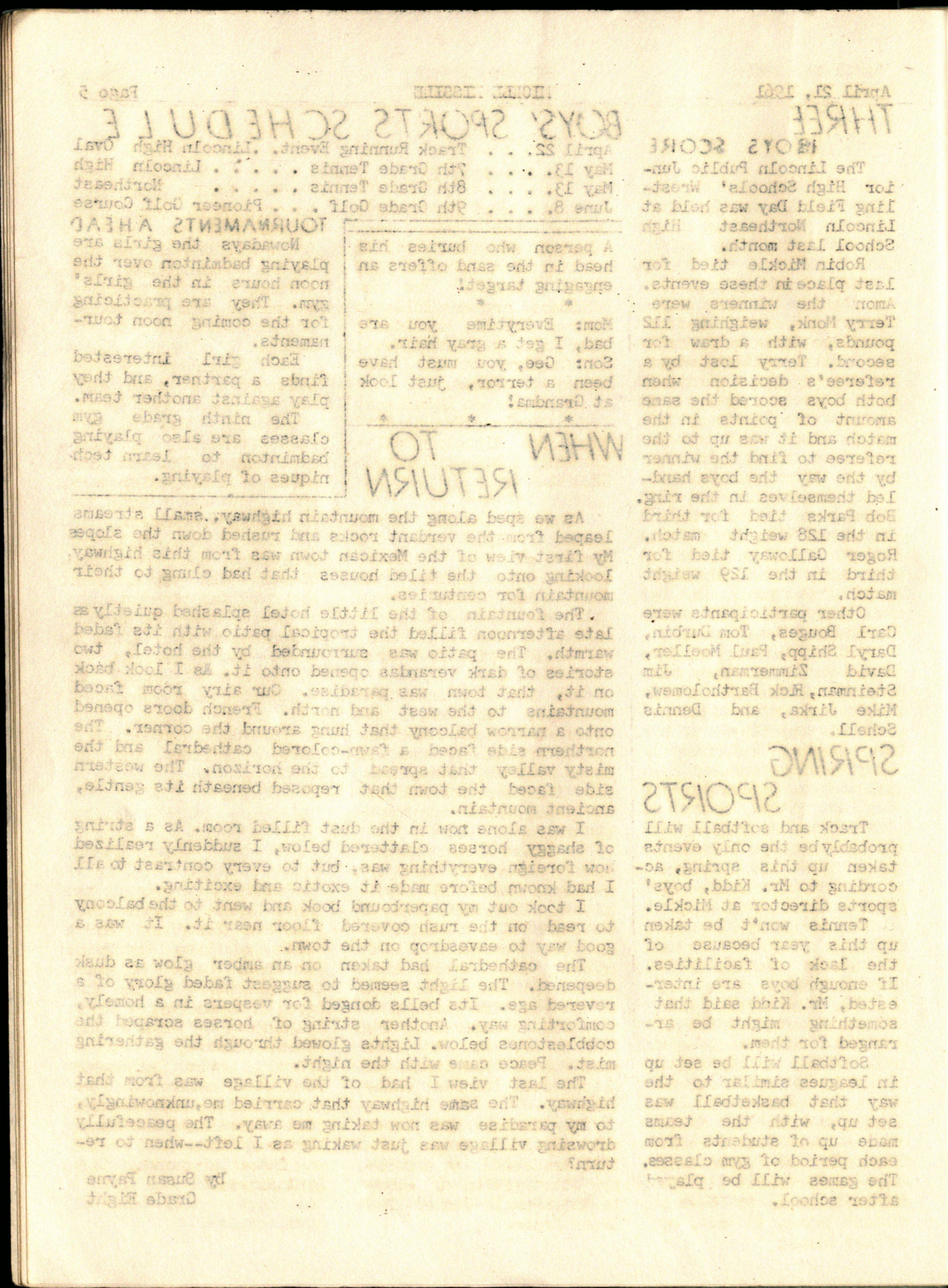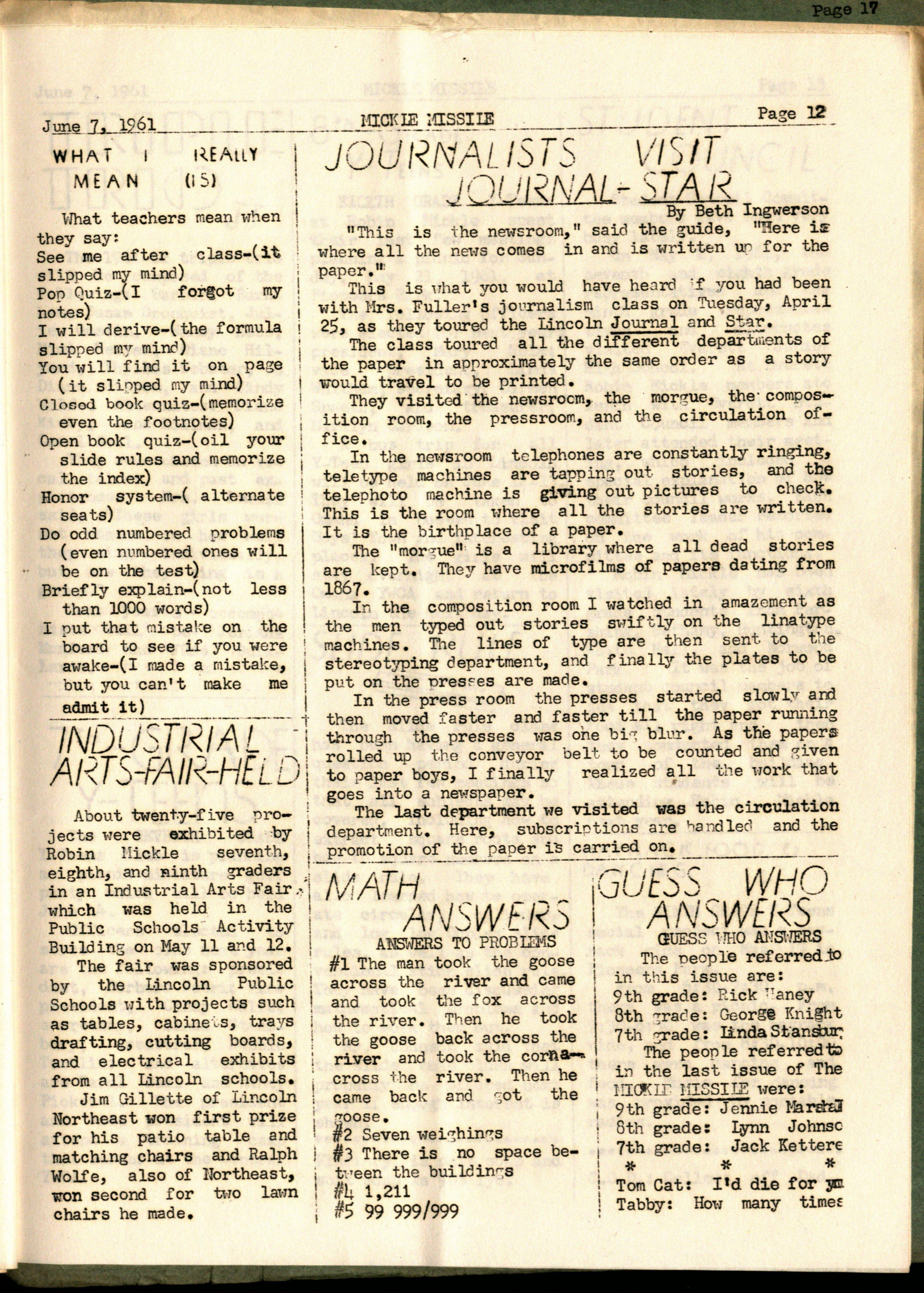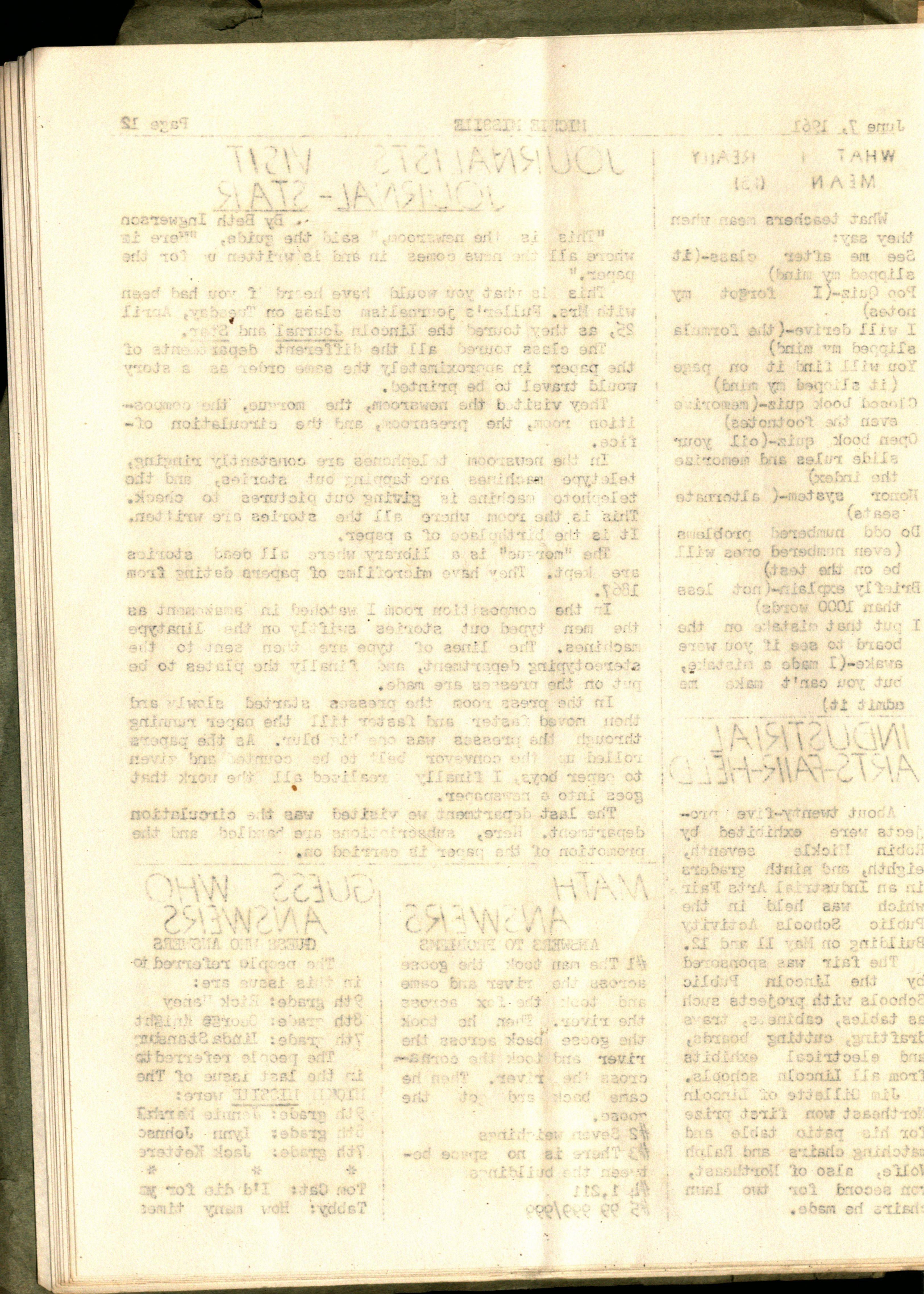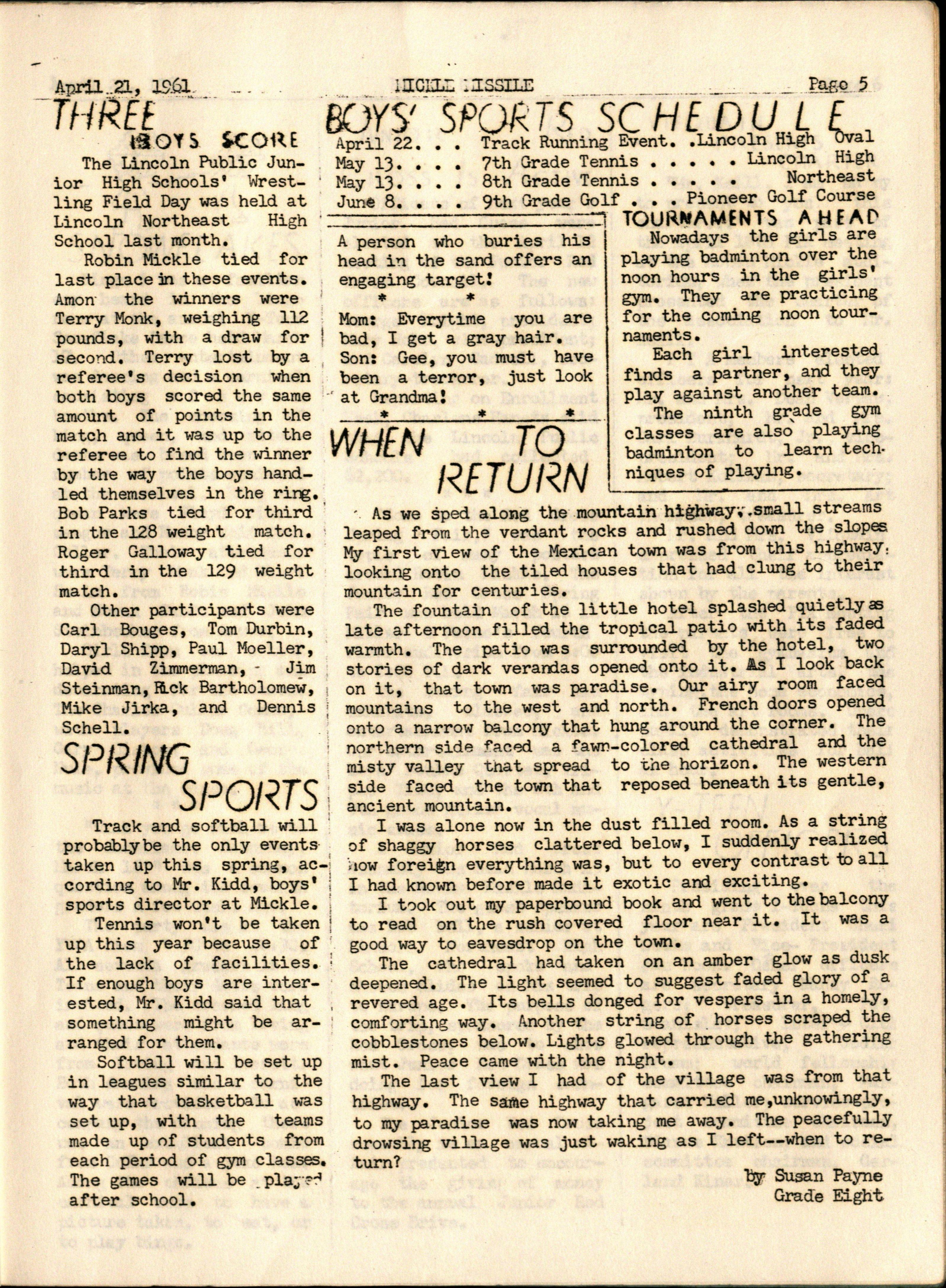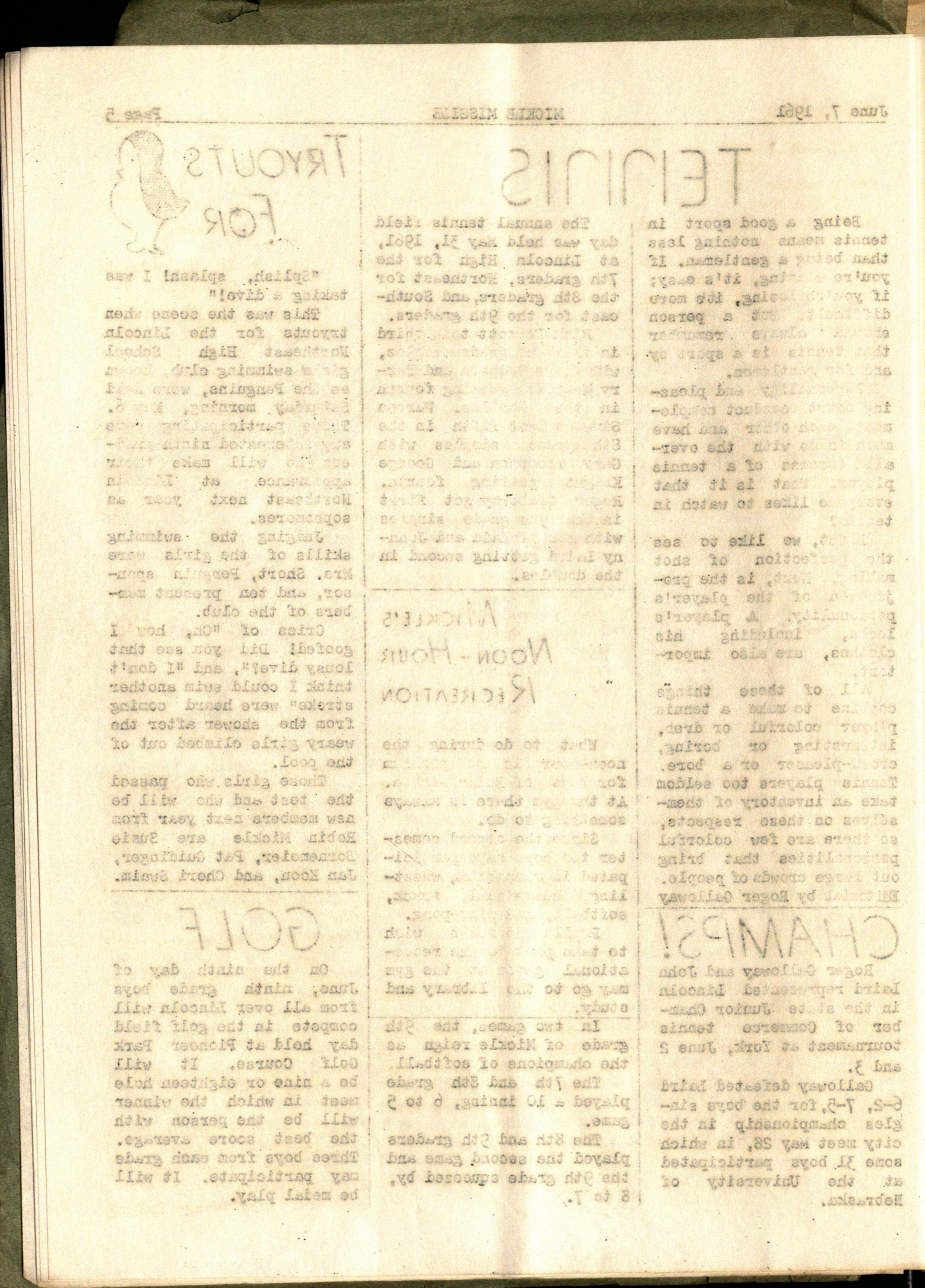 The Lincoln Public Jun- May 13 .••• 7th Grade Tennis ••••• Lincoln High ior High Schools' Wrest- May 13 .•.• 8th Grade Tennis. . . • • Northeast ling Field Day was held at June 8. • . . 9th Grade Golf ••. Pioneer Golf Course Lincoln Northeast Hi gh ----------- . TOURNAMENTS AHEAf' School last month. A person who buries his Nowadays the girls are Robin Mickle tied for head in the sand offers an playing badminton over the last place:in these events. engaging target: noon hours in the girls' Amon- the winners were 1 • • gym. They are practicing Terry Monk, weighing 112 Mom: Everytime you are for the coming noon tourpounds, with a draw for bad, I get a gray hair. naments. seco nd. Terry lost by a _1 Son: Gee, you must have Each girl interested referee's decision when been a terror, just look finds a partner, and they both boys scored the same -' at Grandma! play against another team amount of points in the • • • The ninth grade gym match and it was up to the IAIU.fN TQ classes are als~ playing referee to find the winner Jf Vn1 badminton to learn techby the way the boys hand-