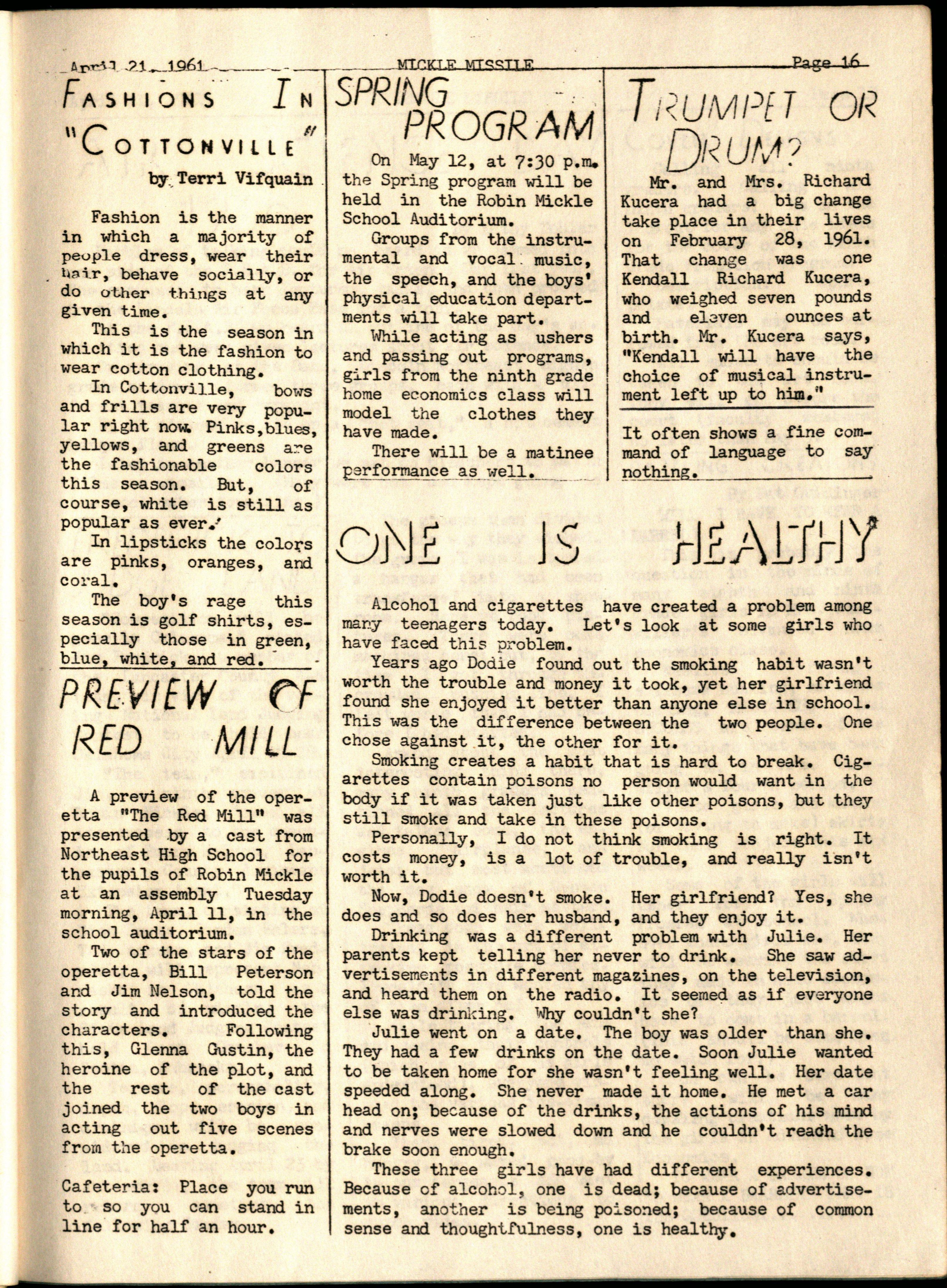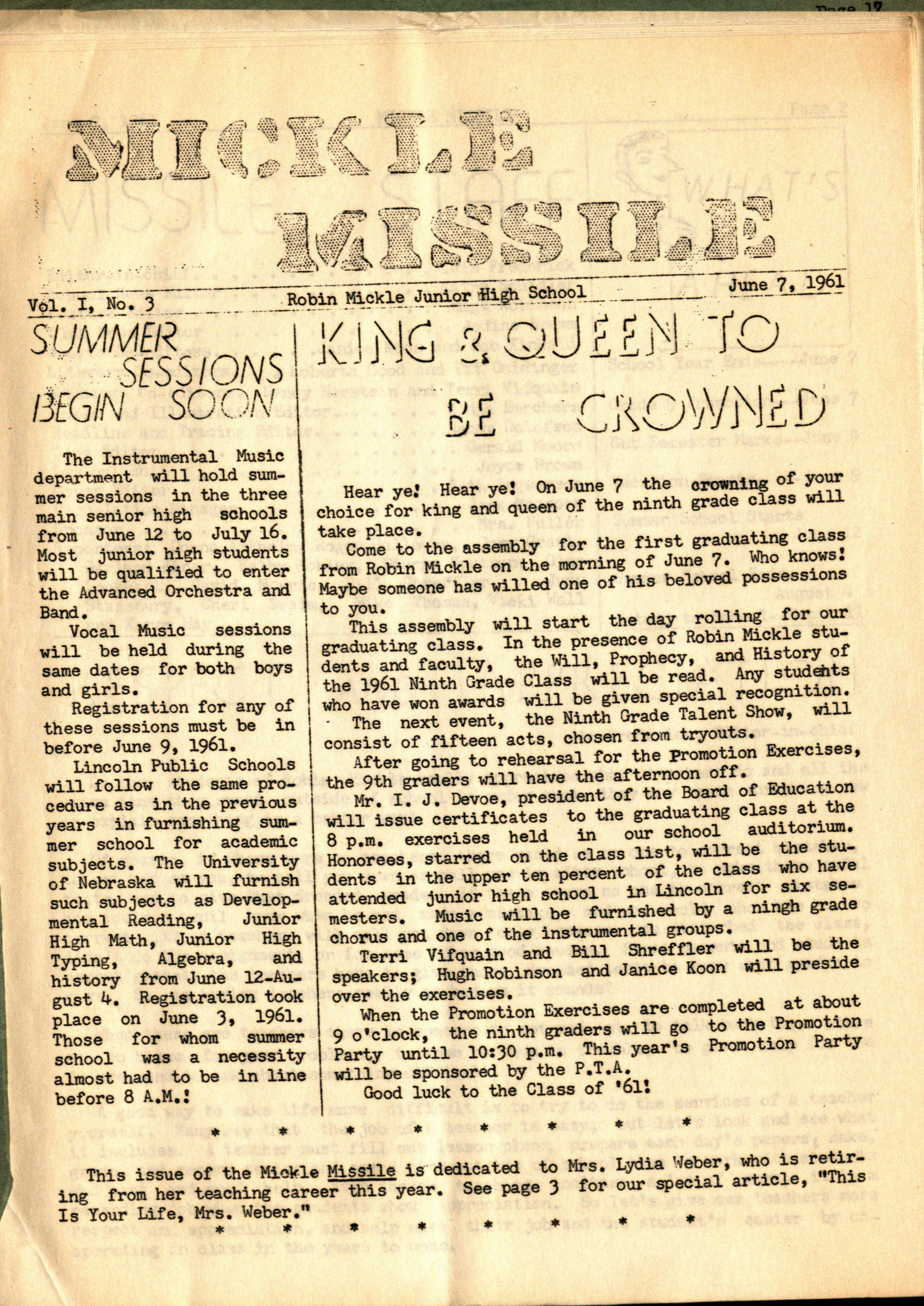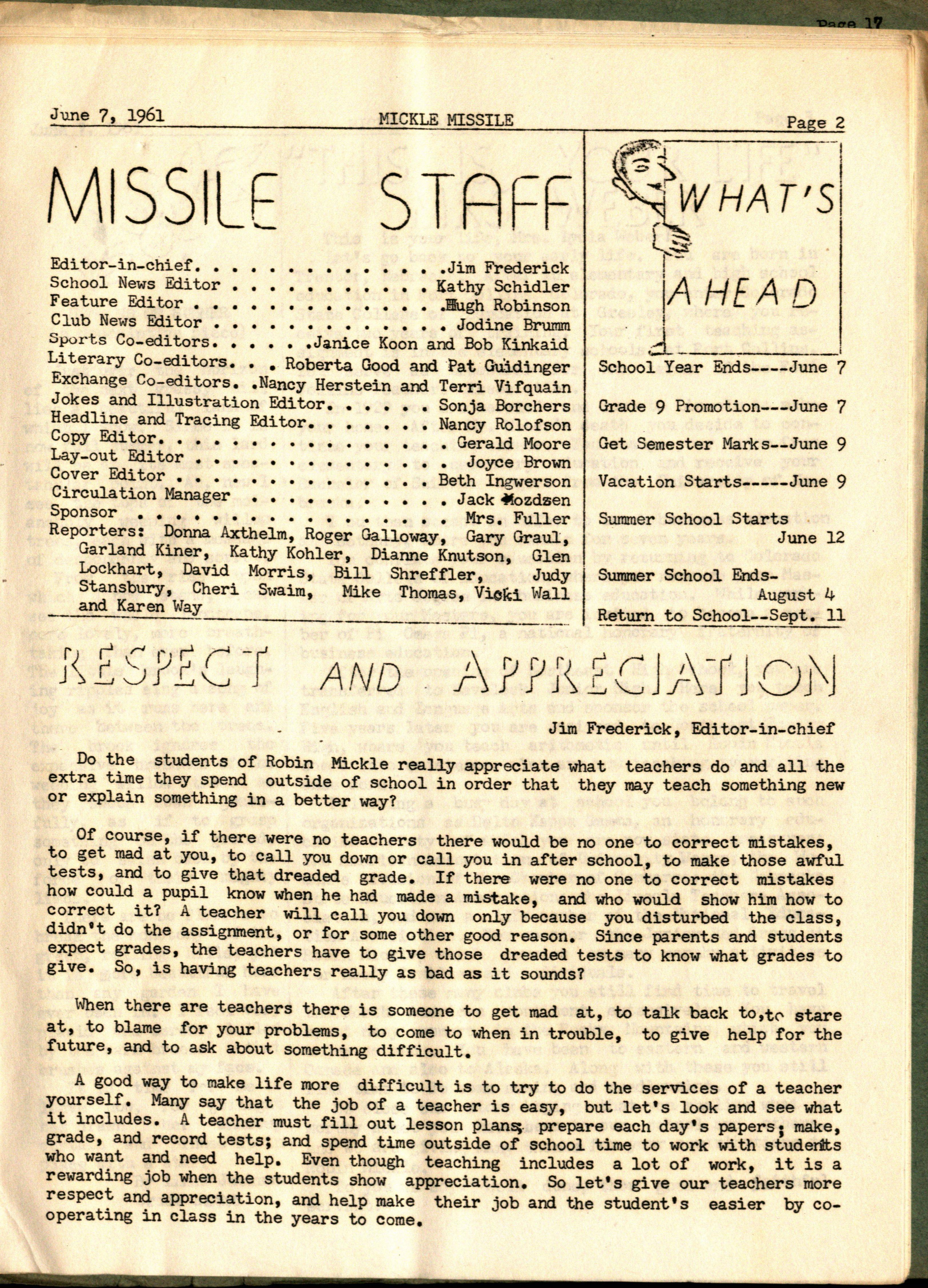What do , you think of the school newspaper, the Mickle Missile? Do •• 7ou have any comments? If you do, we would appreciate it if you would write them in letter form to the editor, :royce Brown, and give them to her or Mrs. Fuller, ~206_!__ _