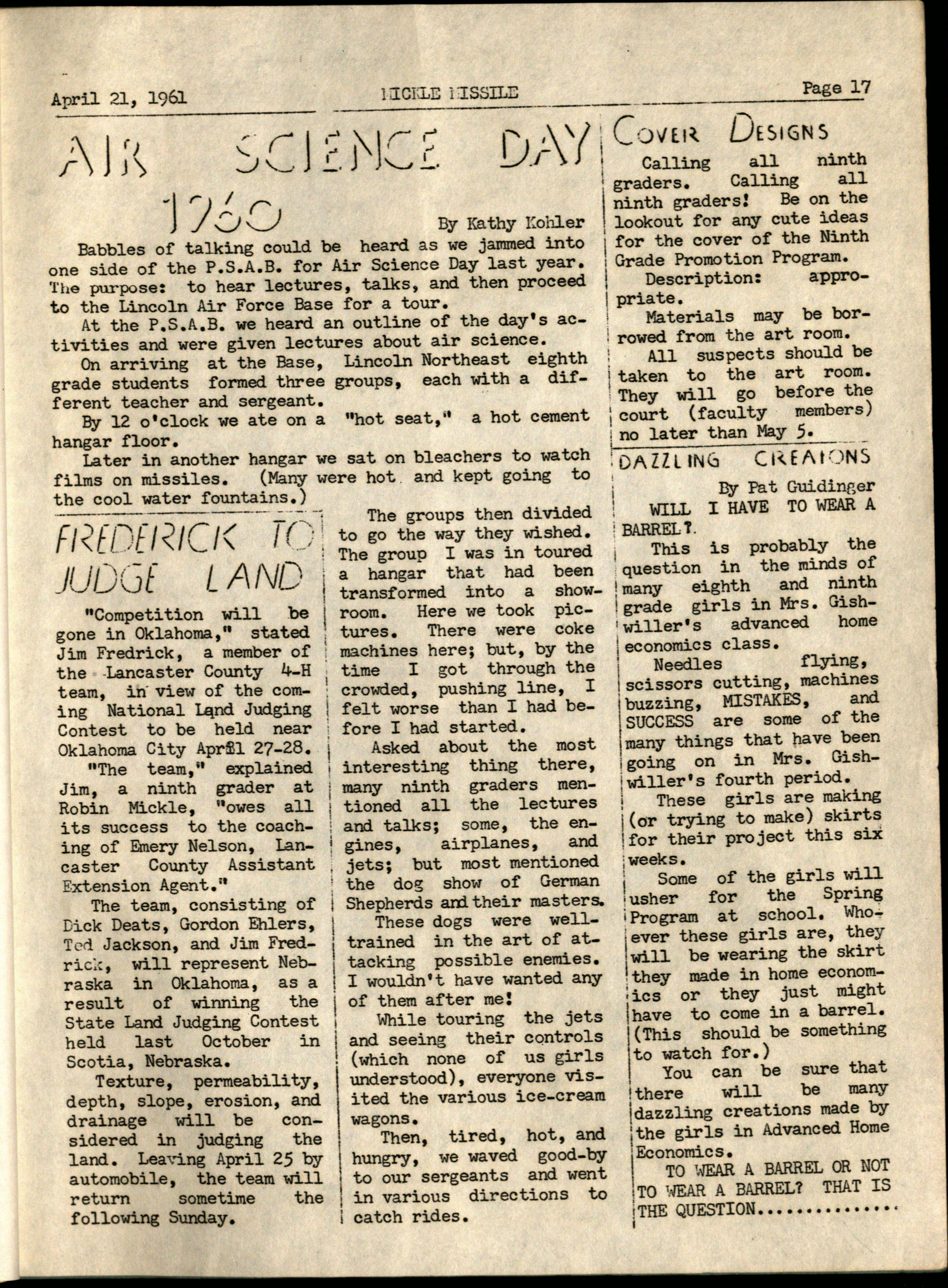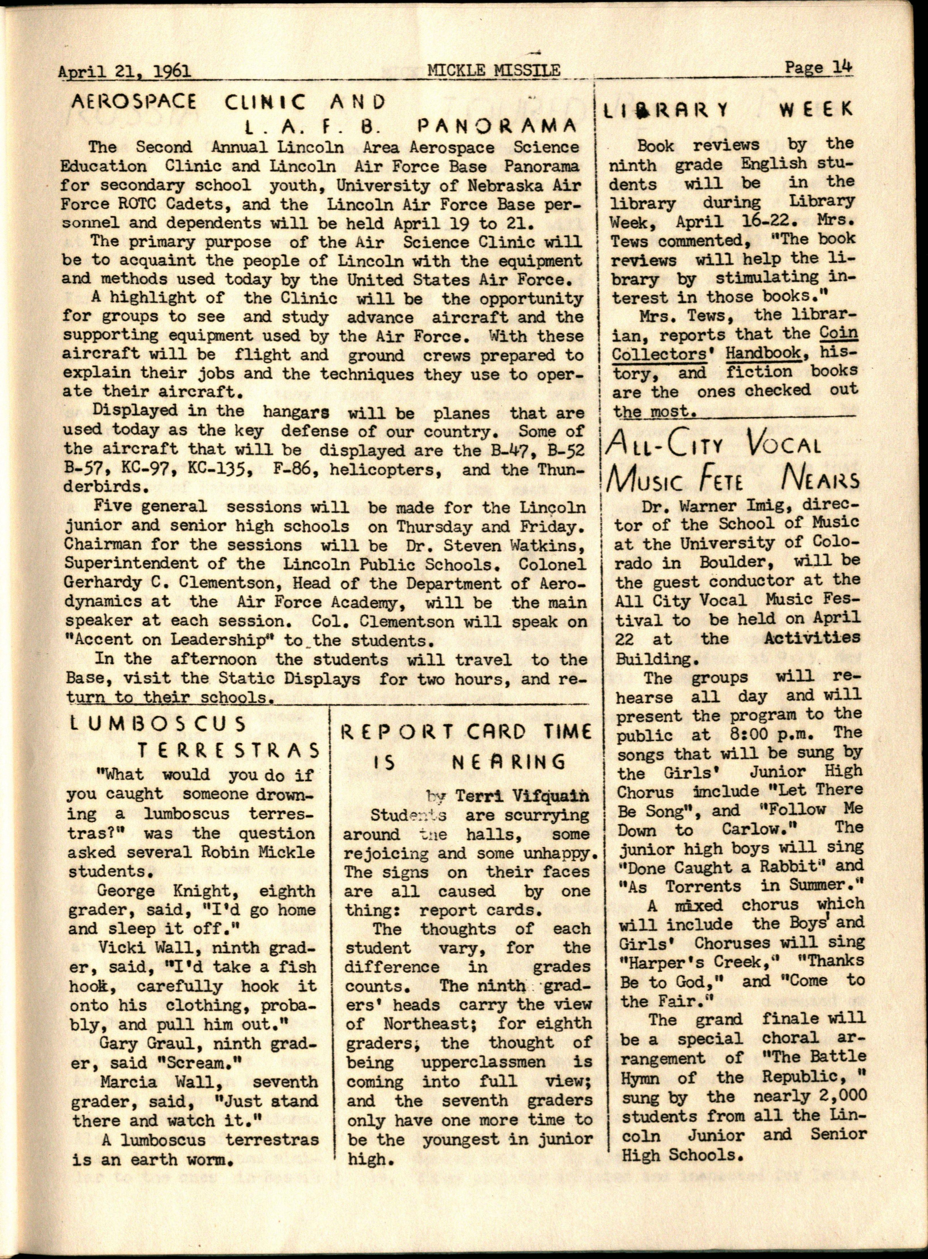Mrs. J'uller 1 . Reporters •••• sonja Borchers, J"odine B:rumm. Roger Gallo- 1 .Air Science Education Da~ Way, Roberta Good, Nancy Heratein, Beth Ingwerson, Bob I ·April 18 KinKa1d, Glen I.ookhart, Jack Mozdzen, Nancy Rolo:tson, ; End of six weeks-April 21 Kathy Schidler, Mike Thomas, Terri V1:tqua1n, Vicki Wall ; Vocal Music Festival at