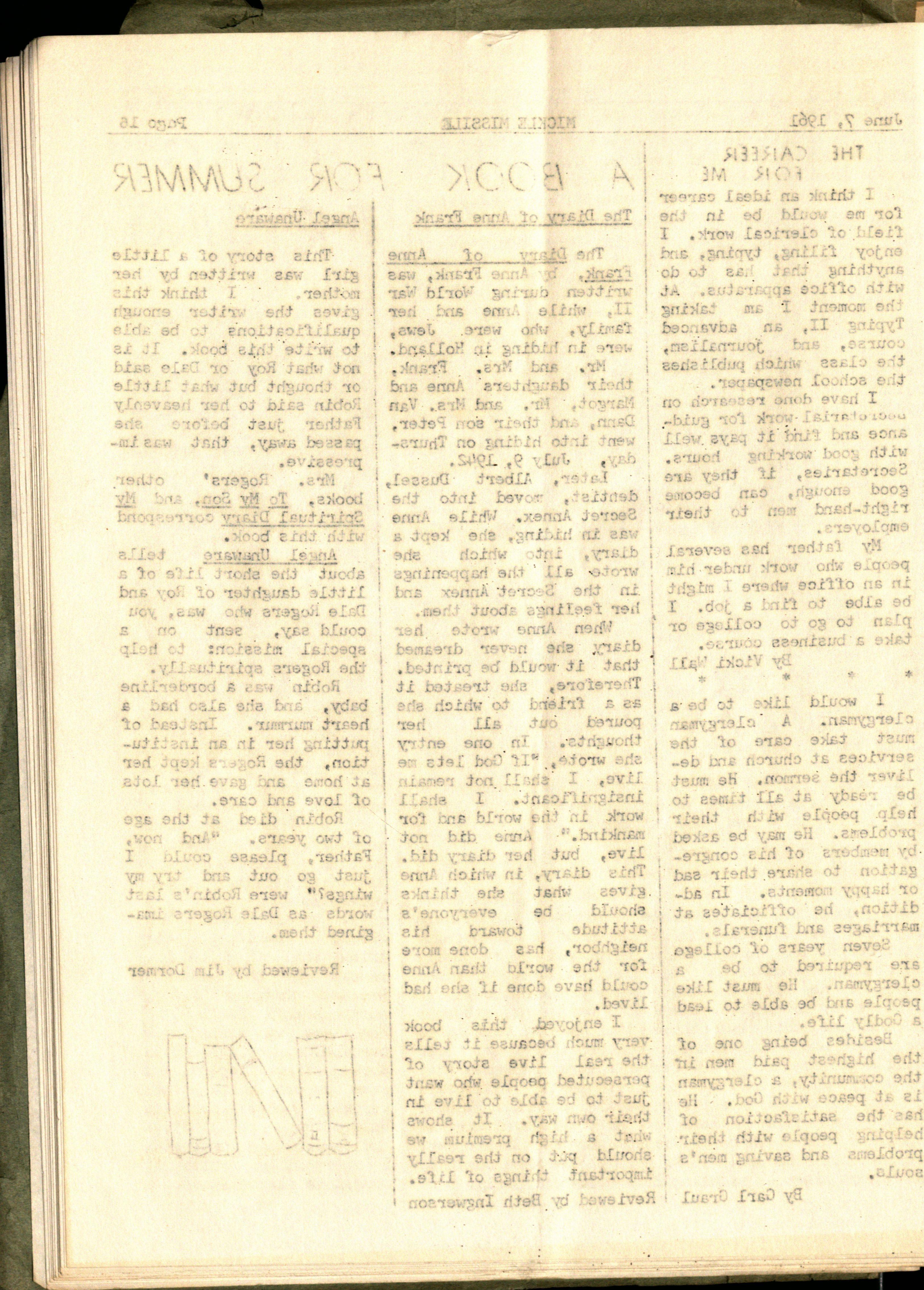 I think an ideal career for me would be in t~e field of clerical work. I enjoy filing, typing, and anything that has to do with office apparatus. At the moment I am taking Typing II, an advanced • course, and journalism, the class which publishes the school newspaper.