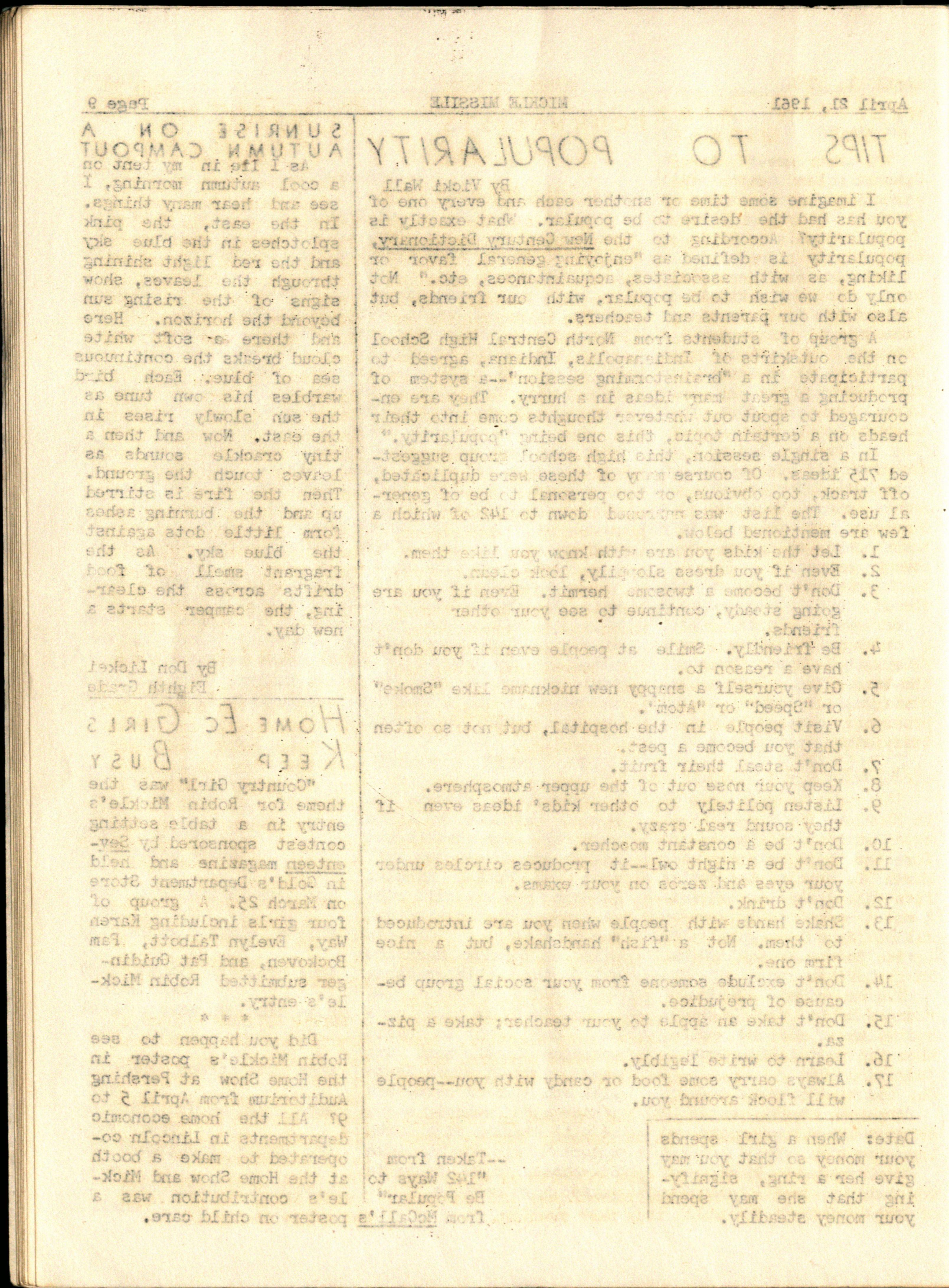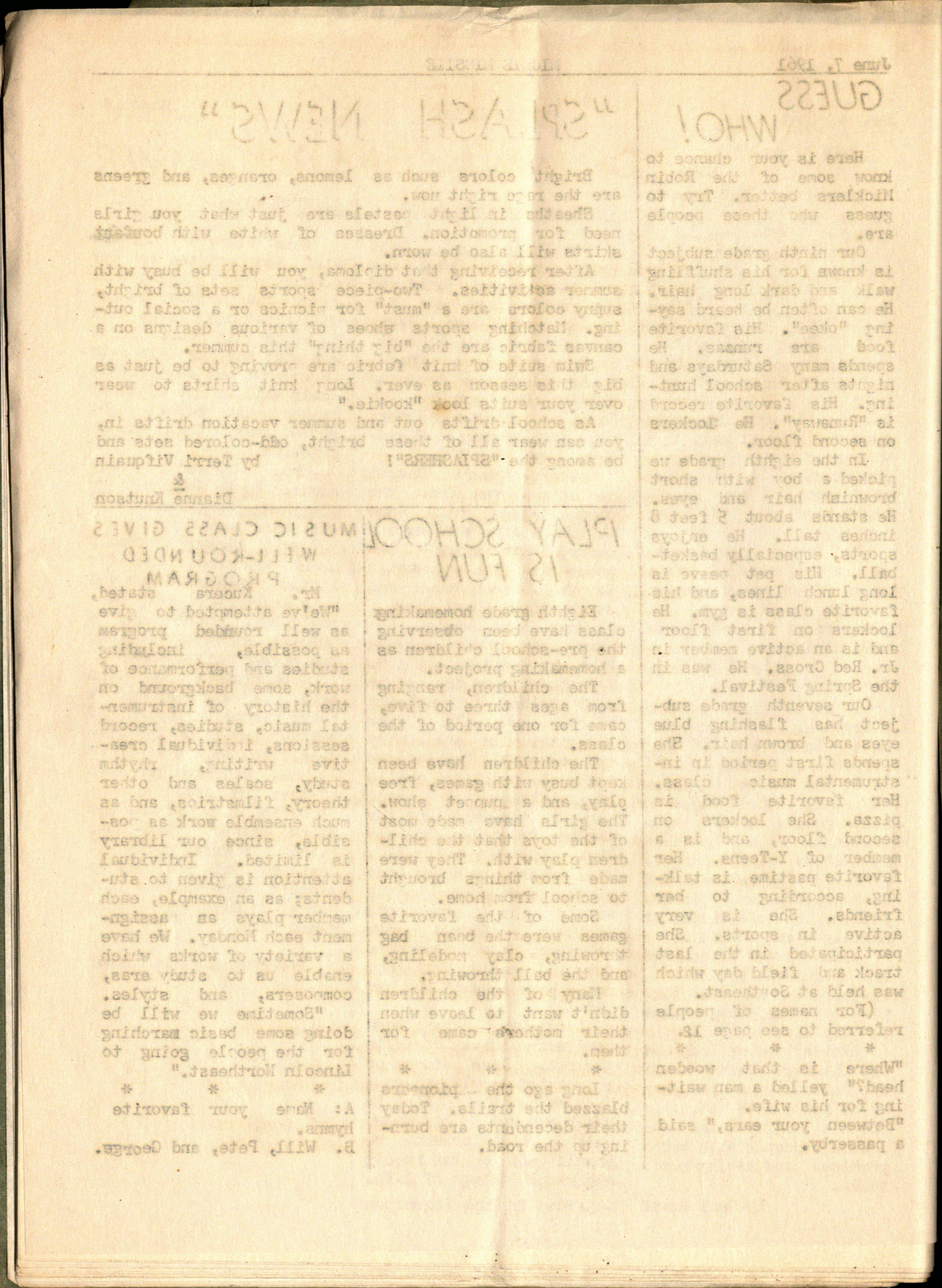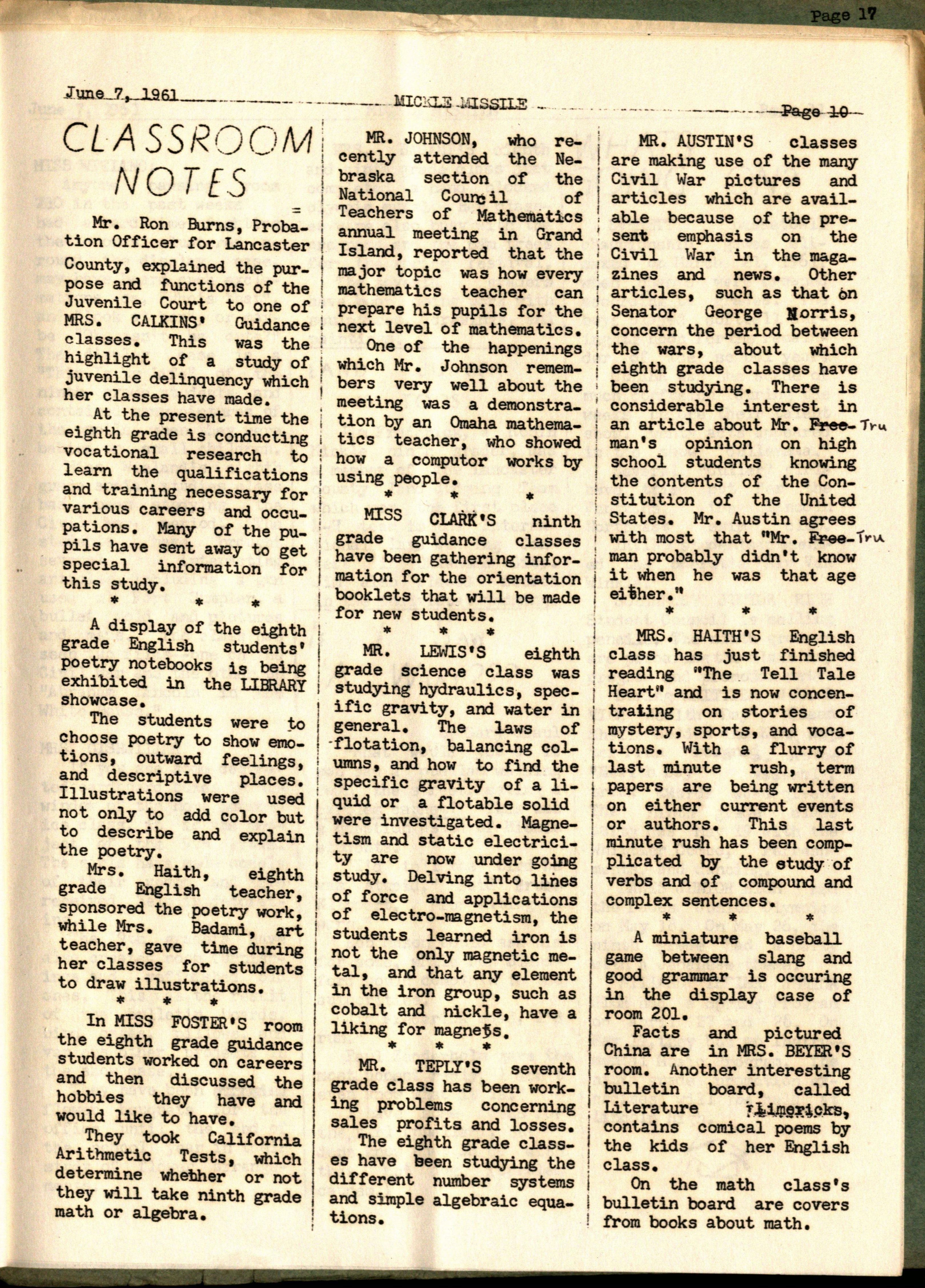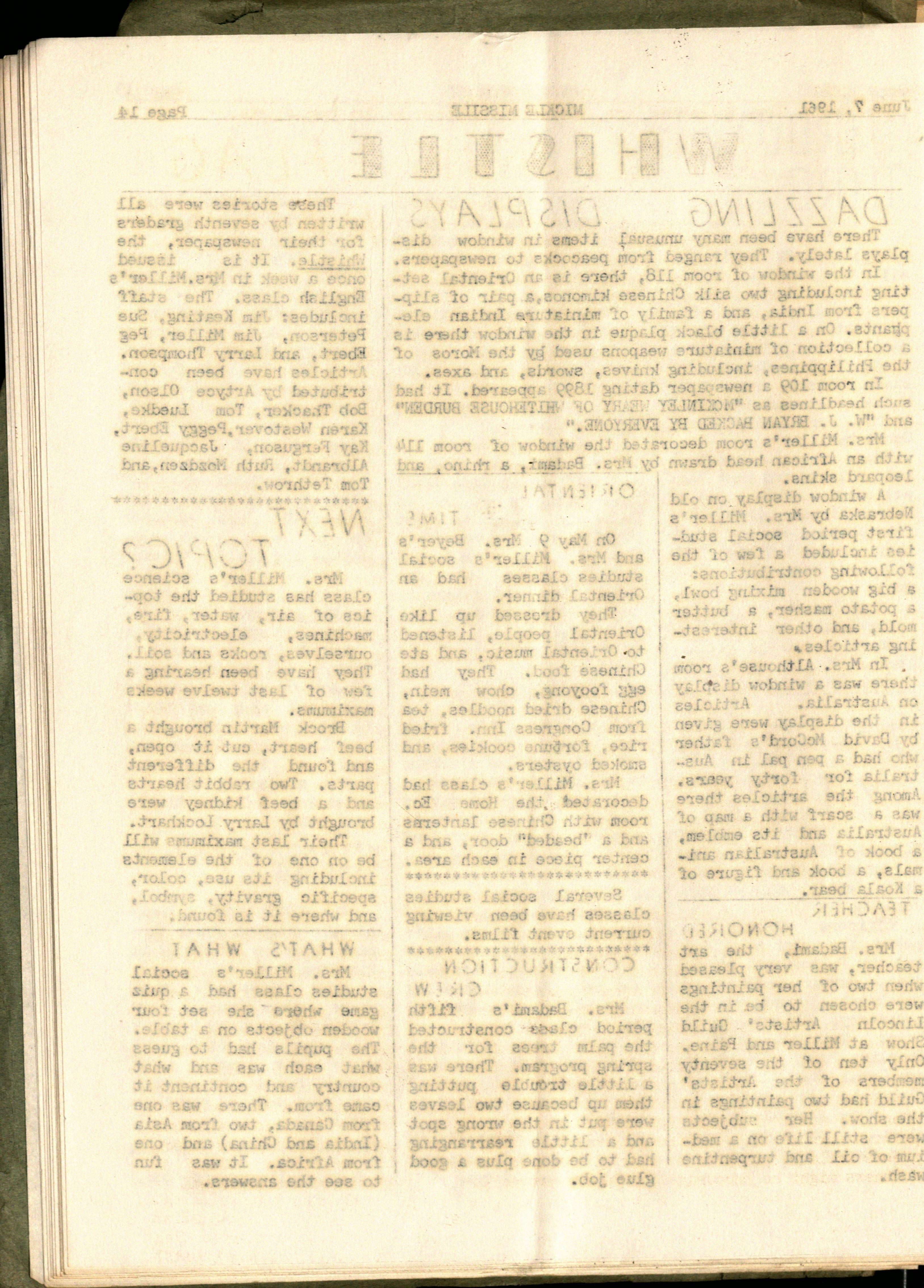 These stories were all written by seventh graders for their newspaper, the Whistle. It is issued once a week in }\rs.Miller's _ English class. The staff includes: Jim Keating, Sue Peterson, Jim Miller, Peg m>ert, ard Larry Thompson. Articles have been contributed by Artyce Olson, Bob Ttaacker, Tom Luedke, Karen Westover,Peggy Ebert, Kay Ferguson, Jacqueline Albrardt, Ruth Mozdzen,and Tom Tethrow.