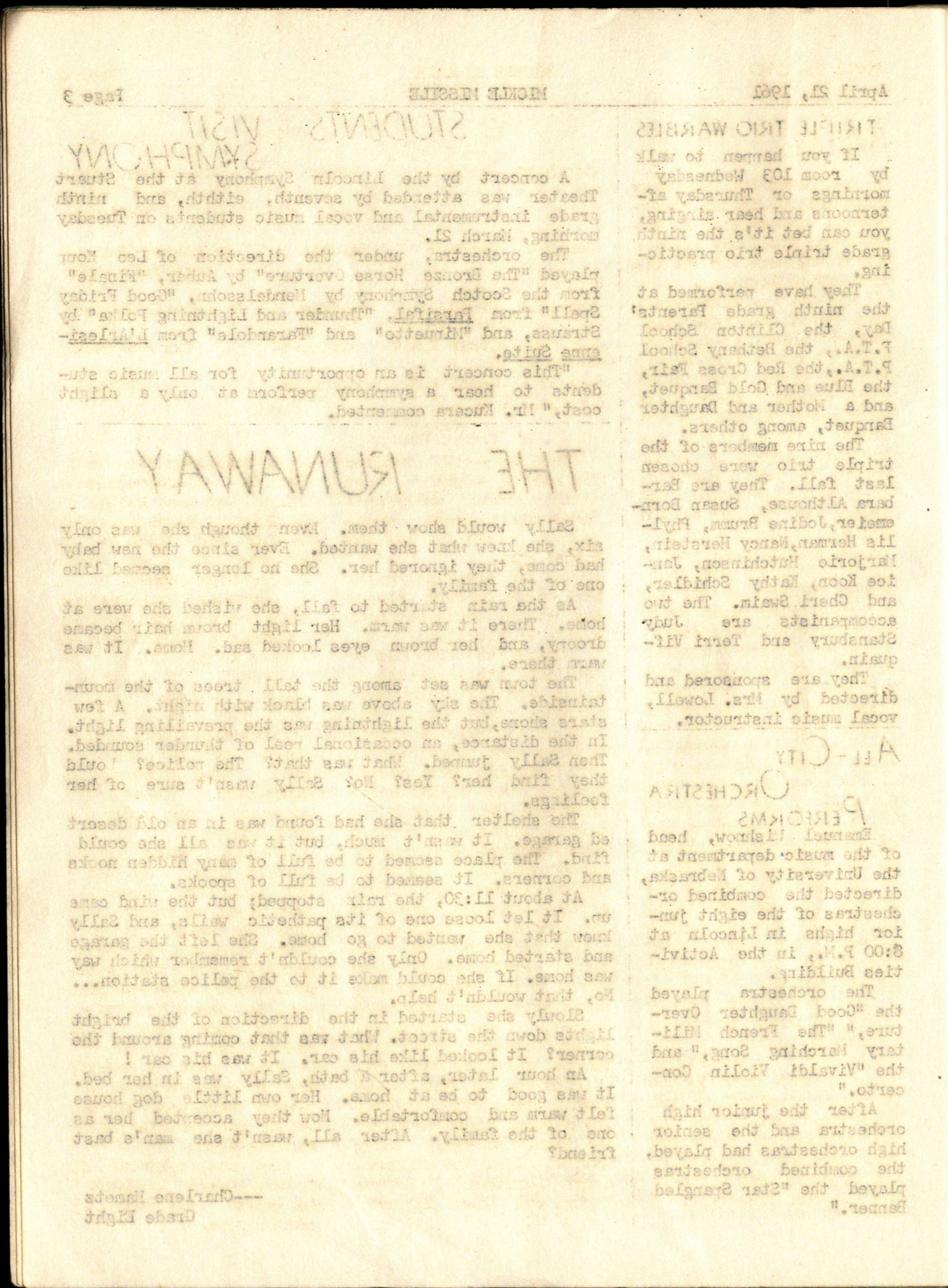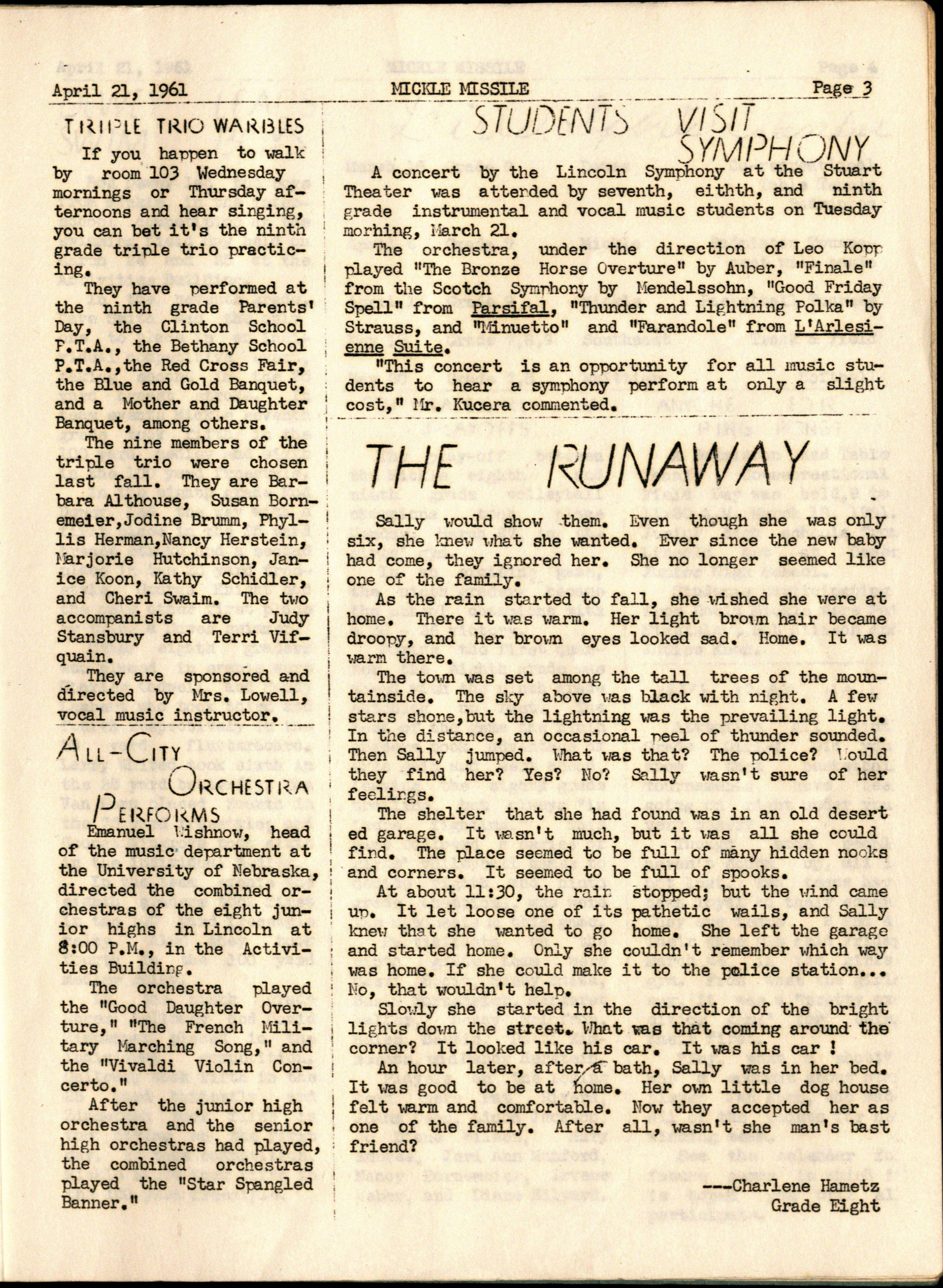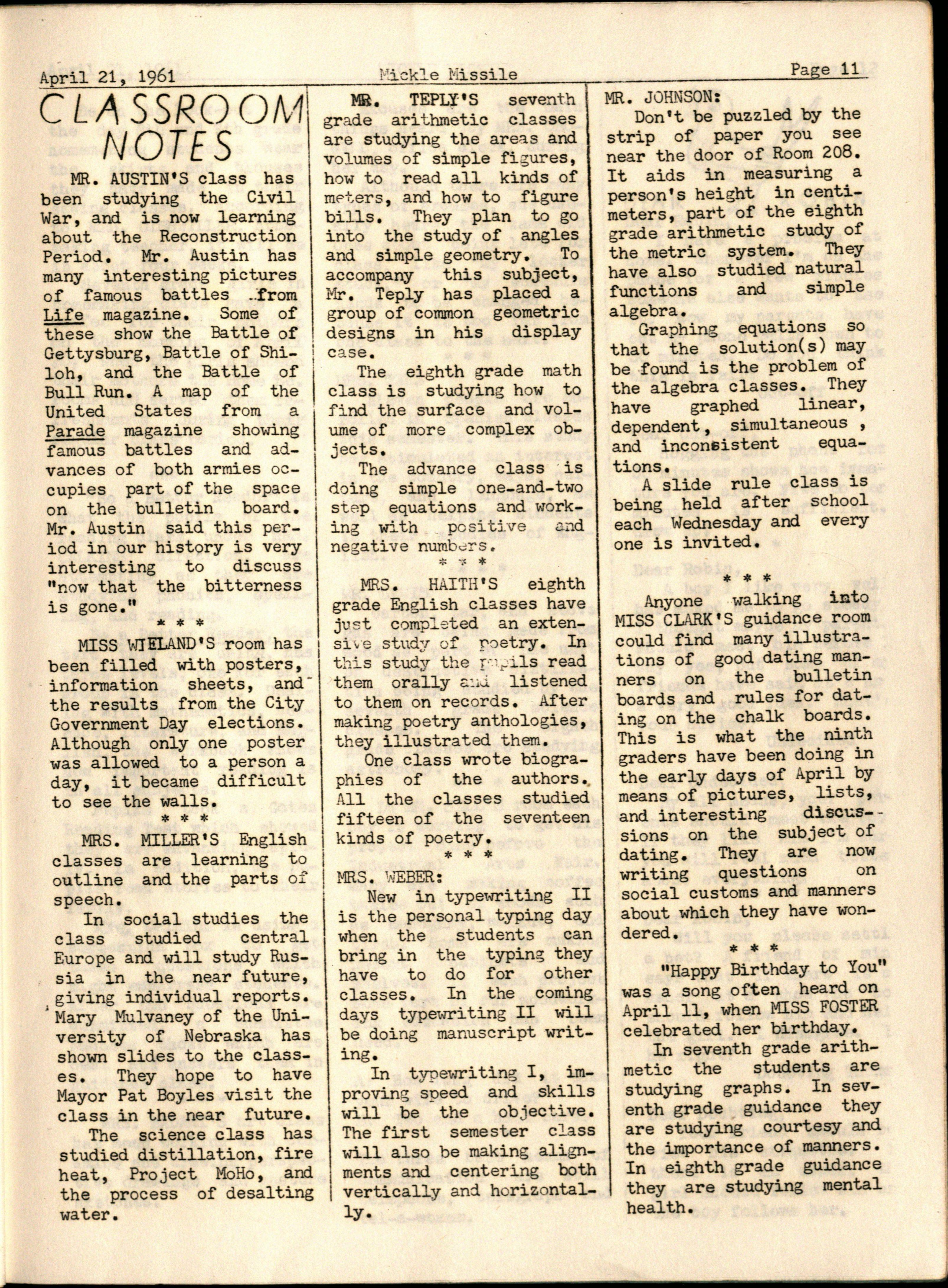 These stories were all written by seventh graders for their newspaper, the Whistle. It is issued once a week in }\rs.Miller's _ English class. The staff includes: Jim Keating, Sue Peterson, Jim Miller, Peg m>ert, ard Larry Thompson. Articles have been contributed by Artyce Olson, Bob Ttaacker, Tom Luedke, Karen Westover,Peggy Ebert, Kay Ferguson, Jacqueline Albrardt, Ruth Mozdzen,and Tom Tethrow.