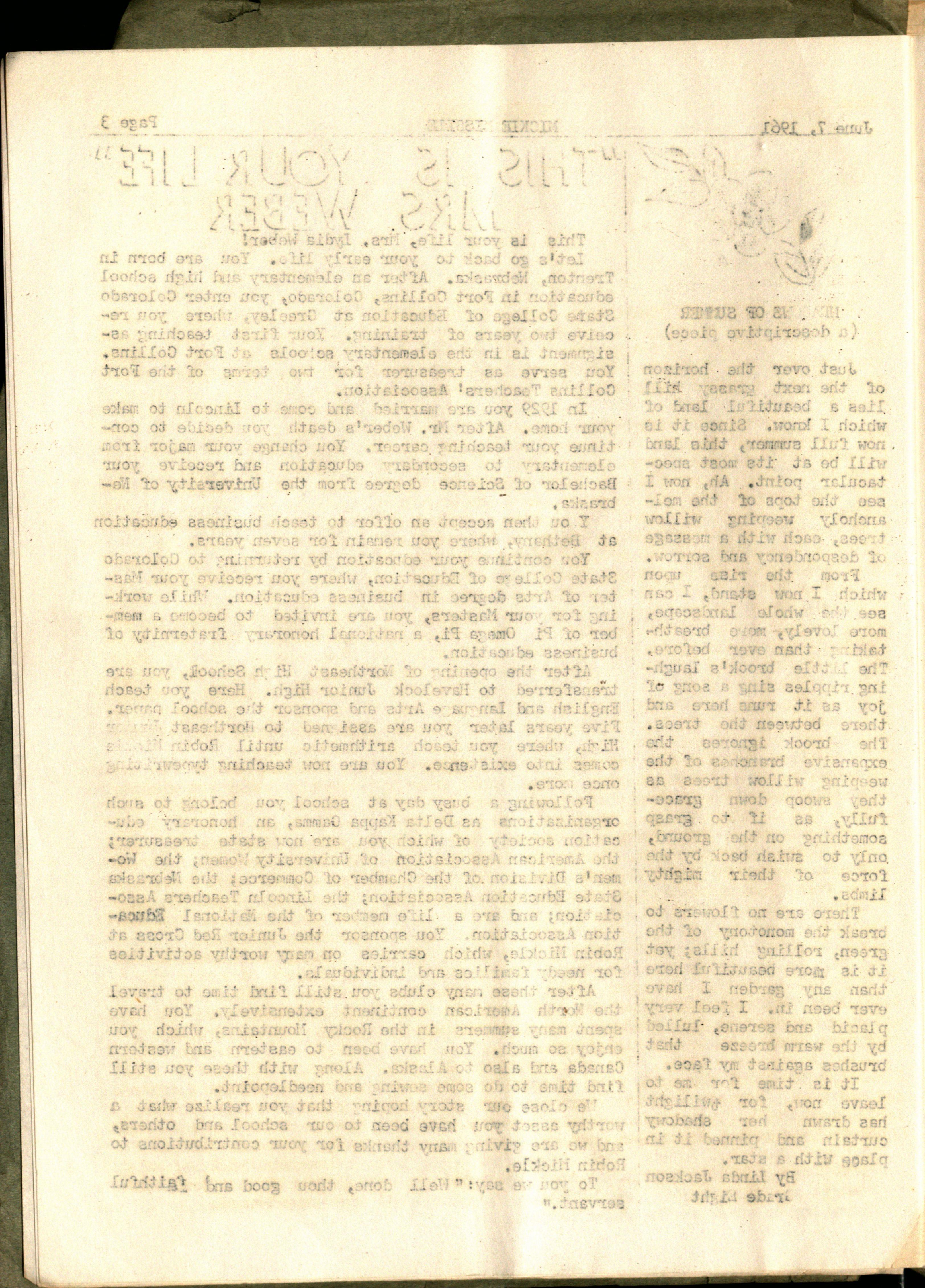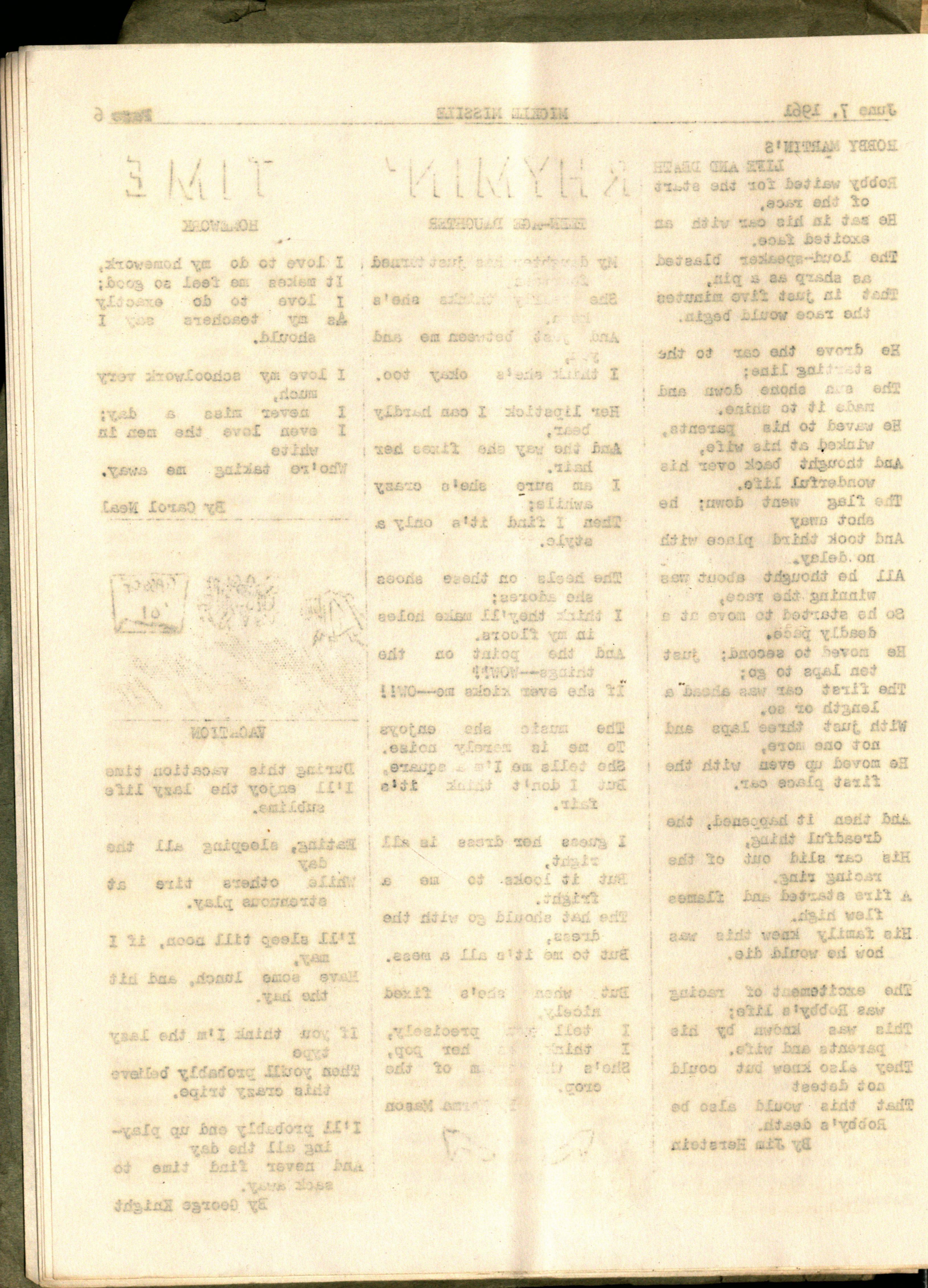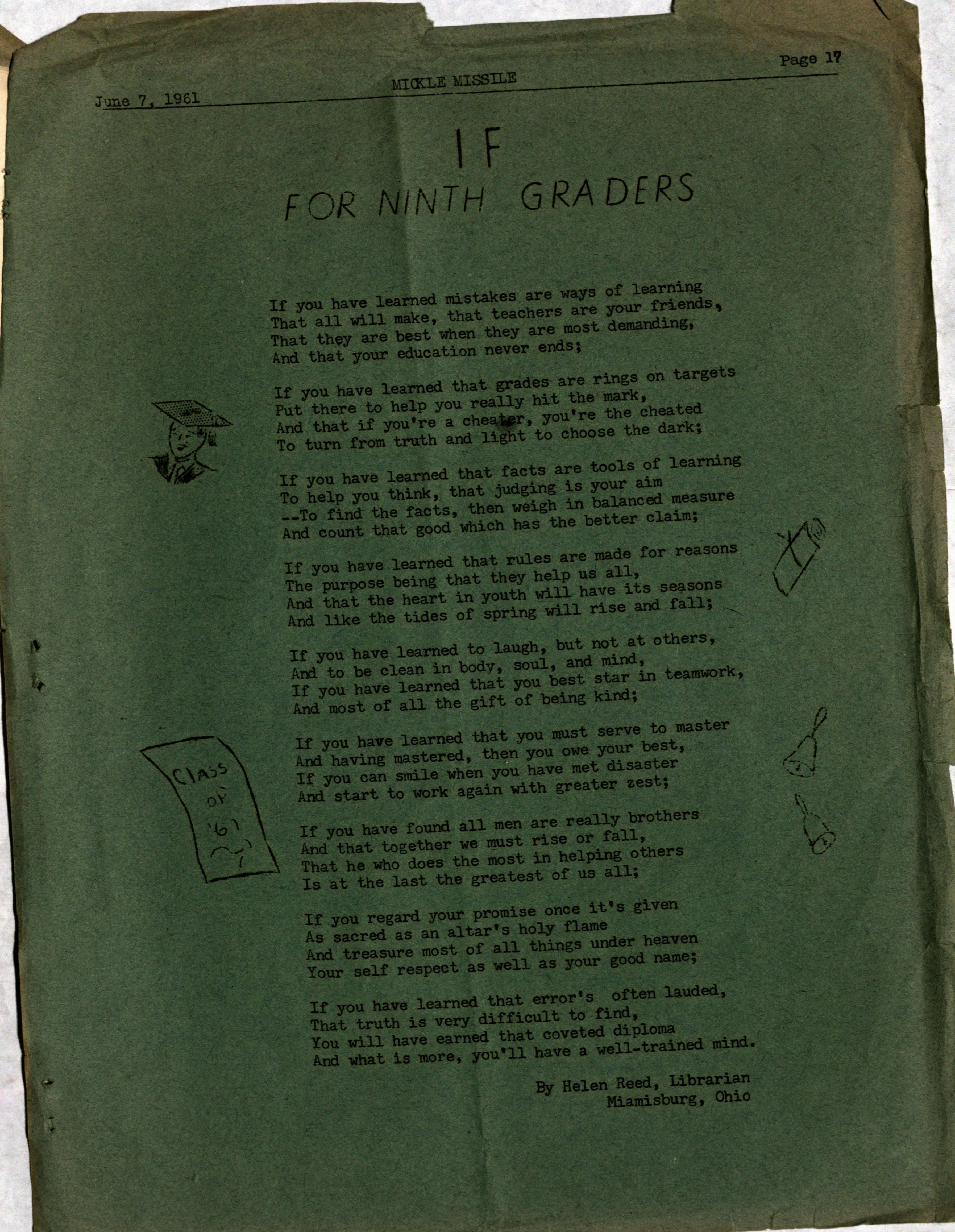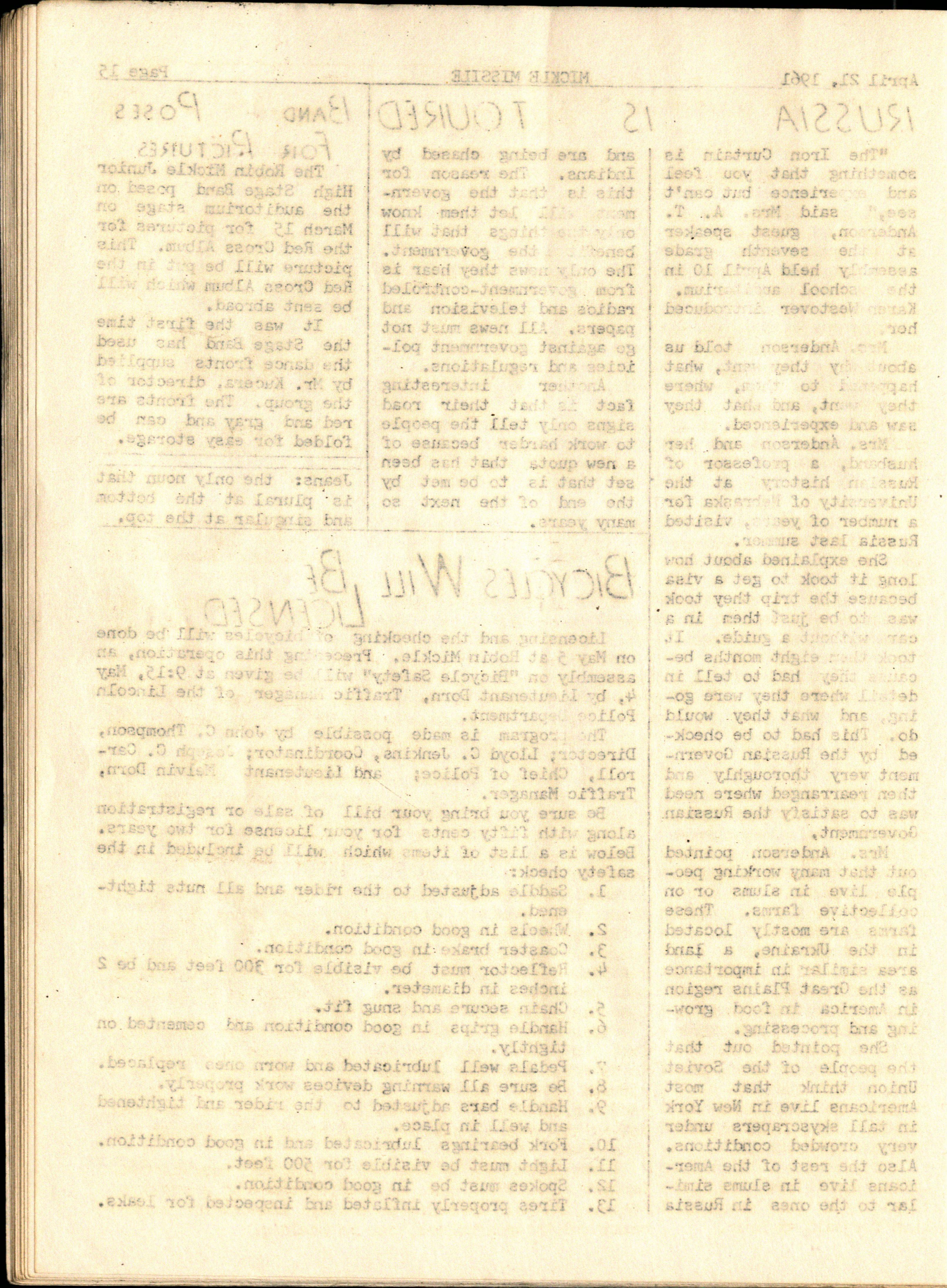 These stories were all written by seventh graders for their newspaper, the Whistle. It is issued once a week in }\rs.Miller's _ English class. The staff includes: Jim Keating, Sue Peterson, Jim Miller, Peg m>ert, ard Larry Thompson. Articles have been contributed by Artyce Olson, Bob Ttaacker, Tom Luedke, Karen Westover,Peggy Ebert, Kay Ferguson, Jacqueline Albrardt, Ruth Mozdzen,and Tom Tethrow.