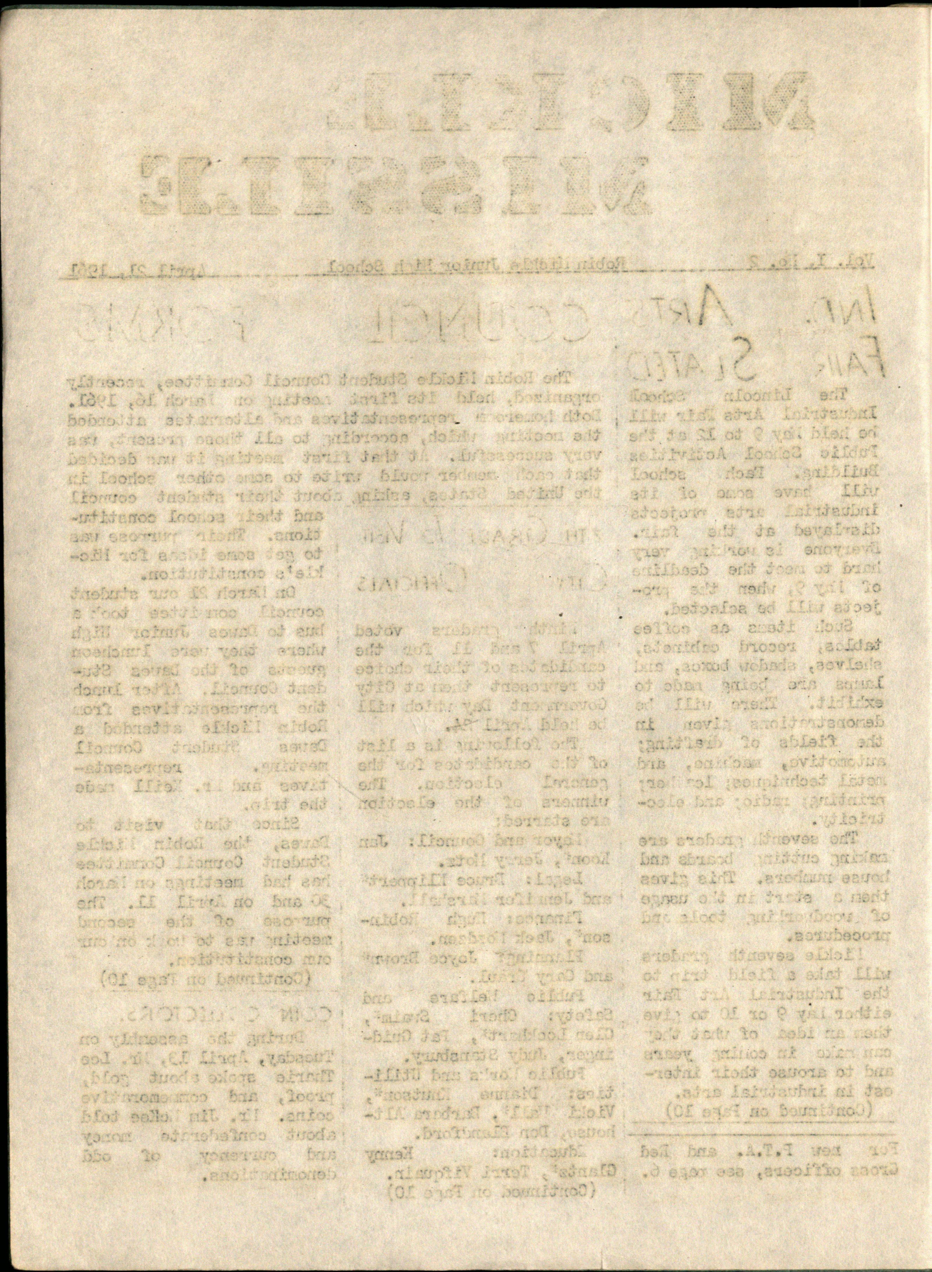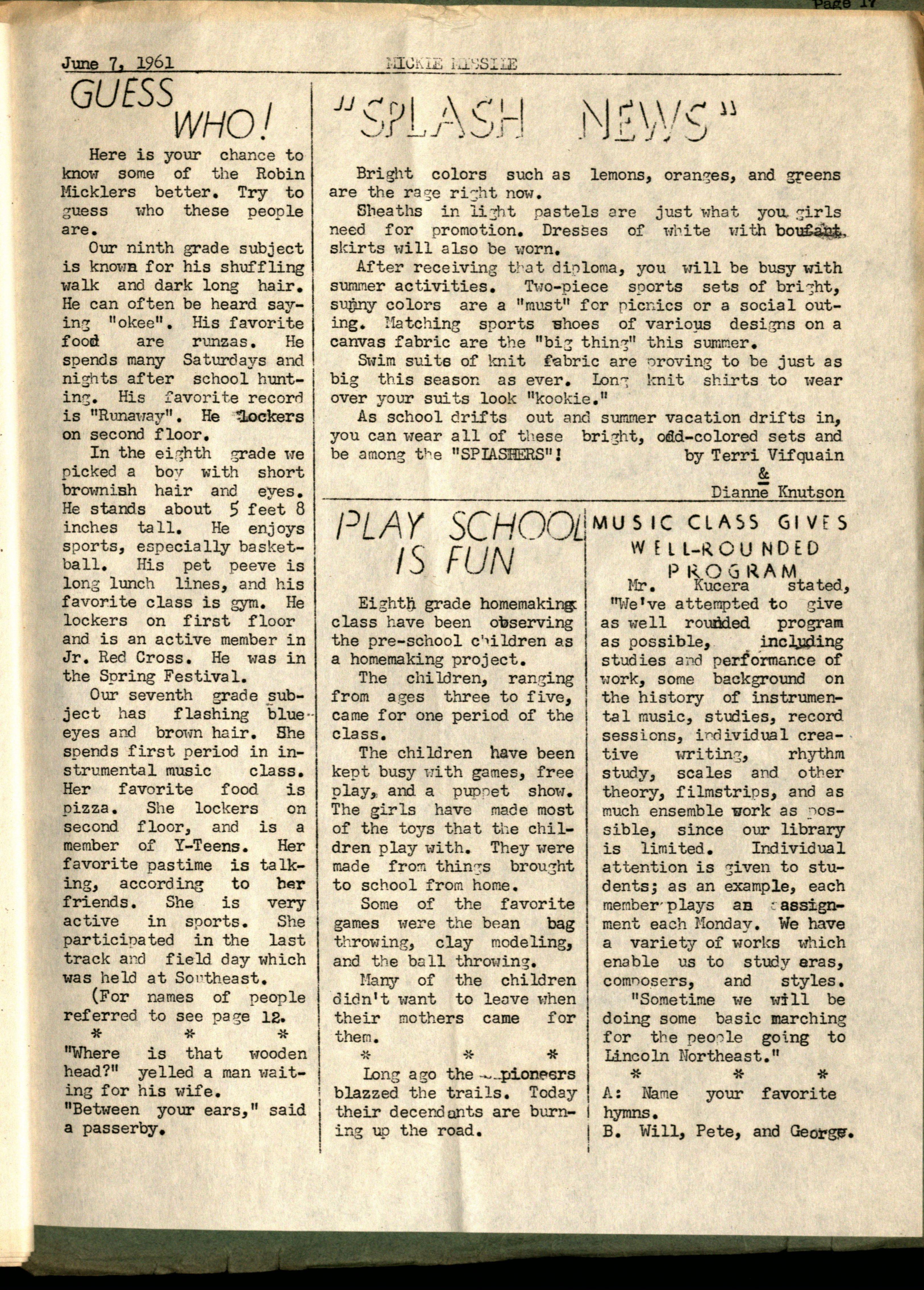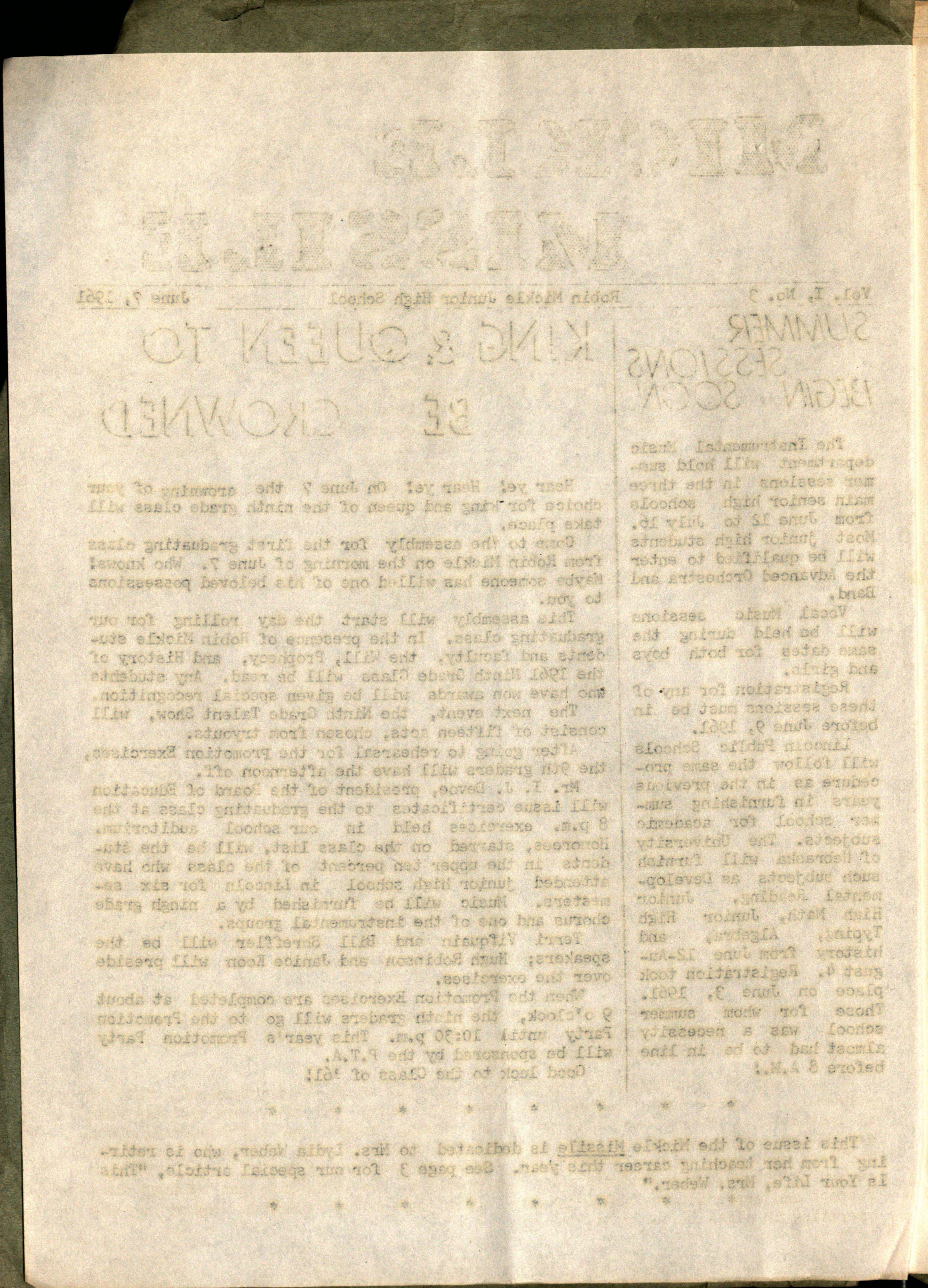 The Robin liickle Student Council Comni ttee, recentJ.y organized, held its firct neeting on liar ch 16, 1961. Both .1or.1eroom representa. ti ves and al terna. tes attended the oeeting which, according to all those present, lm.s very successf\tl.. t that first meeting it was decided that each member uotld urite to some other school in the United States, asking about their student council ;:-- . 1 ·- - ; and their school constitu·/rH G l <.A D E , , \ltc.11 tions. Their pur!'()se uas to flet some idec1 s for l Iic( _) Ff iC t Al S kle~: i:~~:i~t!:• student