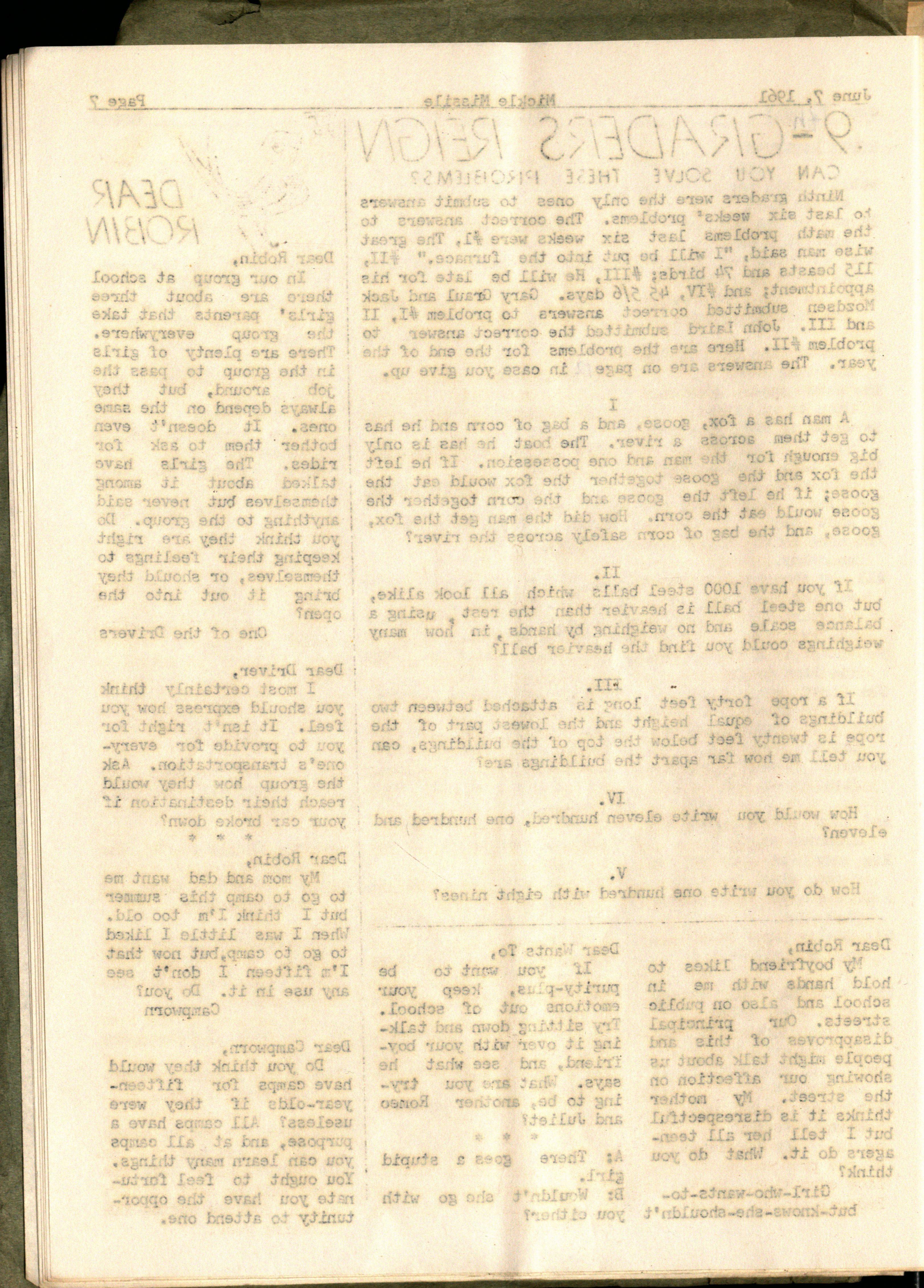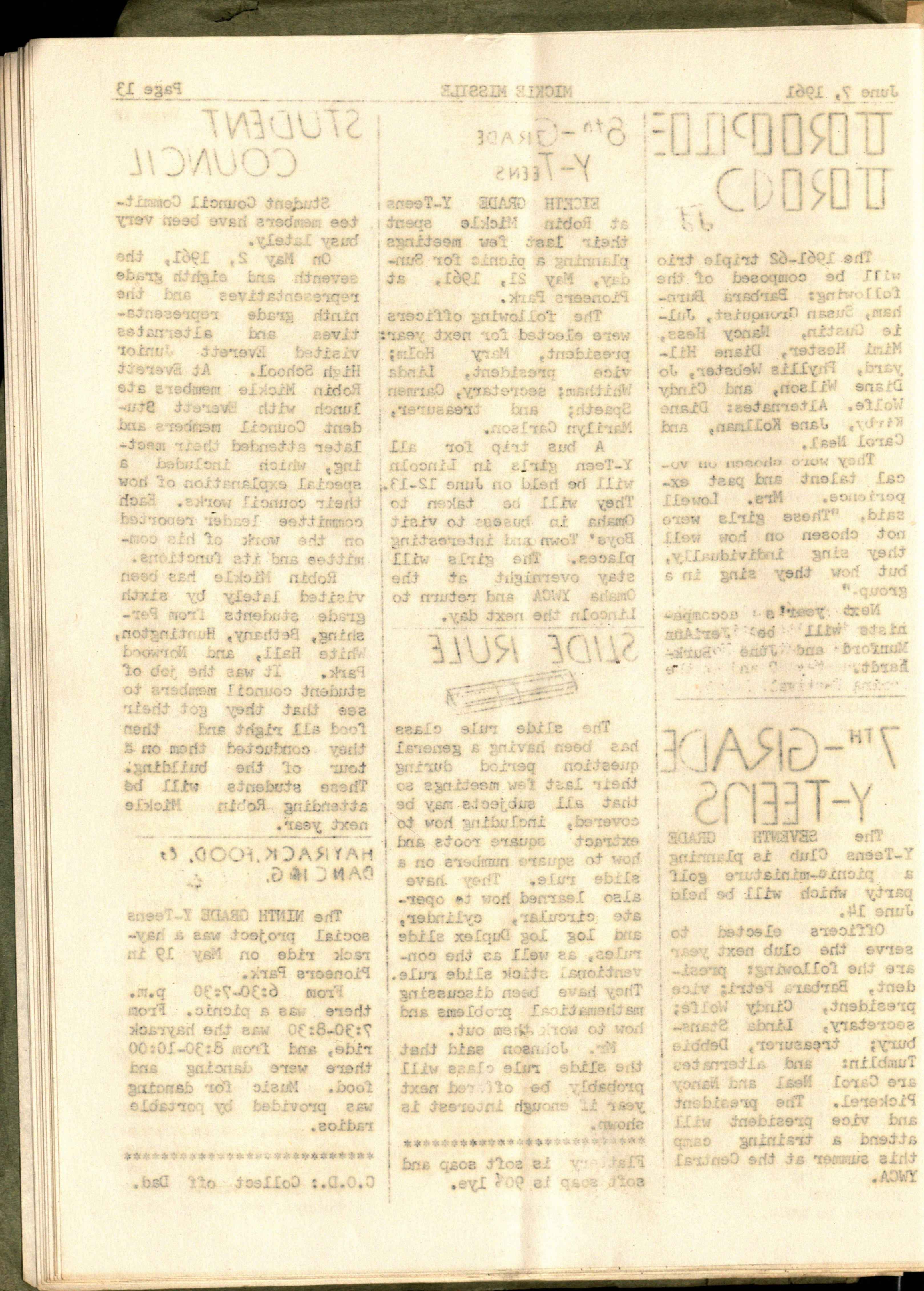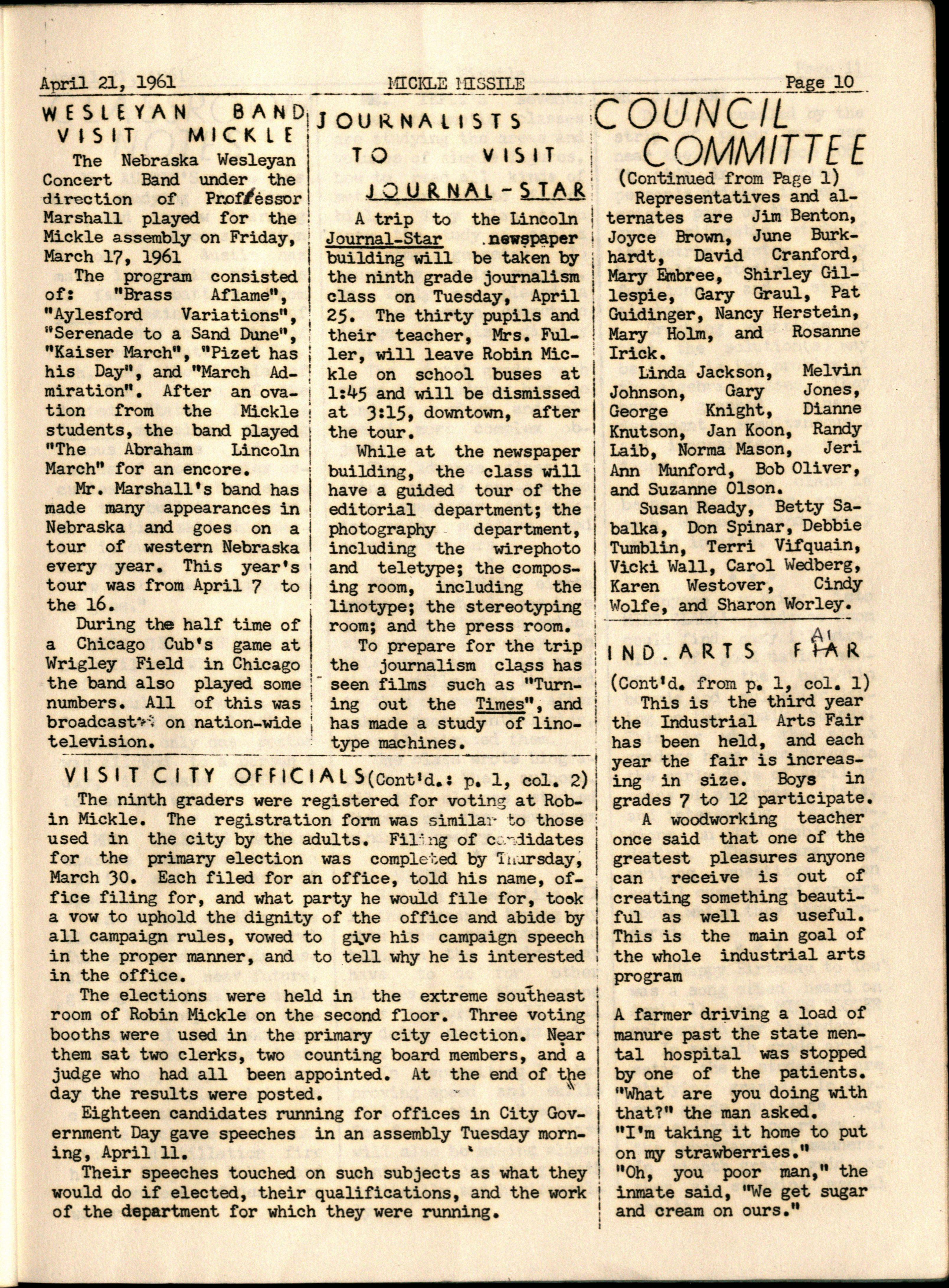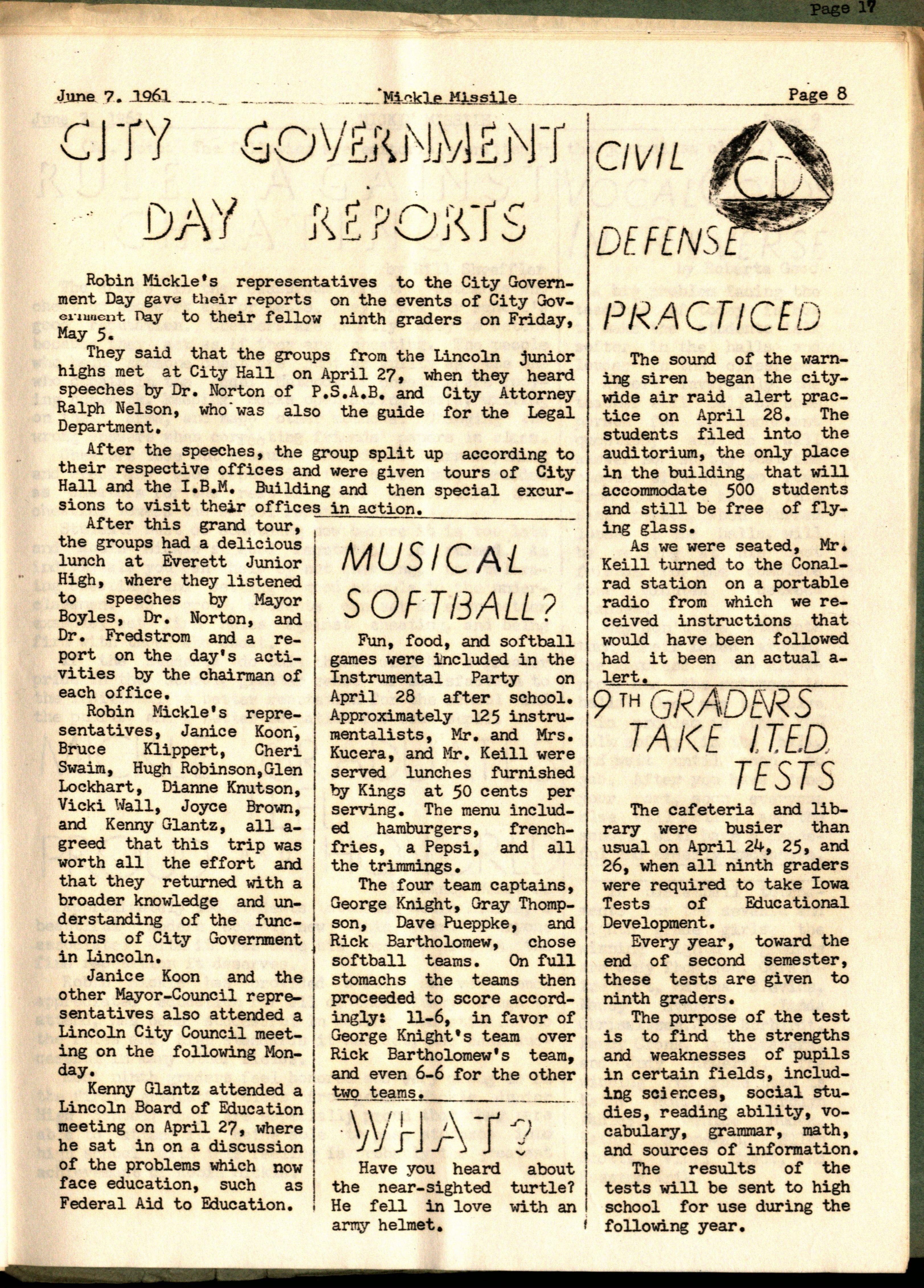 The Robin liickle Student Council Comni ttee, recentJ.y organized, held its firct neeting on liar ch 16, 1961. Both .1or.1eroom representa. ti ves and al terna. tes attended the oeeting which, according to all those present, lm.s very successf\tl.. t that first meeting it was decided that each member uotld urite to some other school in the United States, asking about their student council ;:-- . 1 ·- - ; and their school constitu·/rH G l <.A D E , , \ltc.11 tions. Their pur!'()se uas to flet some idec1 s for l Iic( _) Ff iC t Al S kle~: i:~~:i~t!:• student