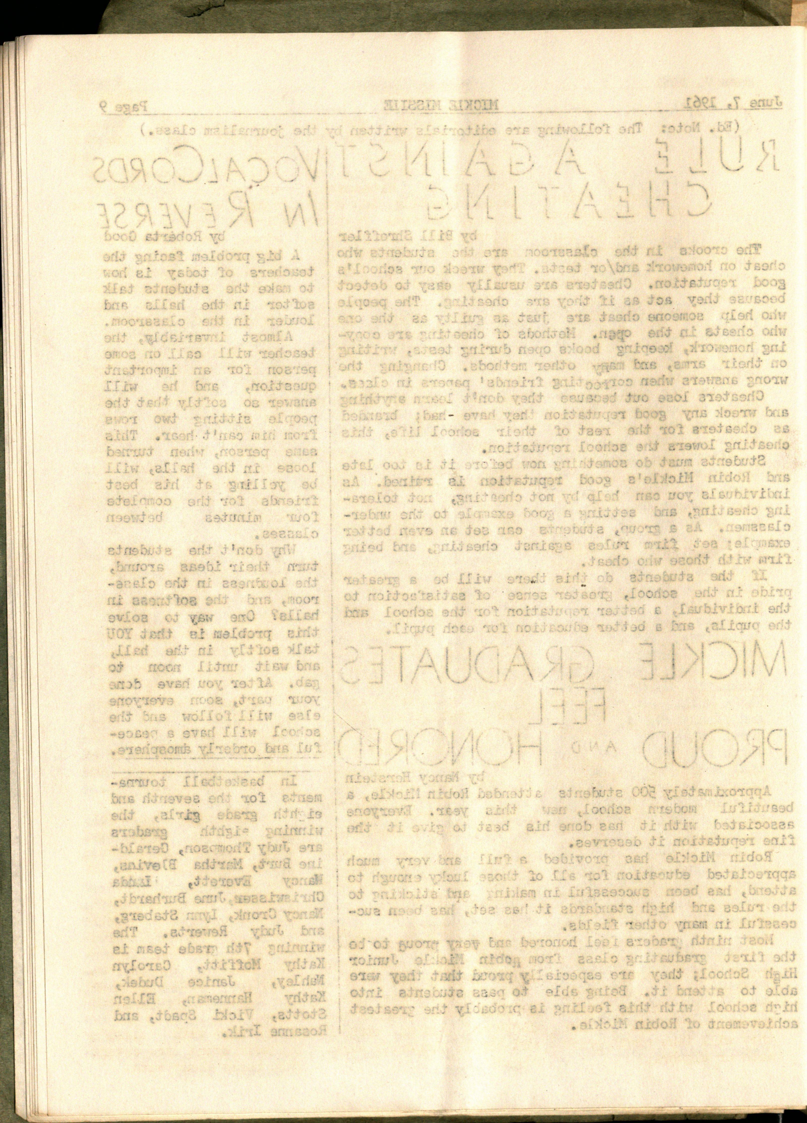 All is quiet, the bugles sourd, and our American flag is raised slowly to its destination, the top of the flagpole. A ceremony similar to this g.oes - on every morning at Robin Mickle. Have you ever thought why we have a flag raising ceremony every morning? We are saluting and honoring a symbol of American Democracy. While the flag is slowly making its climb up - the pol.e~ students - -eyes and minds should be on it, for it is a sign of good patriotism. Is good patriotism toward our country's flag paid by all of the pupils? We can view several students , gazing at a passing car, humming a tune, cracking a huge wad of gum, or finishing their homework during the - flag raising cer~mony. This isn't showing· good patriotism: