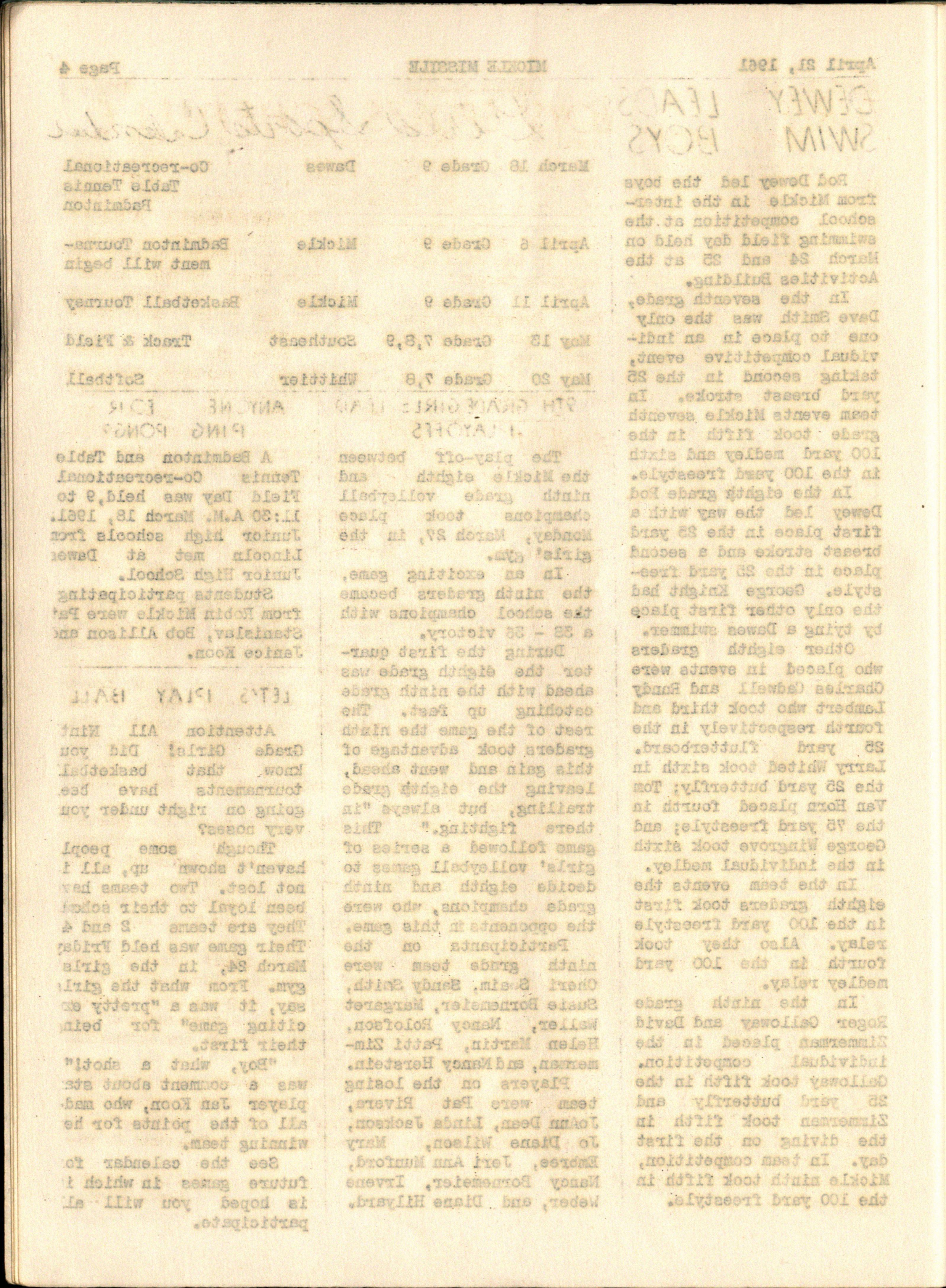 Rod Dewey led the boys trom Mickle 1n the intersohool competition at the · swimming field day held on March 24 and 25 at the Activities Building.