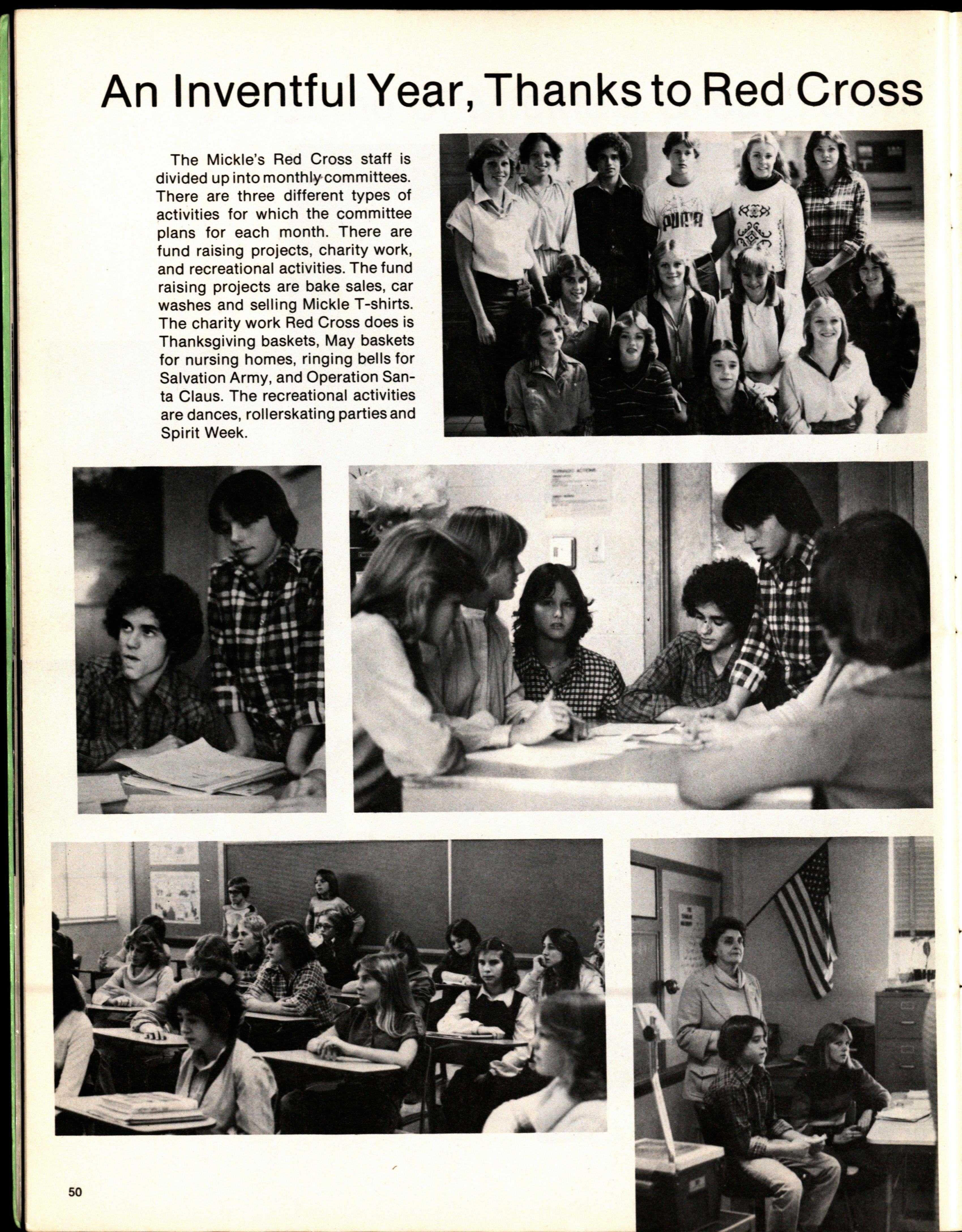 The Mickie ' s Red Cross staff is divided up into monthl y- committees. There are three different types of activities for which the committee plans for each month. There are fund raising projects , charity work , and recreational activities. The fund raising projects are bake sales , car washes and sell i ng Mickle T-shirts. The charity work Red Cross does is Thanksgiving baskets , May baskets for nursing homes , ringing bells for Salvation Army , and Operation Santa Claus The recreational activities are dances , rollerskating parties and Spirit Week