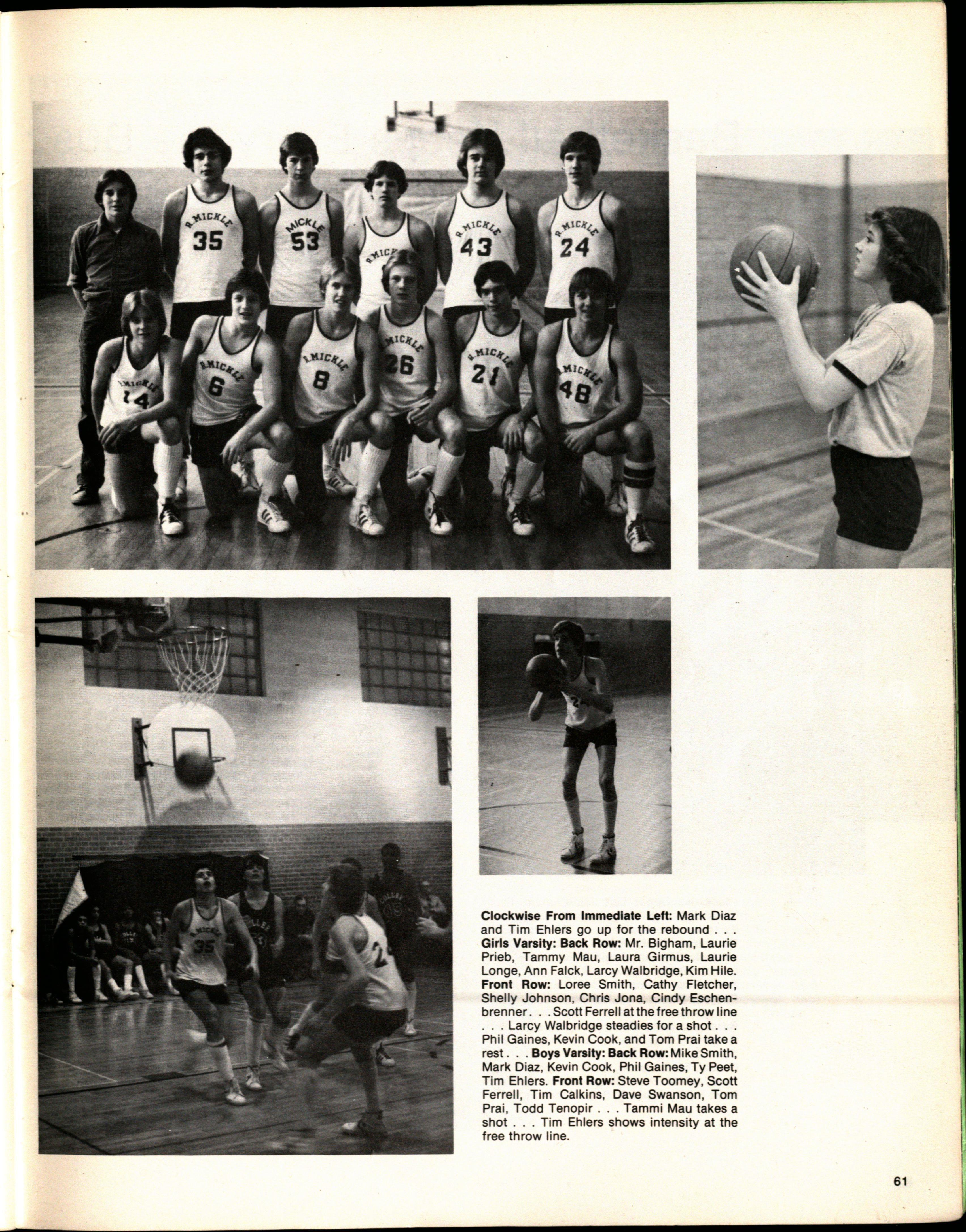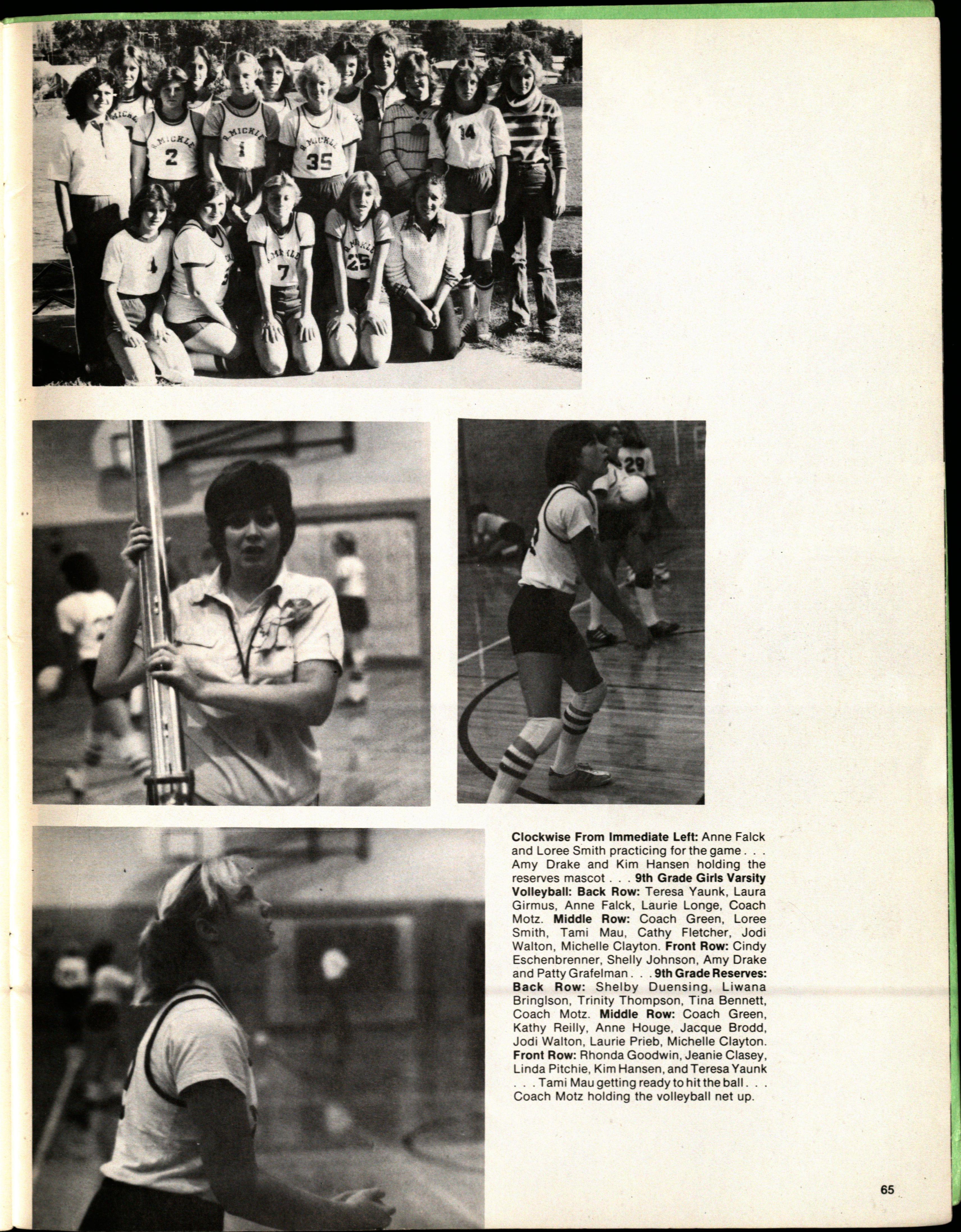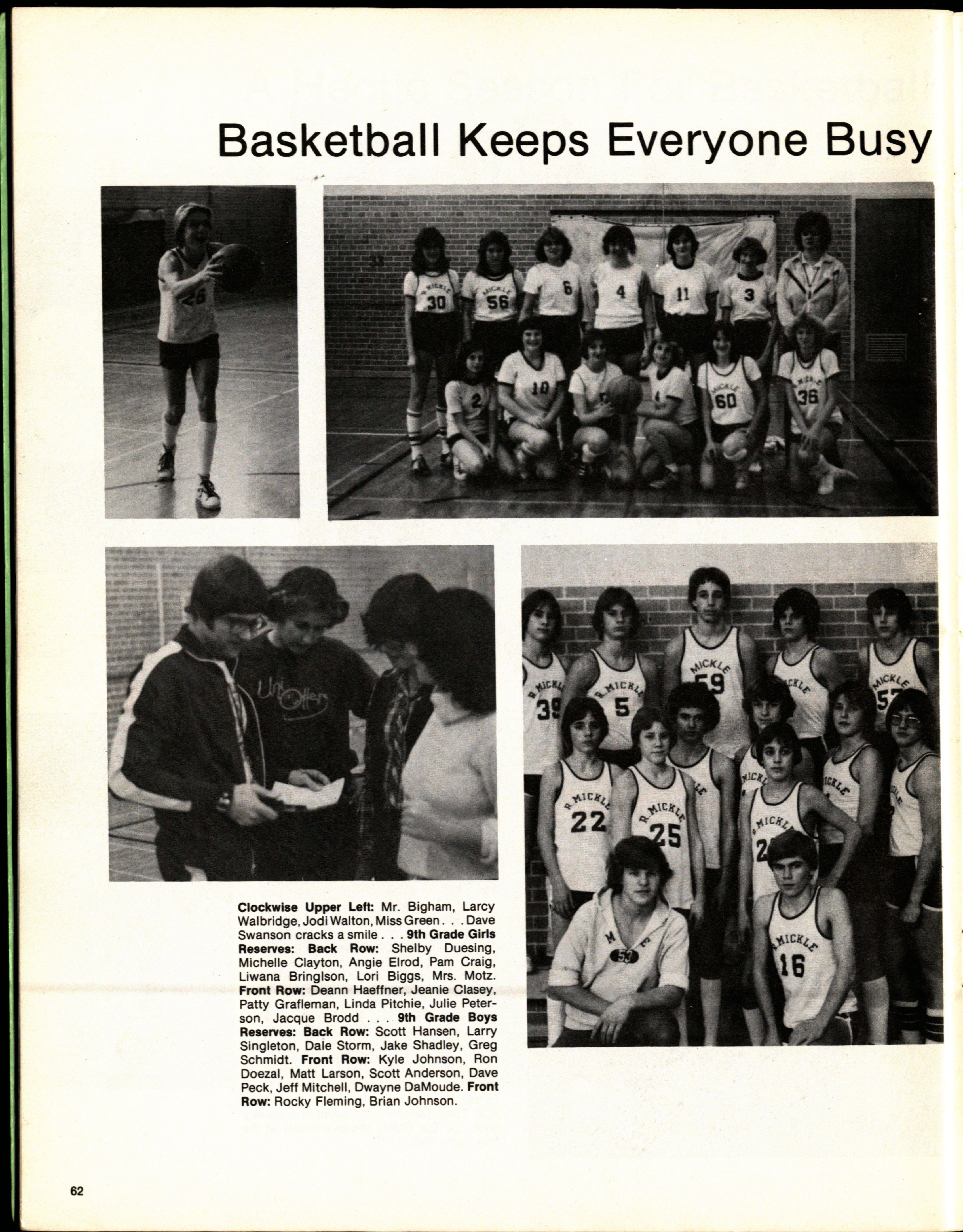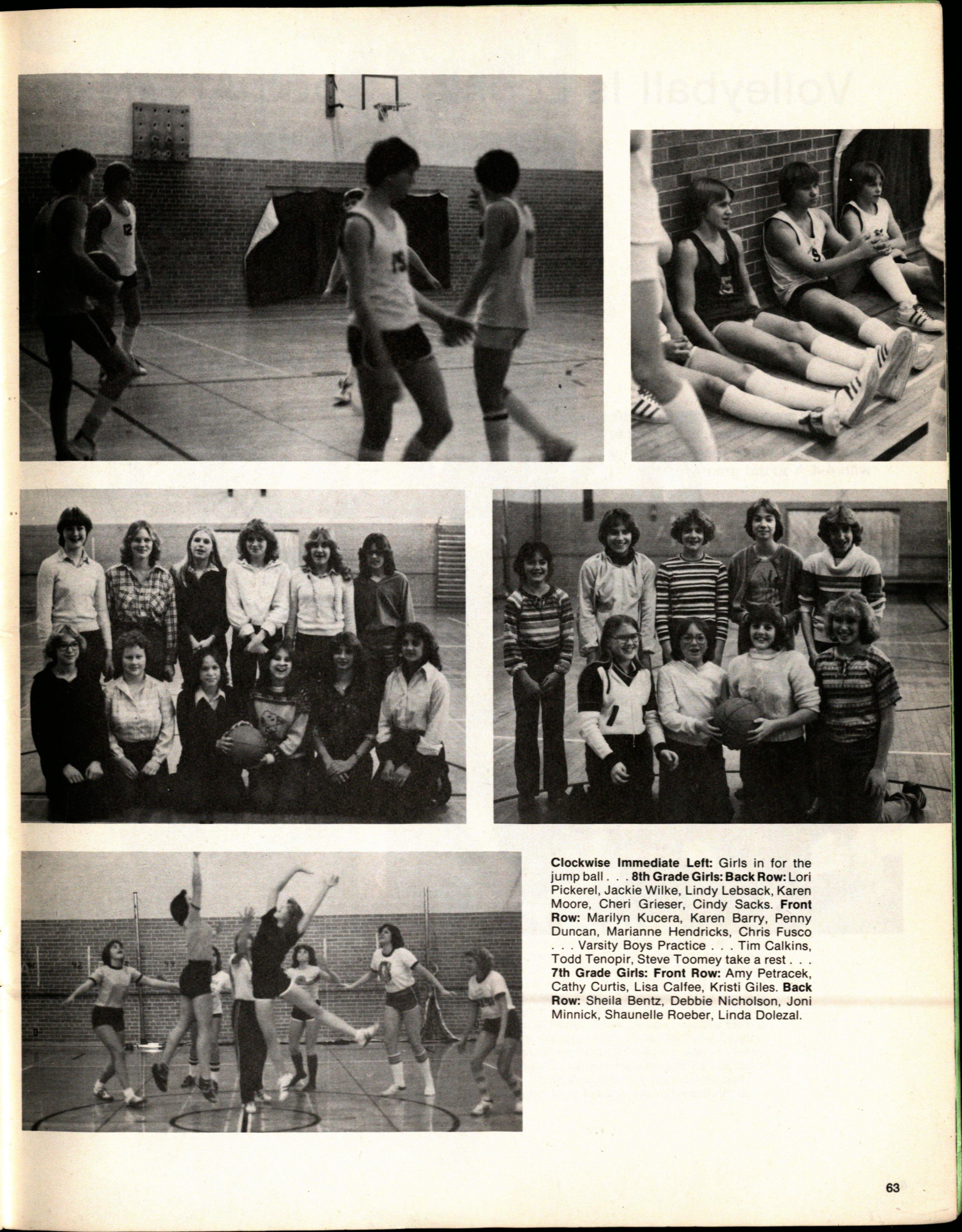 Clockwise Immediate Left: Girls in for the jump ball 8th Grade Girls: Back Row: Lori Pickerel, Jackie Wilke, Lindy Lebsack, Karen Moore , Cheri Grieser , C indy Sacks Front Row: Marilyn Kucera , Karen Barry , Penny Duncan , Marianne Hendricks , Chris Fusco
