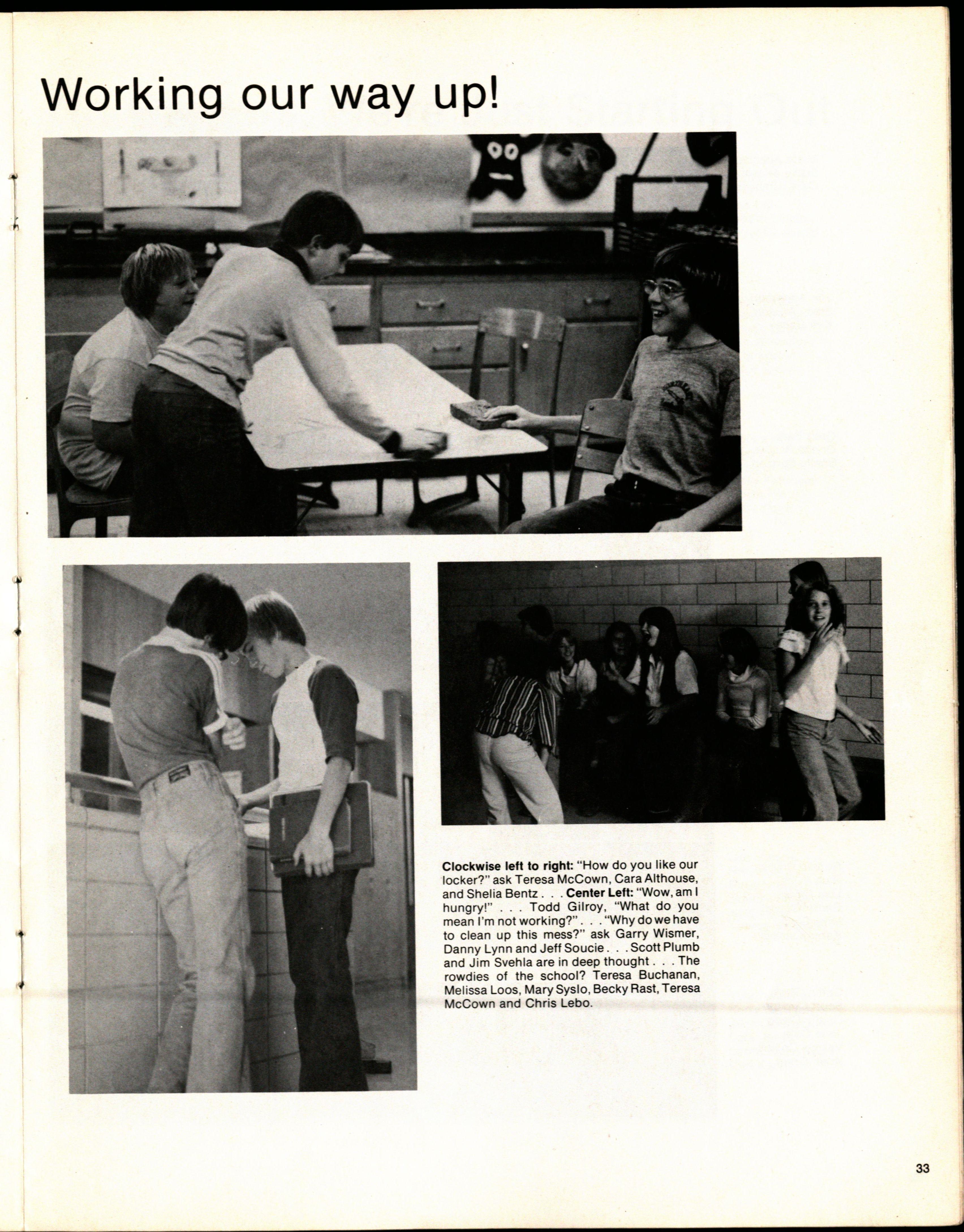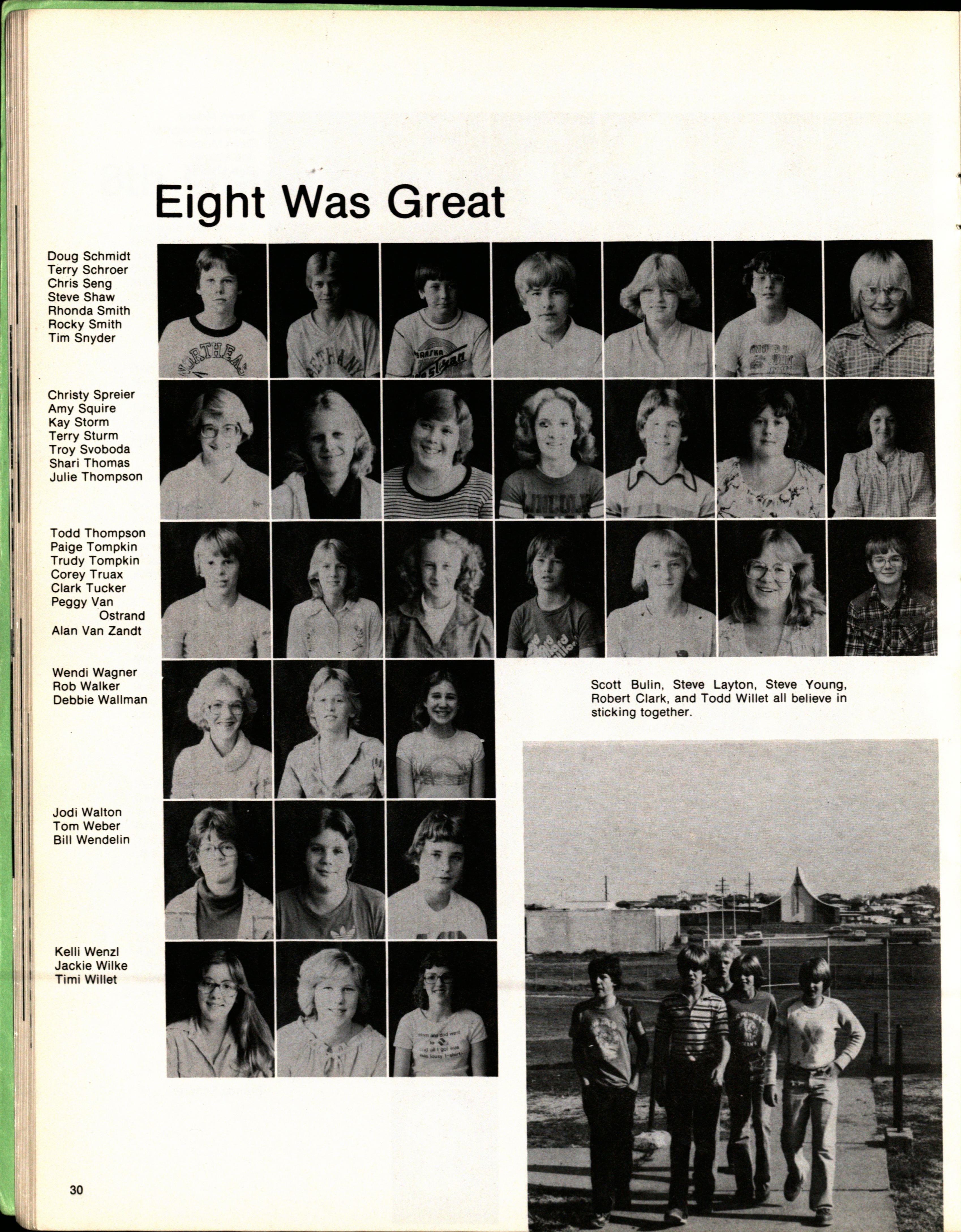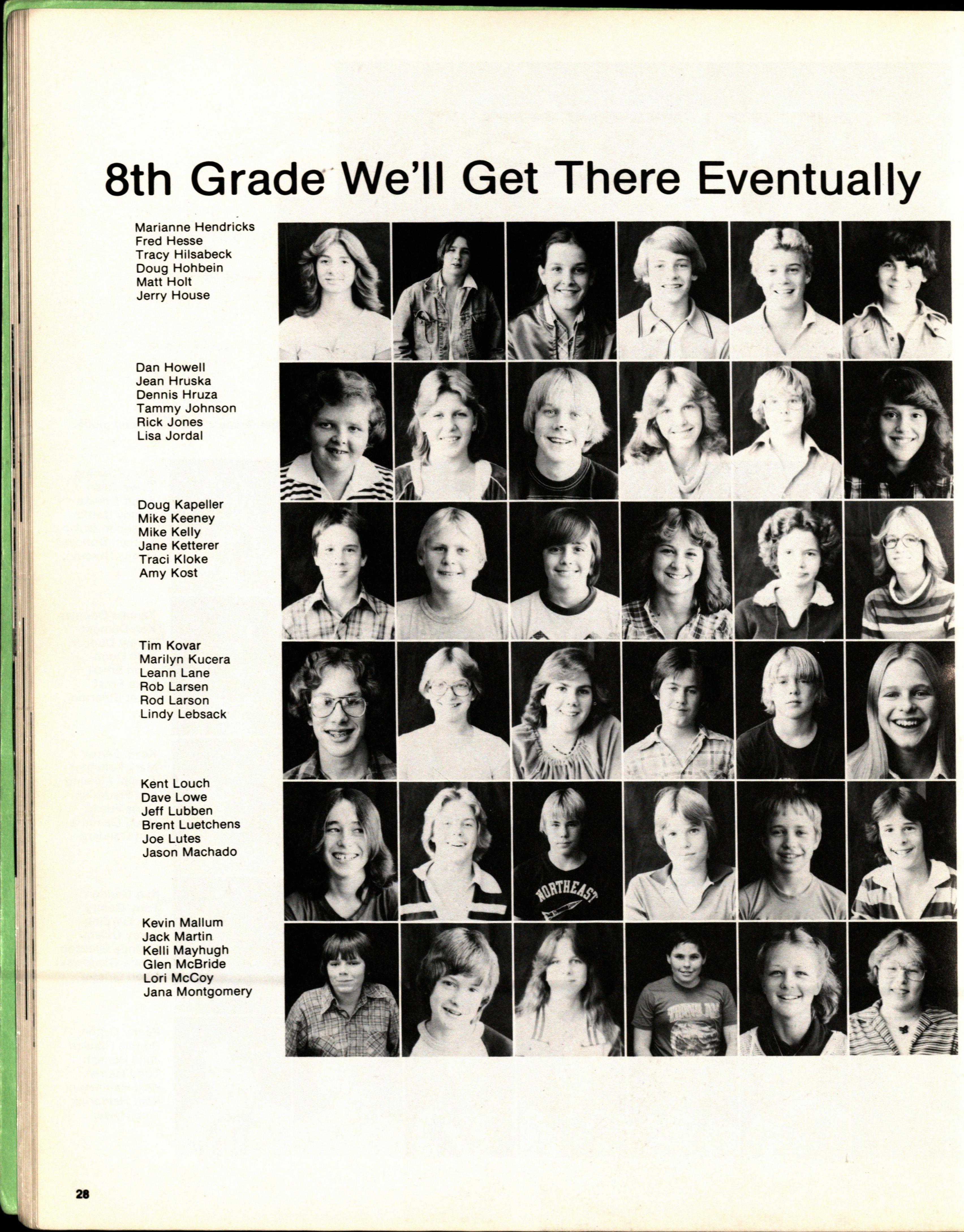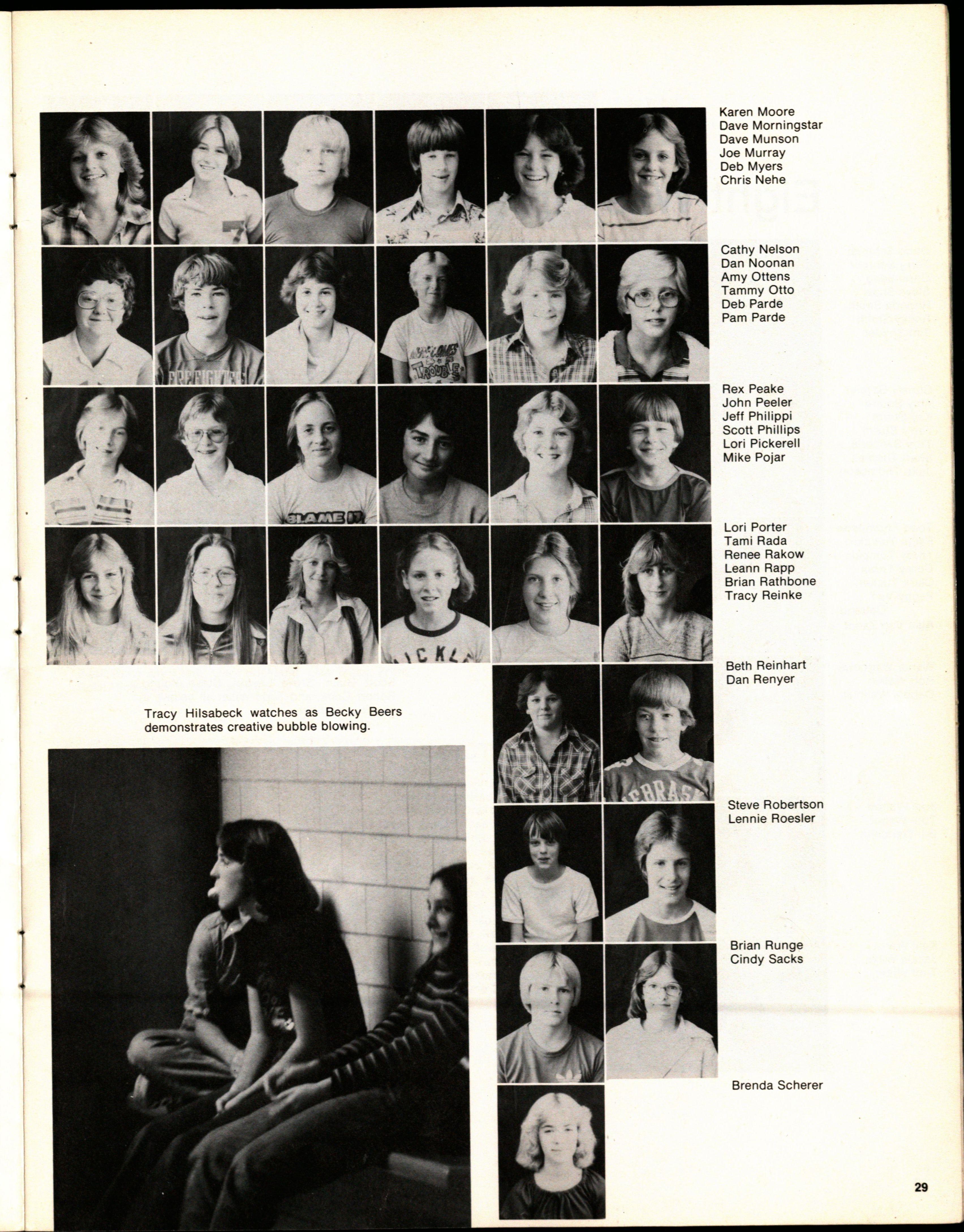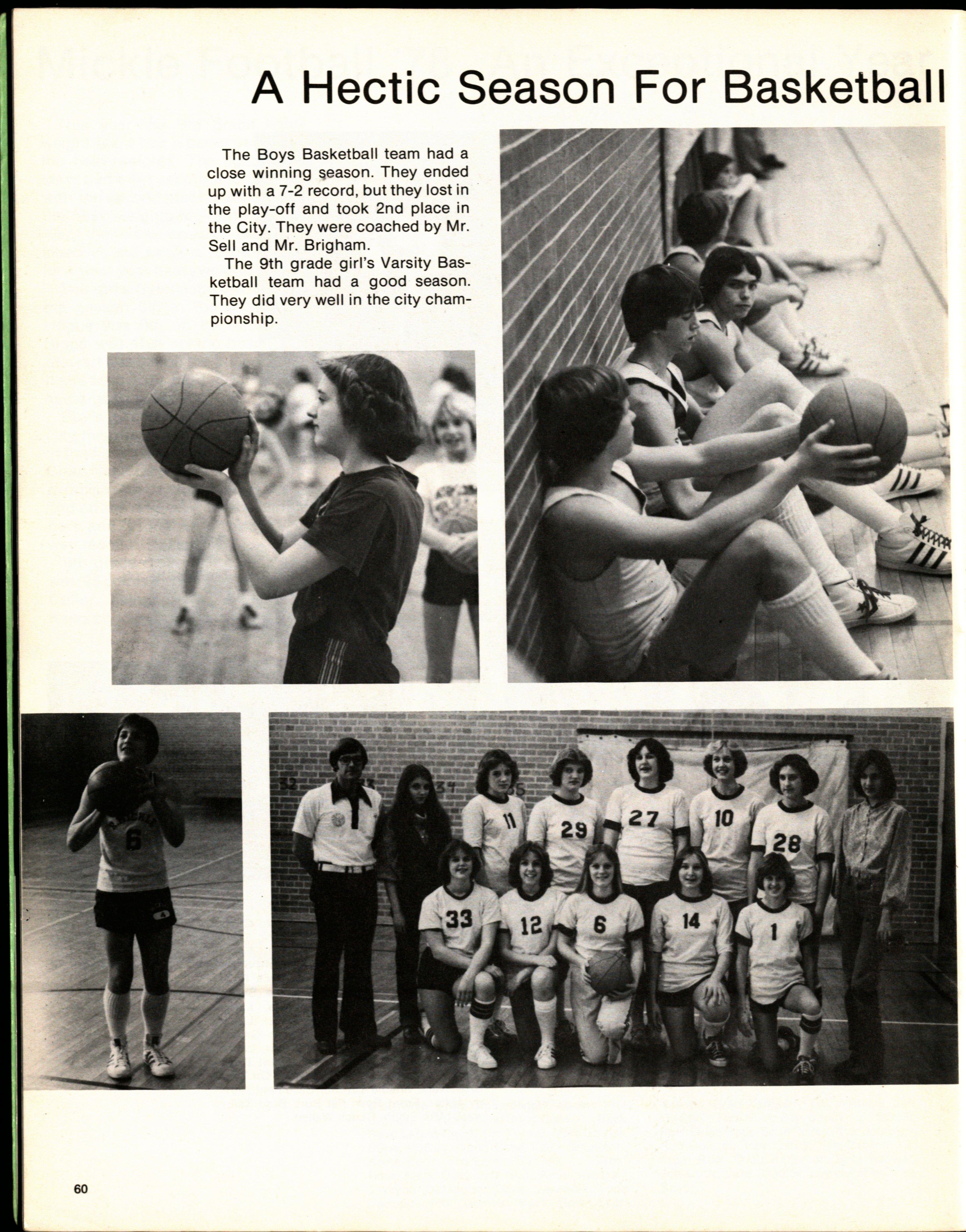Clockwise Immediate Left: Girls in for the jump ball 8th Grade Girls: Back Row: Lori Pickerel, Jackie Wilke, Lindy Lebsack, Karen Moore , Cheri Grieser , C indy Sacks Front Row: Marilyn Kucera , Karen Barry , Penny Duncan , Marianne Hendricks , Chris Fusco