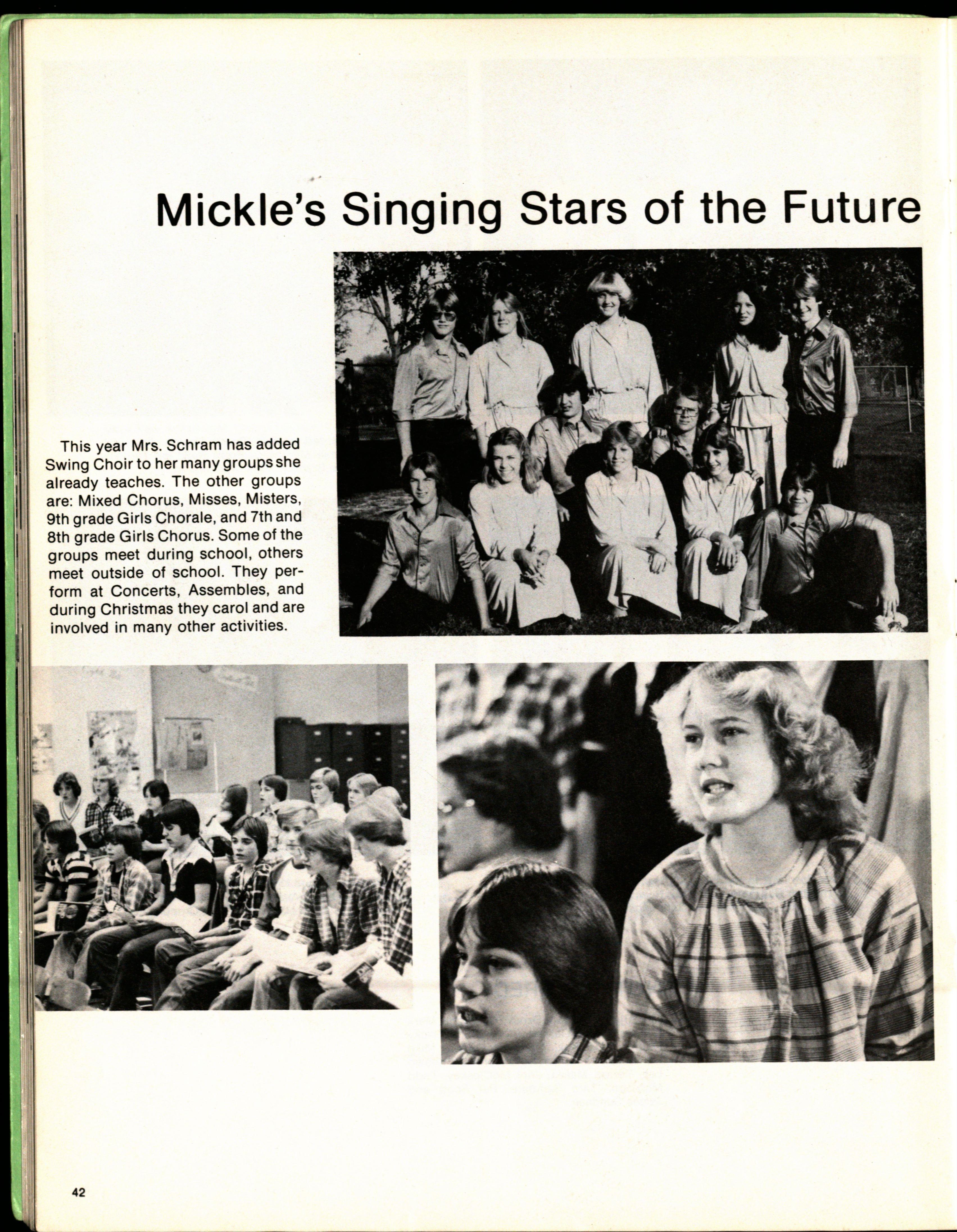 This year Mrs. Schram has added Swing Choir to her many groups she already teaches. The other groups are: Mixed Chorus , Misses, Misters , 9th grade Girls Chorale , and 7th and 8th grade Girls Chorus. Some of the groups meet during school, others meet outside of school. They perform at Concerts , Assembles , and during Christmas they carol and are involved in many other activities.