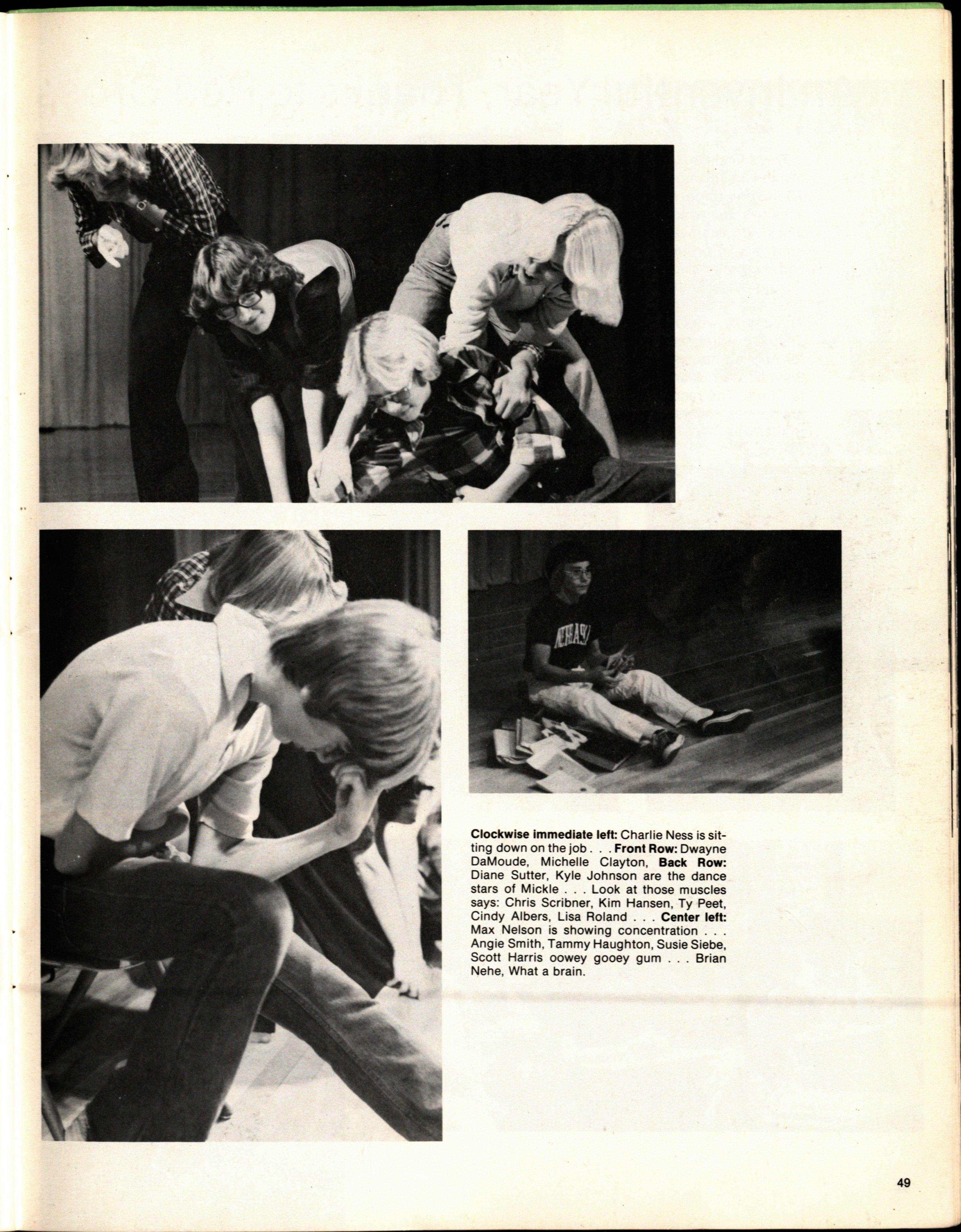 Clockwise immediate left: Charlie Ness is sitting down on the job Front Row: Dwayne DaMoude , Michelle Clayton, Back Row: Diane Sutter , Kyle Johnson are the dance stars of Mickle Look at those muscles says : Chris Scribner , Kirn Hansen , Ty Peet , C in dy Albers , Lisa Roland Center left: Max Nelson is show i ng concentration Angie Smith , Tammy Haughton , Susie Siebe, Scott Harris oowey gooey gum Brian Nehe , What a brain.