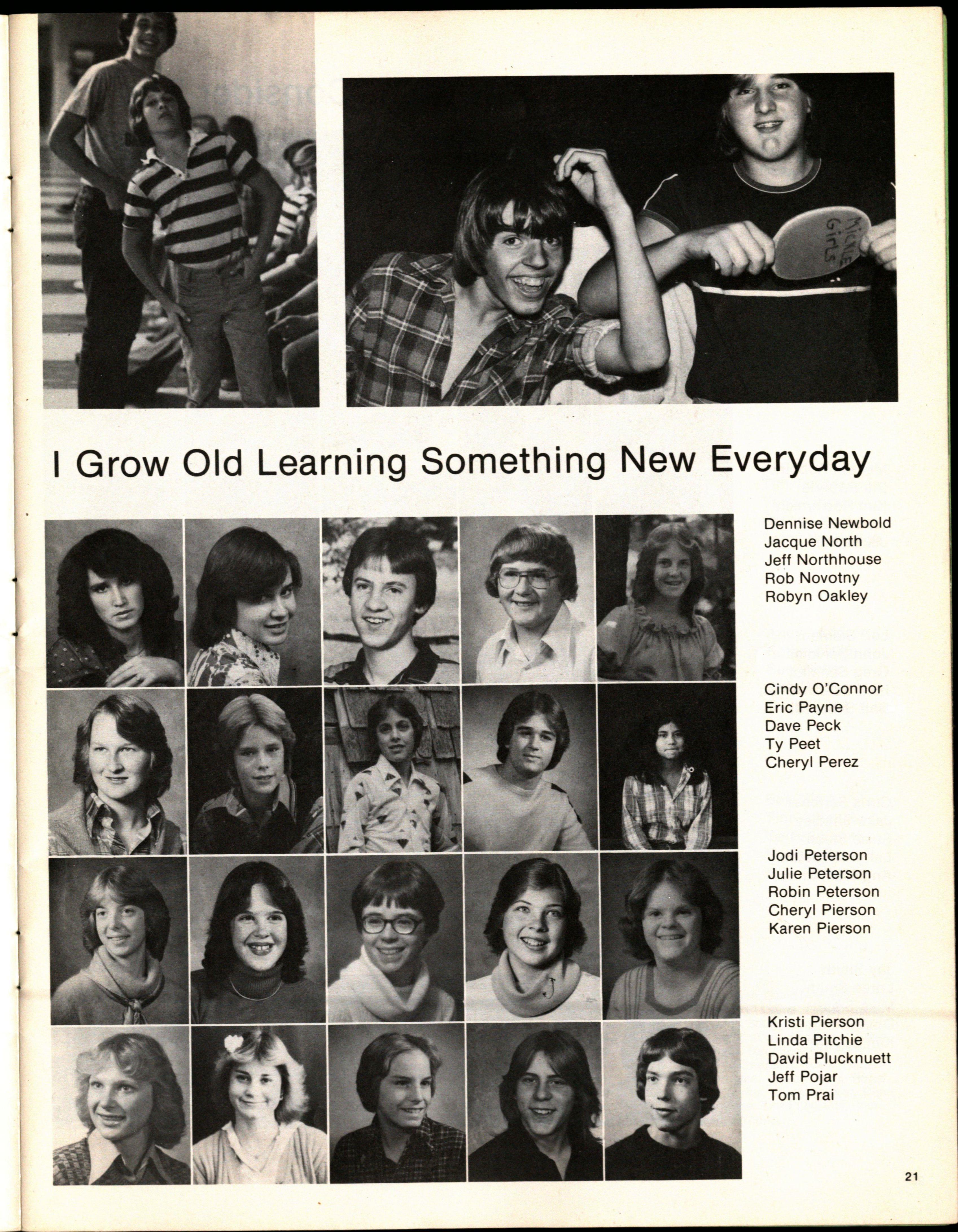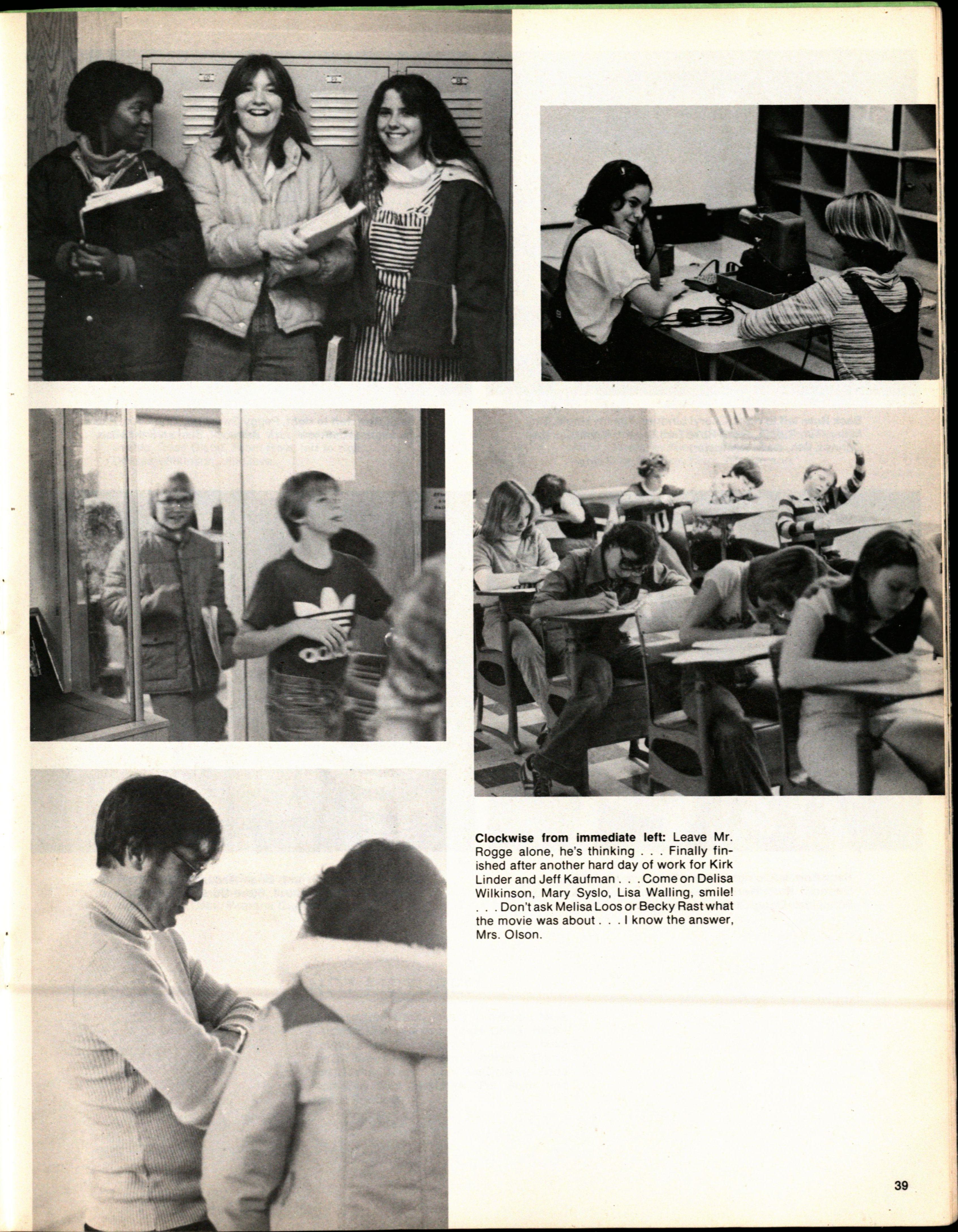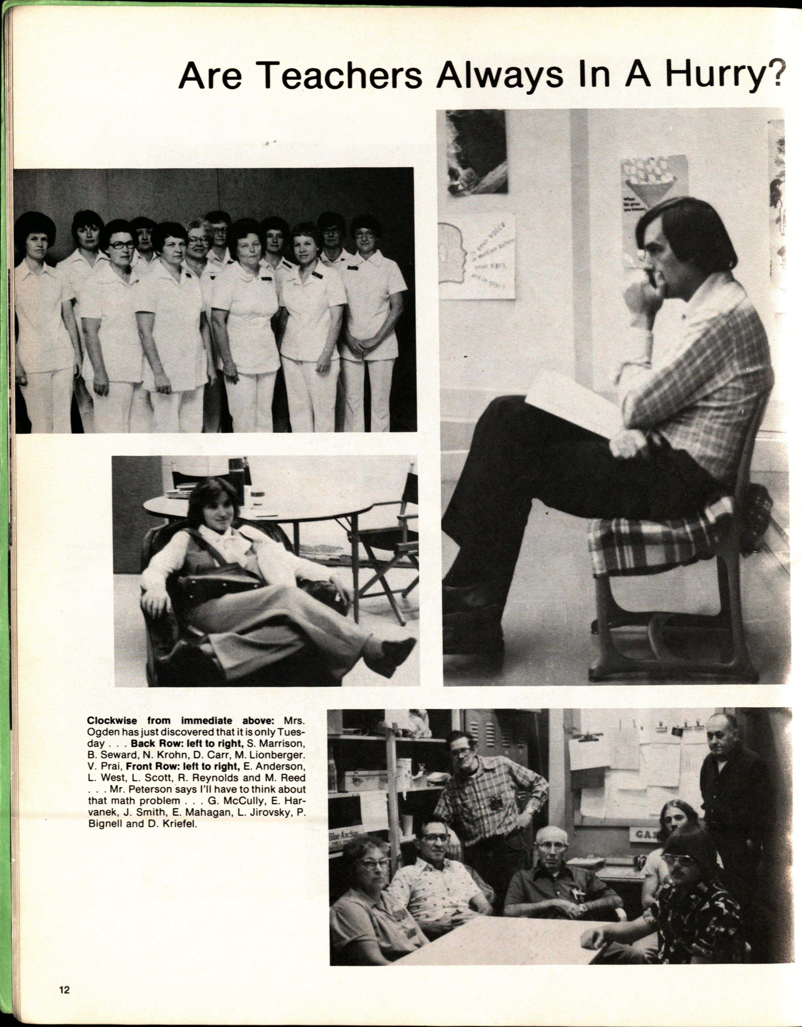 Clockwise from immediate above: Mrs Ogden has just d i scovered that i t is only Tuesday Back Row: left to right, S Marrison , B Seward , N Krohn , D Carr , M . Lionberger V Pra i , Front Row: left to right, E. Anderson , L. West , L. Scott , R. Reynolds and M. Reed Mr Peterson says I ' ll have to think about that math problem G McCully , E. Harvanek , J Sm i th , E. Mahagan , L. J i rovsky , P Bignell and D Kriefel.