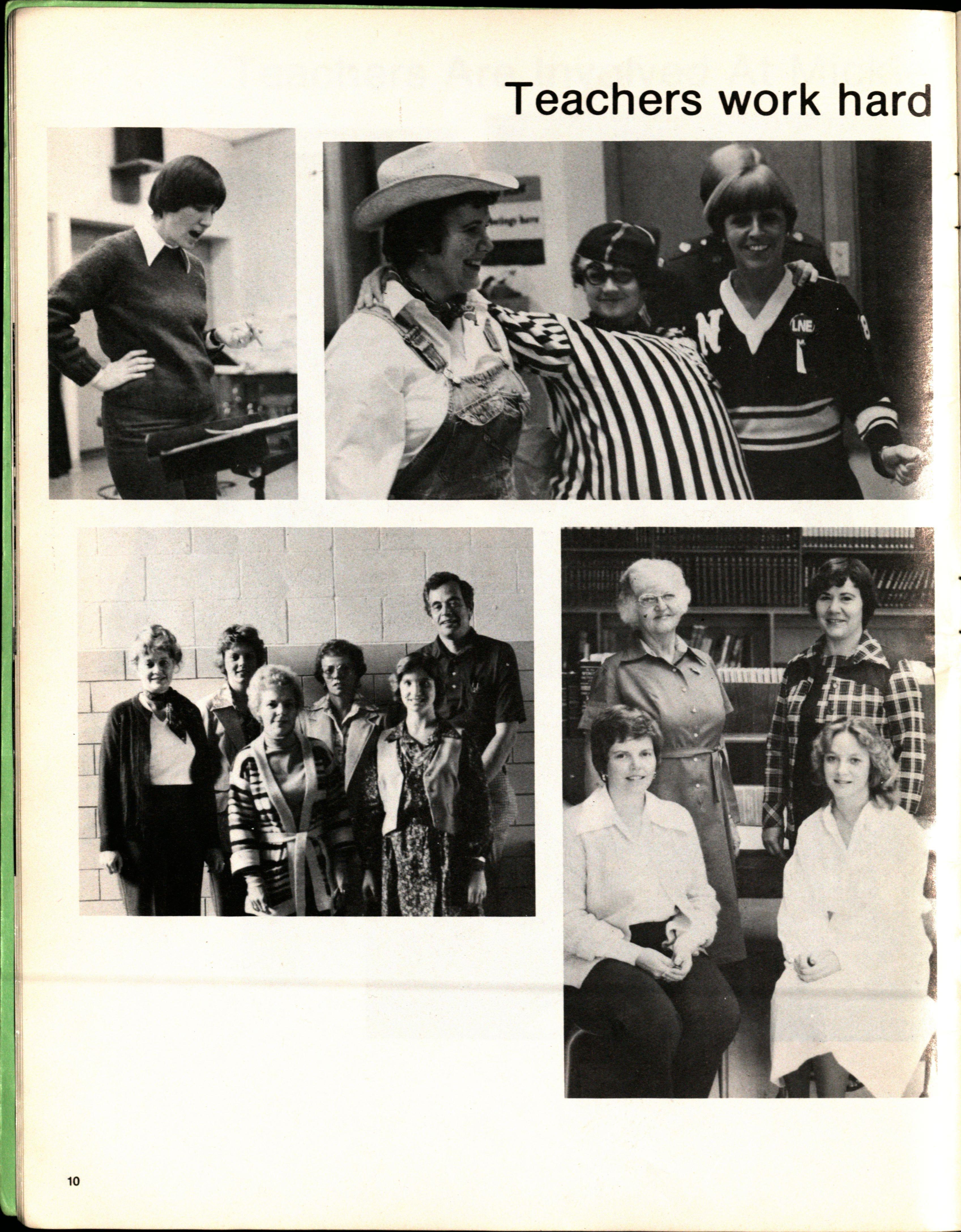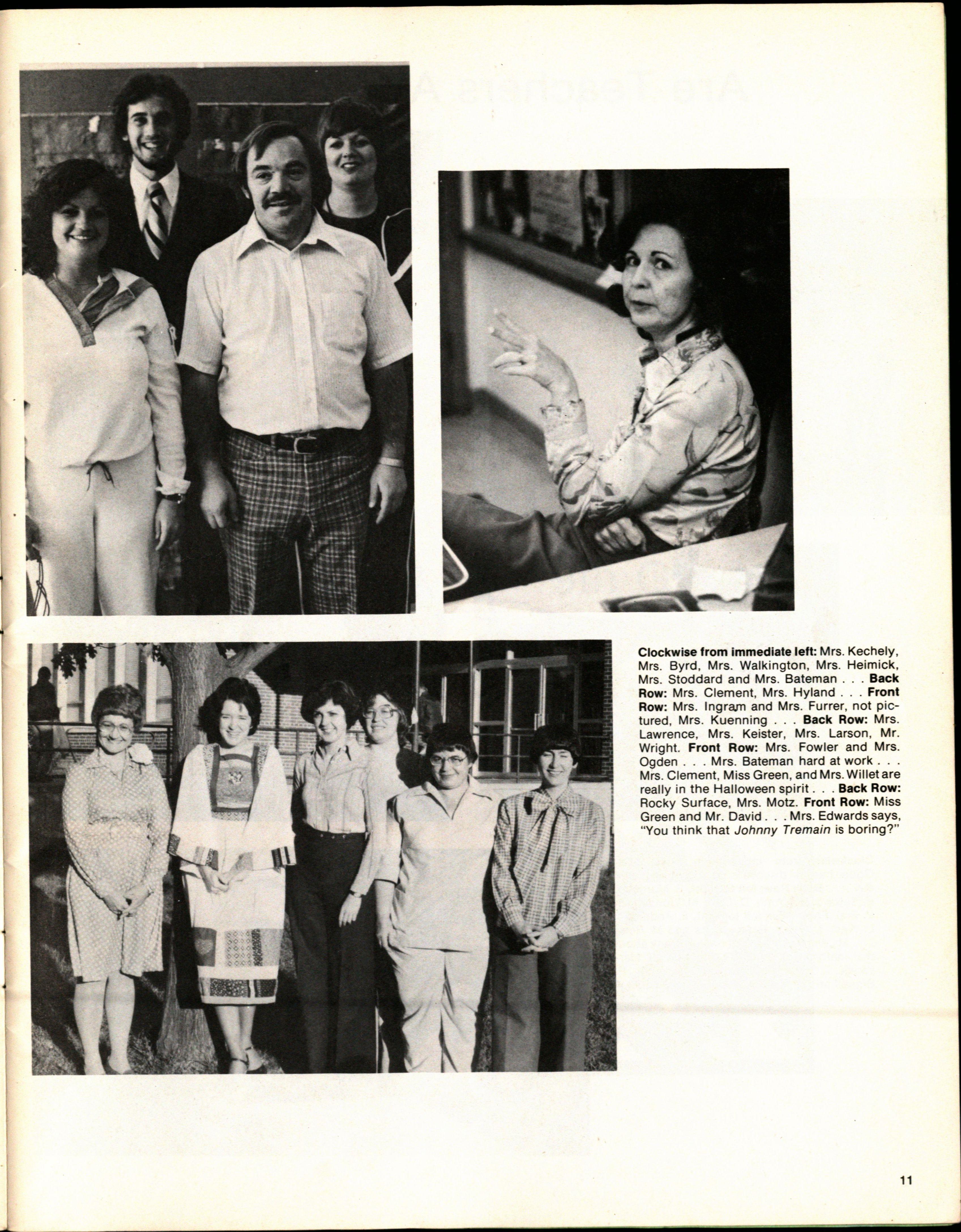 Clockwise from immediate left: Mrs. Kechely , Mrs. Byrd , Mrs. Walkington , Mrs Heimick , Mrs Stoddard and Mrs. Bateman Back Row: Mrs. Clement , Mrs Hyland Front Row: Mrs. Ingram and Mrs Furrer , not p i ctured , Mrs Kuenn ing Back Row: Mrs Lawrence , Mrs Keister , Mrs Larson , Mr. Wright. Front Row: Mrs. Fowler and Mrs. Ogden Mrs Bateman hard at work Mrs C lement , Miss Green , and Mrs . Willet are really in the Halloween sp irit Back Row: Rocky Surface , Mrs Motz Front Row: Miss Green and Mr. David Mrs Edwards says , " You think that Johnny Tremain is boring ?"