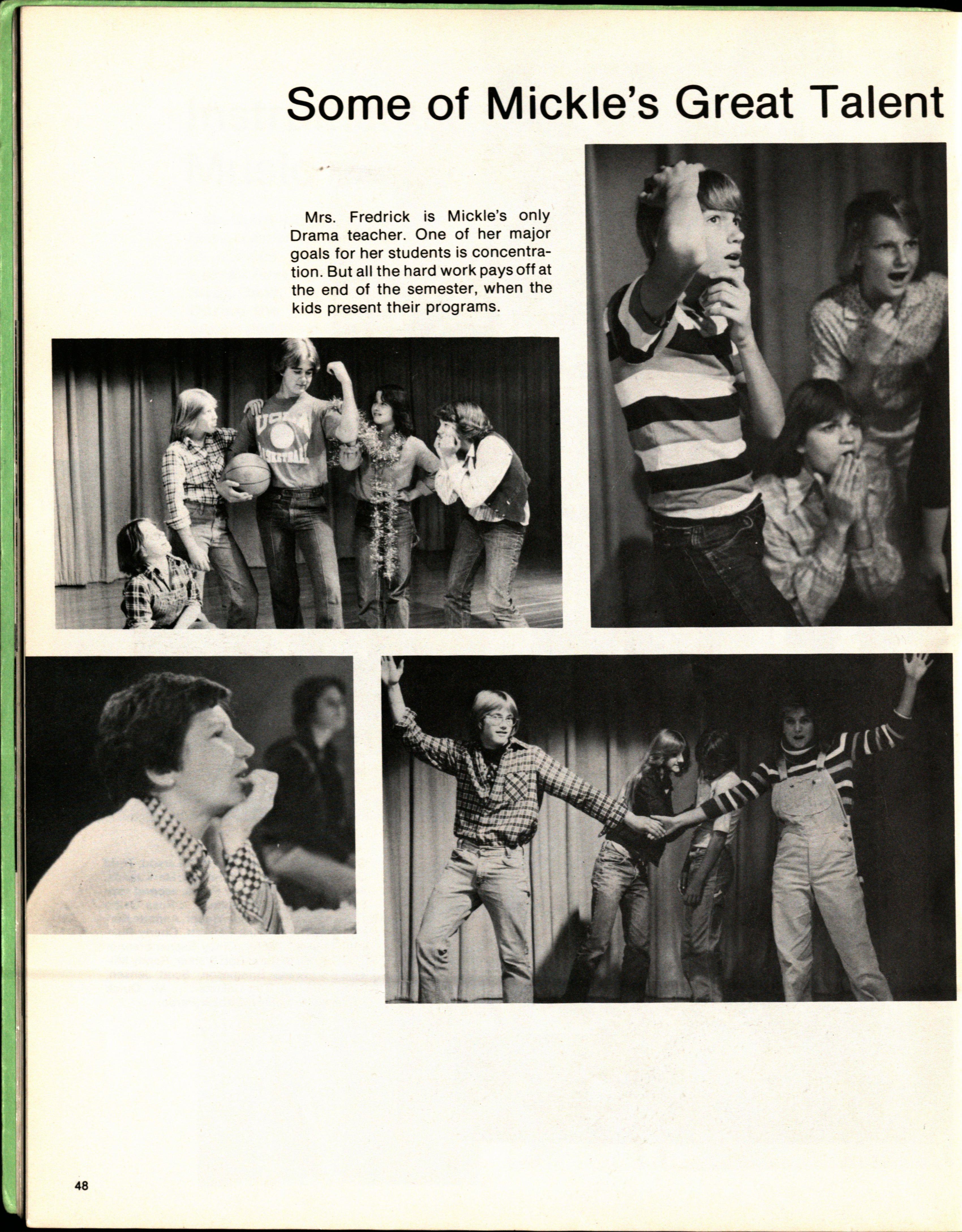 Mrs. Fredrick is Mickie's only Drama teacher. One of her major goals for her students is concentration But all the hard work pays off at the end of the semester, when the kids present their programs.