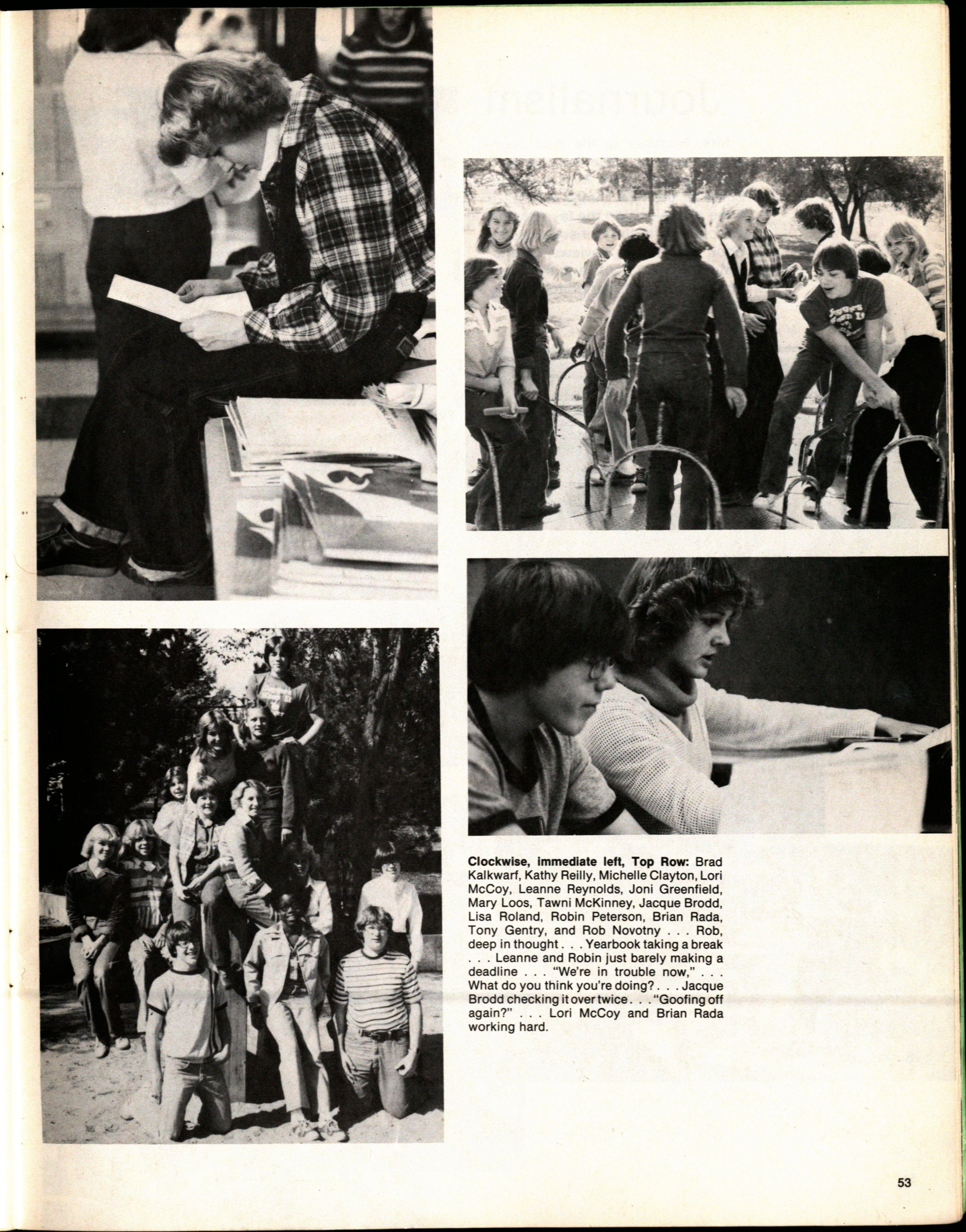Clockwise, immediate left, Top Row: Brad Kalkwarf , Kathy Reilly, Michelle Clayton , Lori McCoy, Leanne Reynolds , Joni Greenfield , Mary Loos , Tawni McKinney, Jacque Brodd , Lisa Roland , Robin Peterson , Brian Rada , Tony Gentry , and Rob Novotny Rob , deep in thought Yearbook taking a break Leanne and Robin just barely making a deadline " We 're in trouble now ," What do you think you ' re doing? Jacque Brodd check in g it over twice " Goofing off aga in?" Lor i McCoy and Brian Rada working hard.