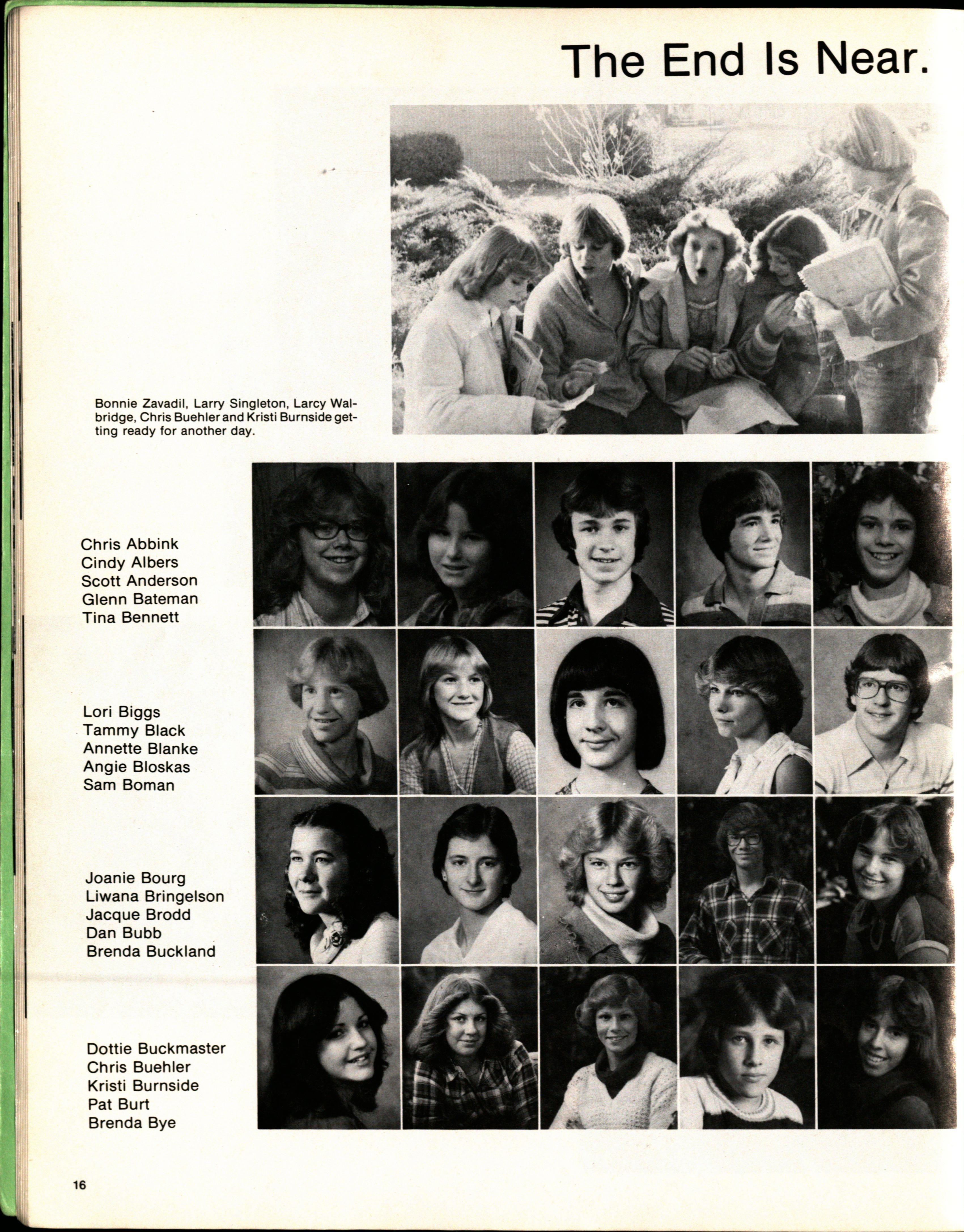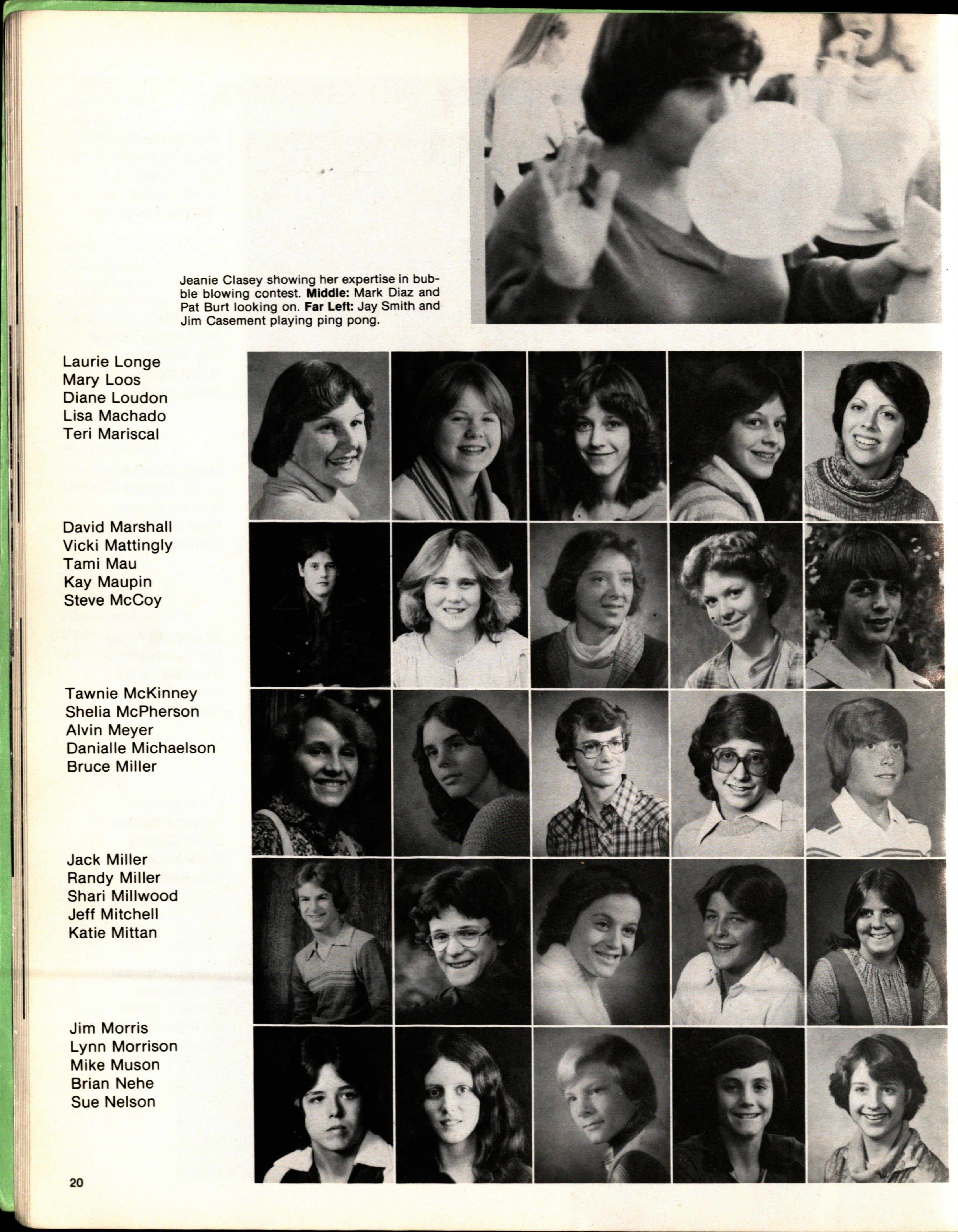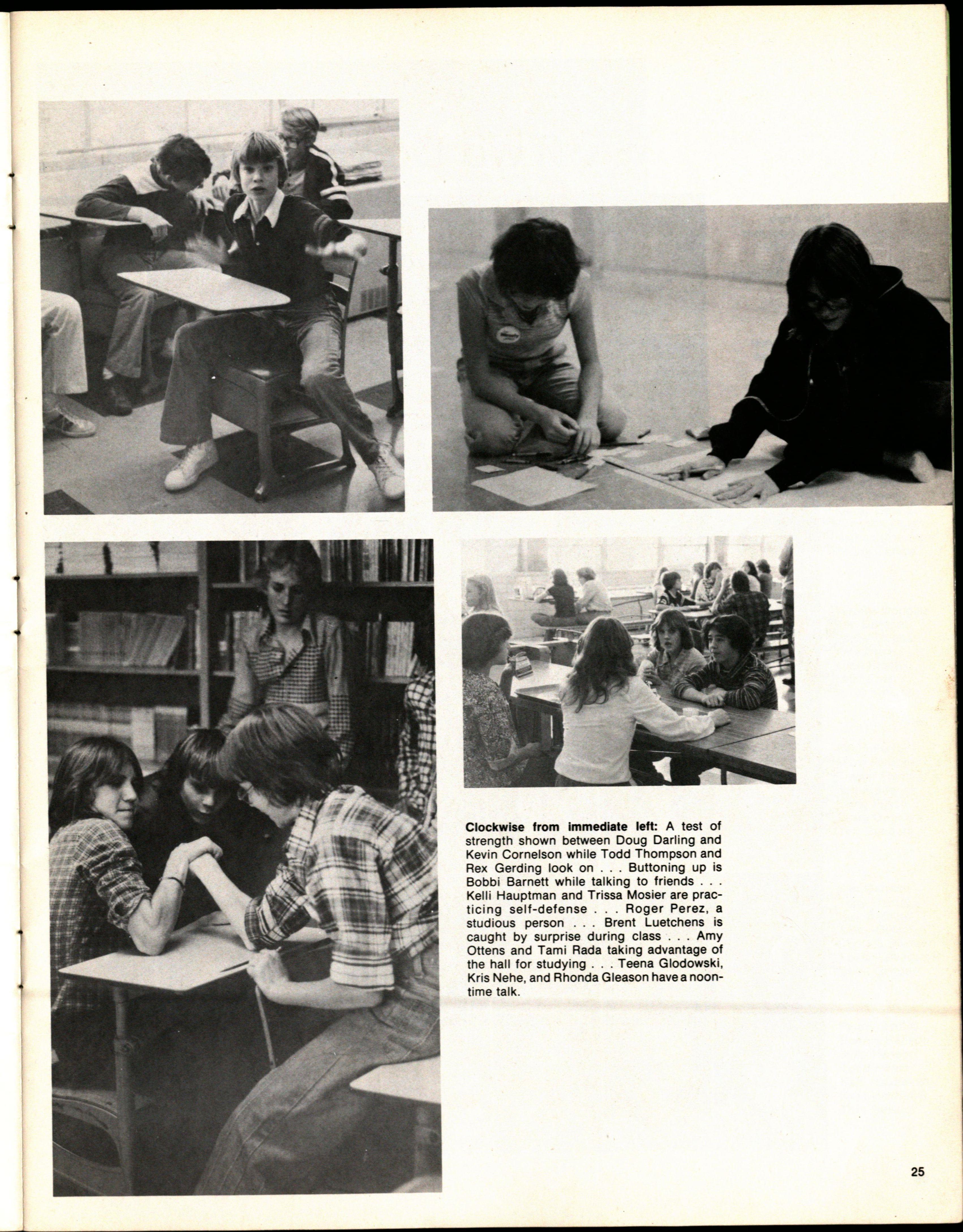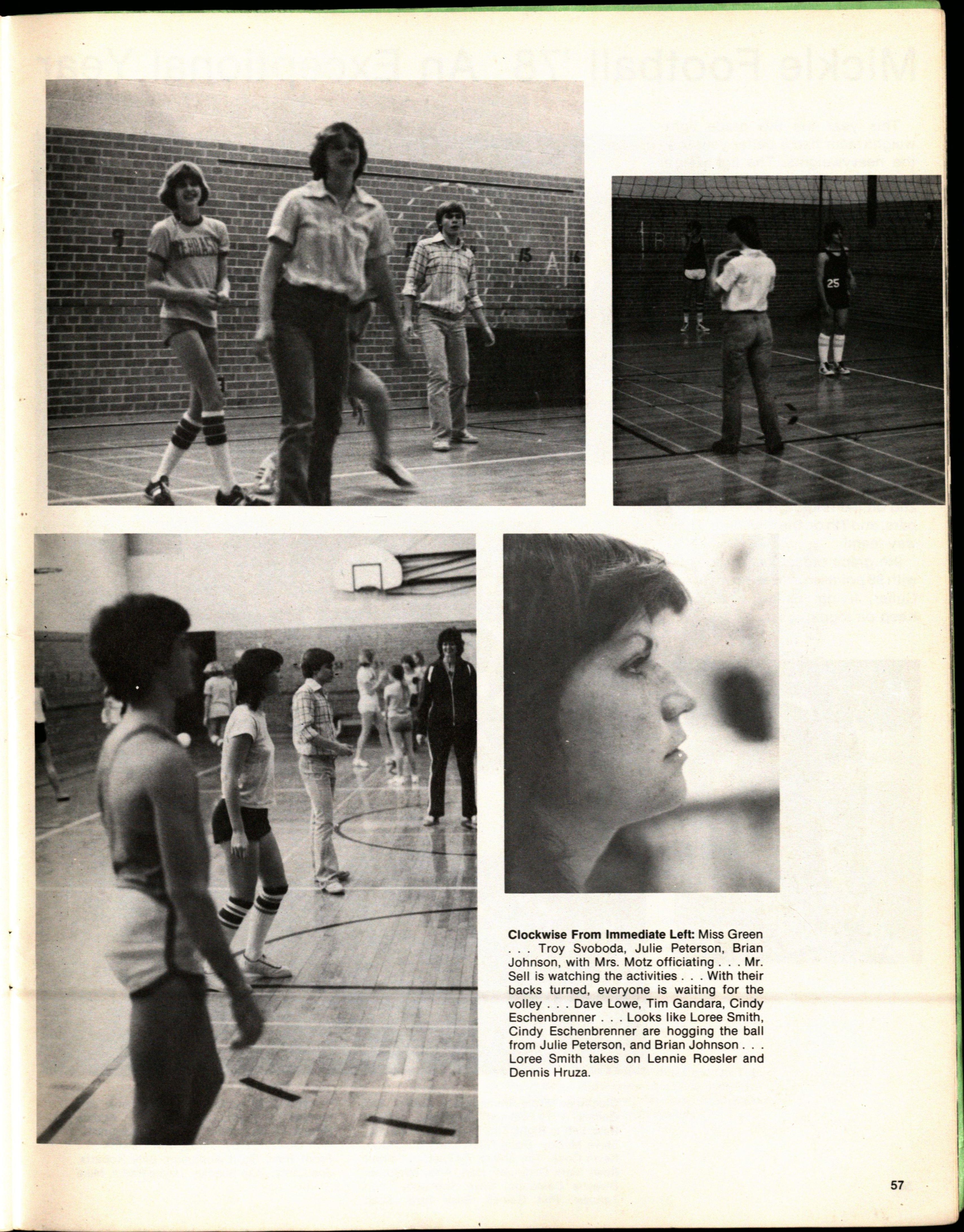 Clockwise From Immediate Left: Miss Green Troy Svoboda , Julie Peterson , Brian Johnson , with Mrs. Motz officiating Mr. Sell is watching the activities With their backs turned , everyone is waiting for the volley Dave Lowe , Tim Gandara , Cindy Eschenbrenner Looks like Loree Smith , C i ndy Eschenbrenner are hogging the ball from Julie Peterson , and Brian Johnson Loree Smith takes on Lennie Roesler and Denn i s Hruza