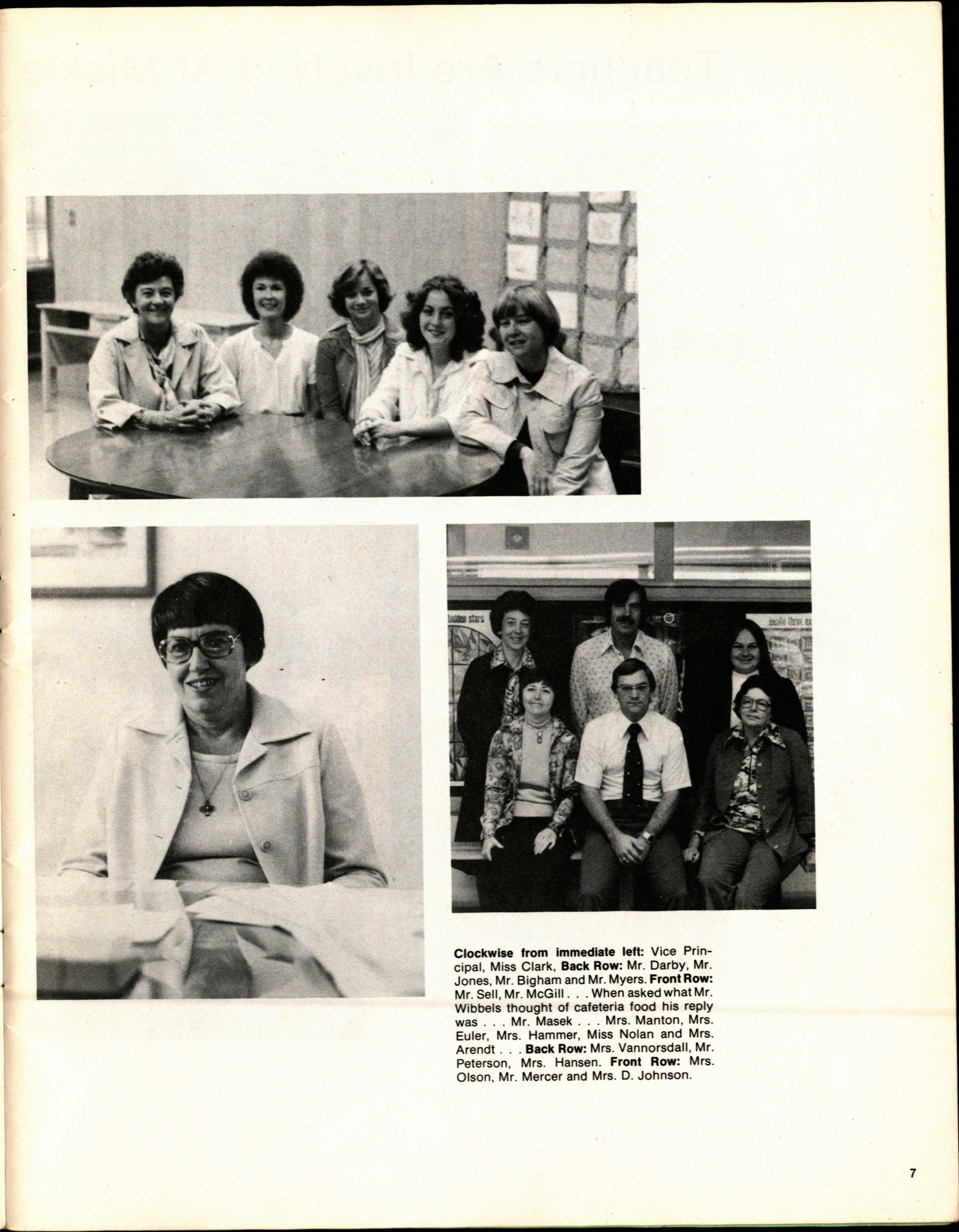 Clockwise from Immediate left: Vice Principal , Miss Clark , Back Row: Mr Darby , Mr. Jones , Mr Bigham and Mr. Myers Front Row: Mr. Sell , Mr McGill When asked what Mr Wibbe l s thought of cafeteria food his reply was Mr Masek . Mrs. Manton , Mrs Eu l er , Mrs Hammer , Miss Nolan and Mrs Arendt Back Row: Mrs. Vannorsdall , Mr Peterson , Mrs . Hansen Front Row: Mrs Olson , Mr Mercer and Mrs D Johnson