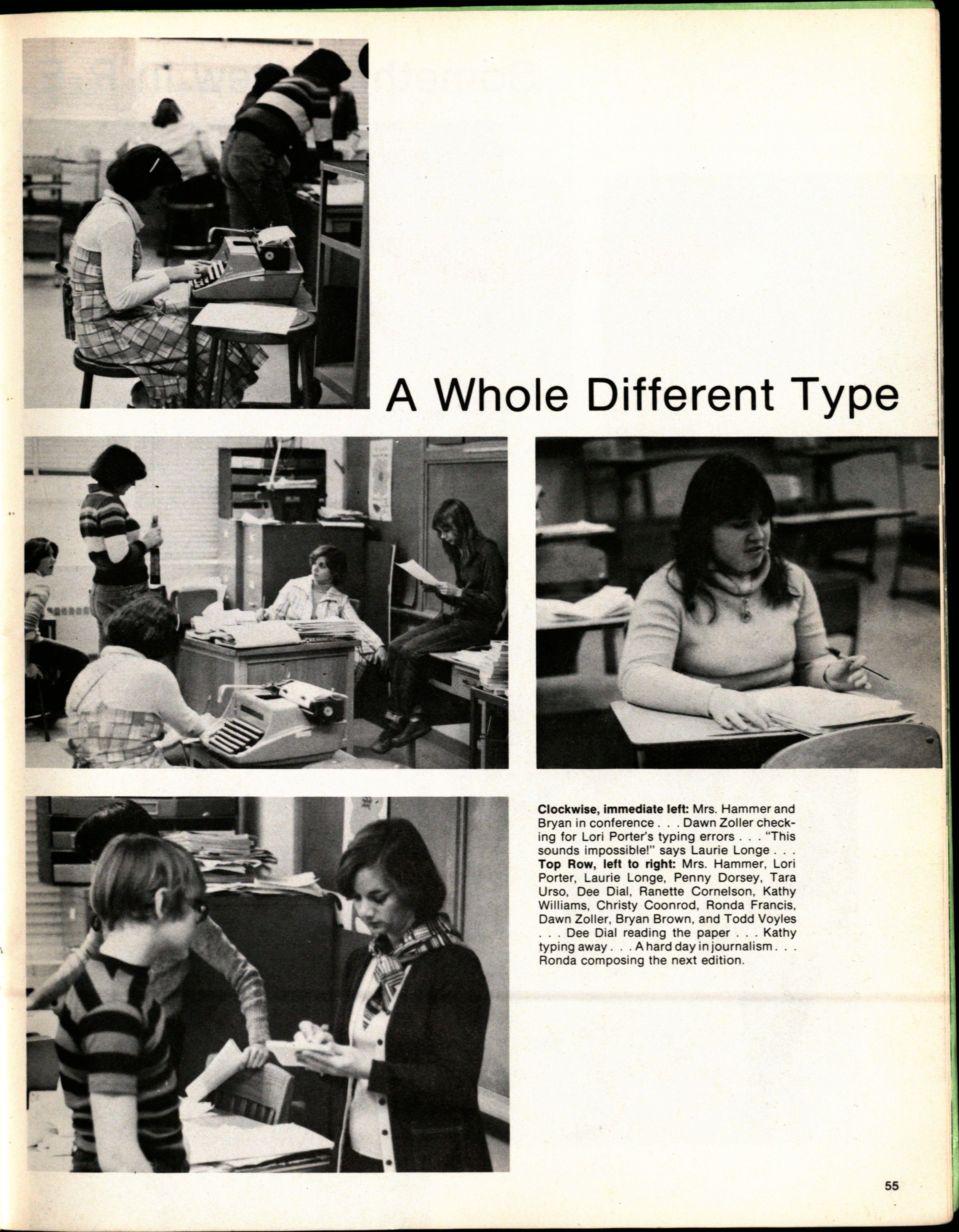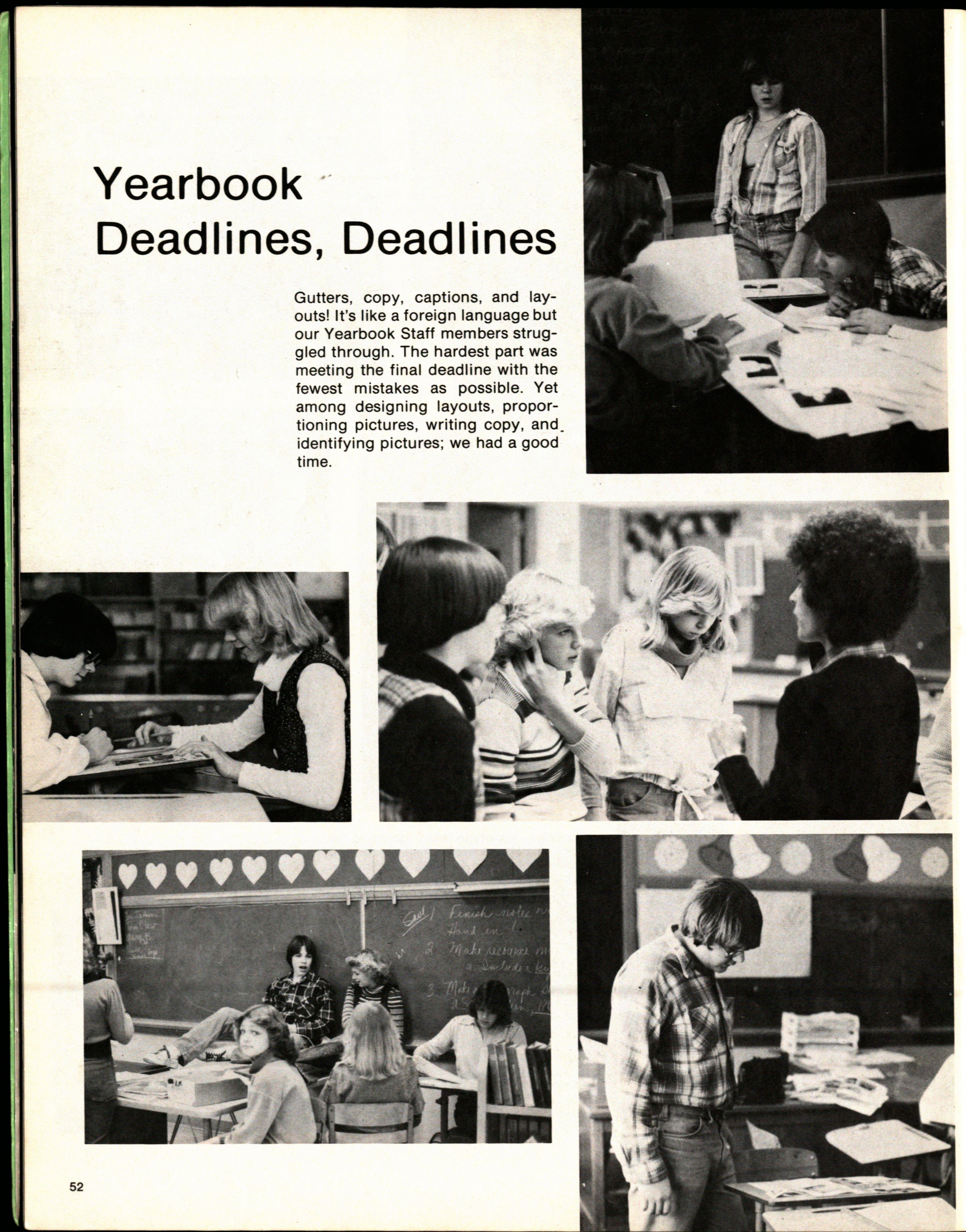 Gutters , copy , captions , and layouts! It's like a foreign language but our Yearbook Staff members struggled through. The hardest part was meeting the f i nal deadline with the fewest mistakes as possible. Yet among designing l ayouts , proportioning pictures , writing copy , and _ identifying pictures ; we had a good time.