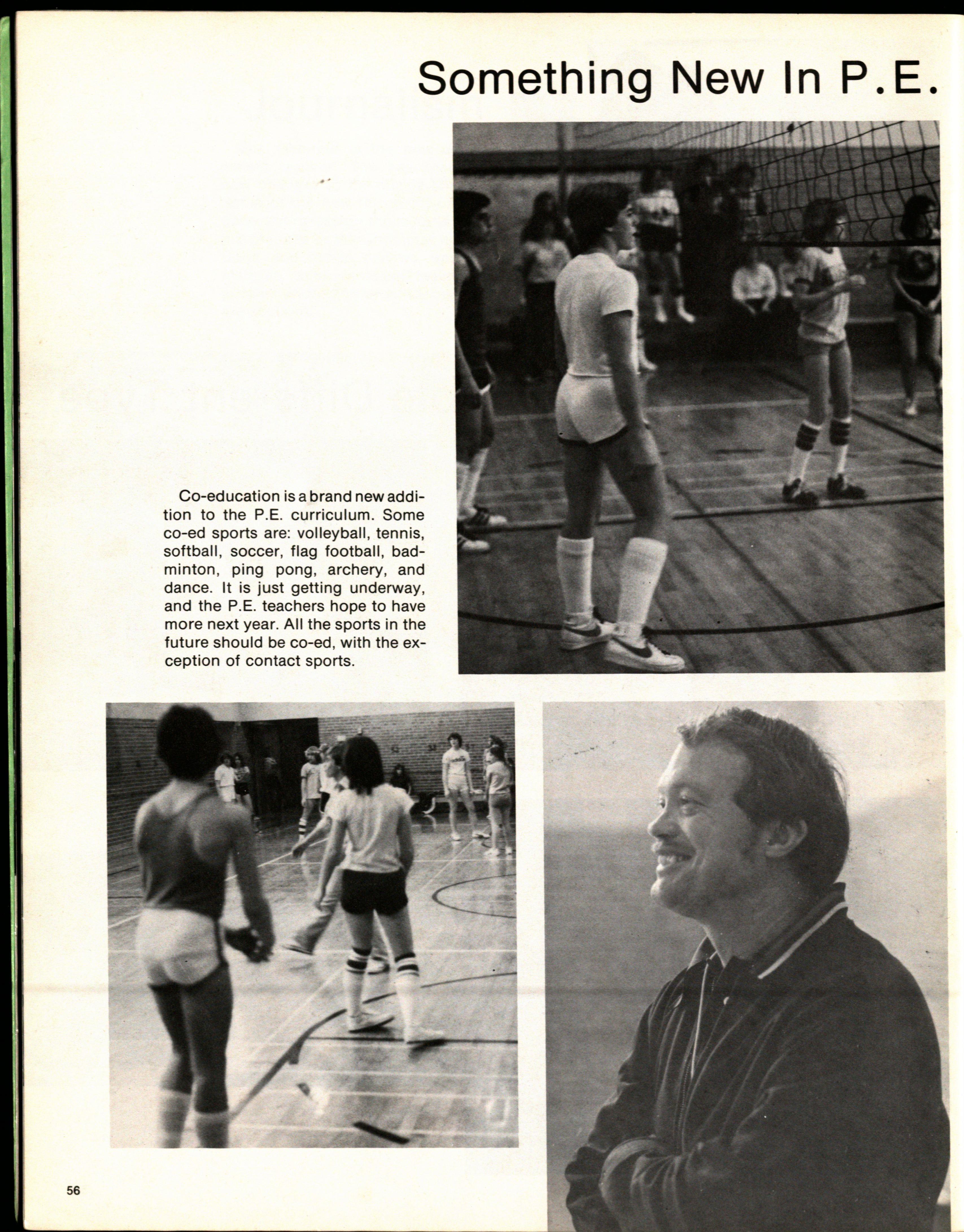 Co-education is a brand new addition to the P E. curriculum. Some co-ed sports are : volleyball , tennis , softball , soccer , flag football , badminton , ping pong , archery , and dance. It is just getting underway , and the P E. teachers hope to have more next year All the sports in the future should be co-ed , with the exception of contact sports.