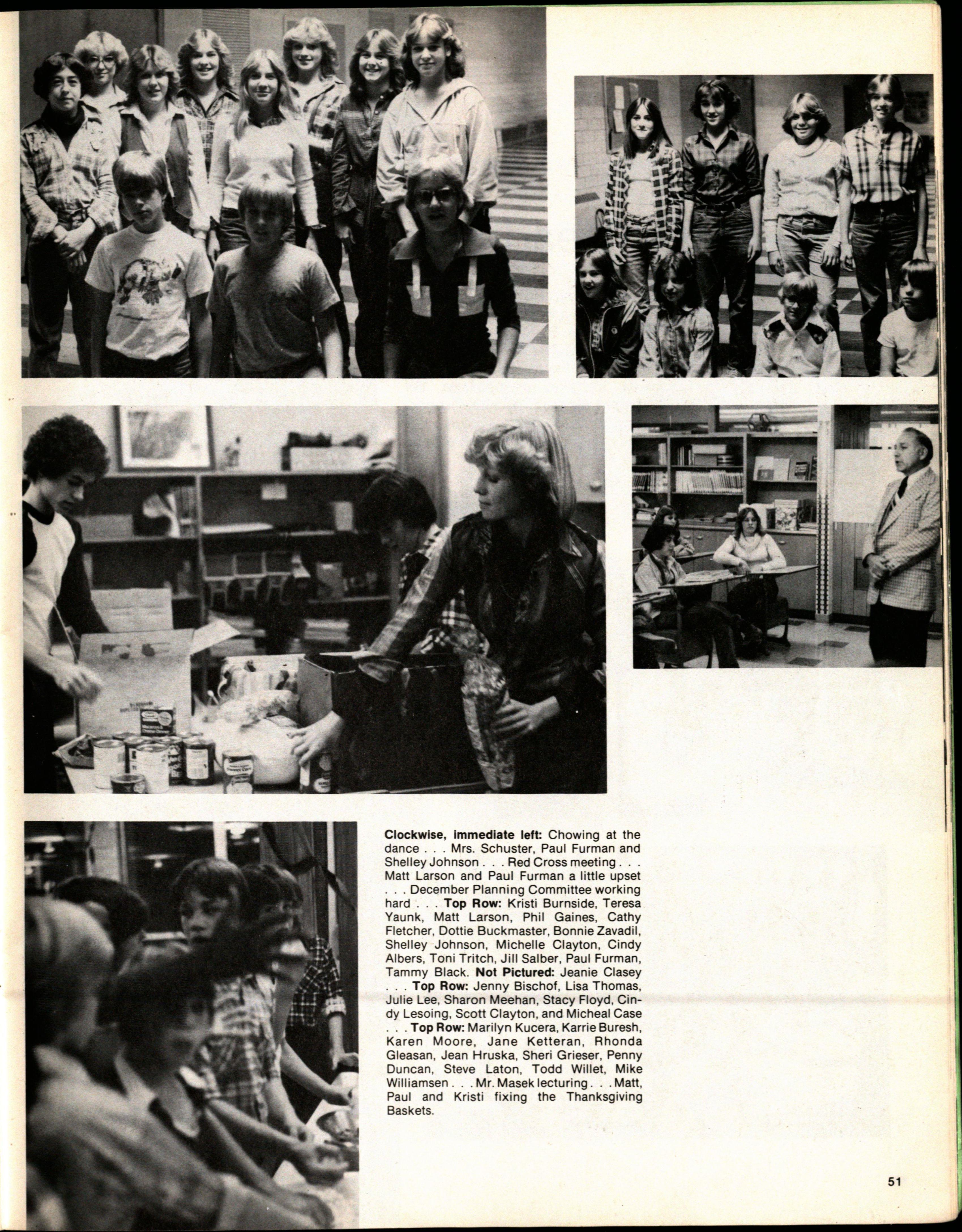 Clockwise, immediate left: Chow in g at the dance Mrs. Schuster , Pau l Furman and Shelley Johnson Red Cross meeting Matt Larson and Pau l Furman a little upset December Planning Committee working hard