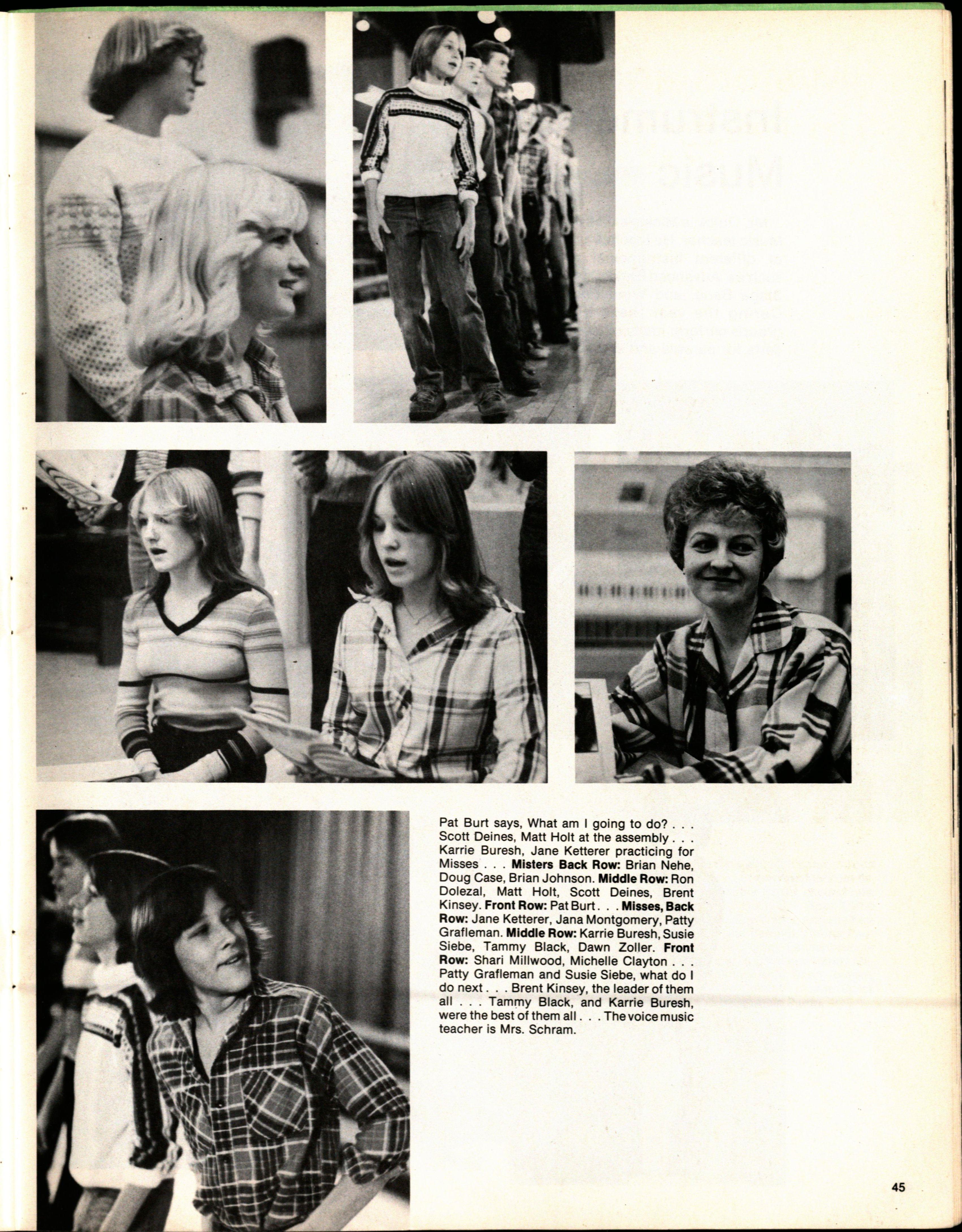 Ka rri e Buresh , Jane Ketterer practicing for Misses Misters Back Row: Brian Nehe, Doug Case , Brian Johnson. Mlddle Row: Ron Dolezal , Matt Holt , Scott Deines, Brent Kinsey. Front Row: Pat Burt Misses, Back Row: Jane Ketterer , Jana Montgomery, Patty Grafleman. Middle Row: Karrie Buresh , Susie Siebe, Tammy Black , Dawn Zoller. Front Row: Shari Millwood, Michelle Clayton Patty Grafleman and Susie Siebe , what do I do next Brent Kinsey , the leader of them a ll Tam!lly Black, and Karrie Buresh , were the best of them all The voice music teacher is Mrs. Schram