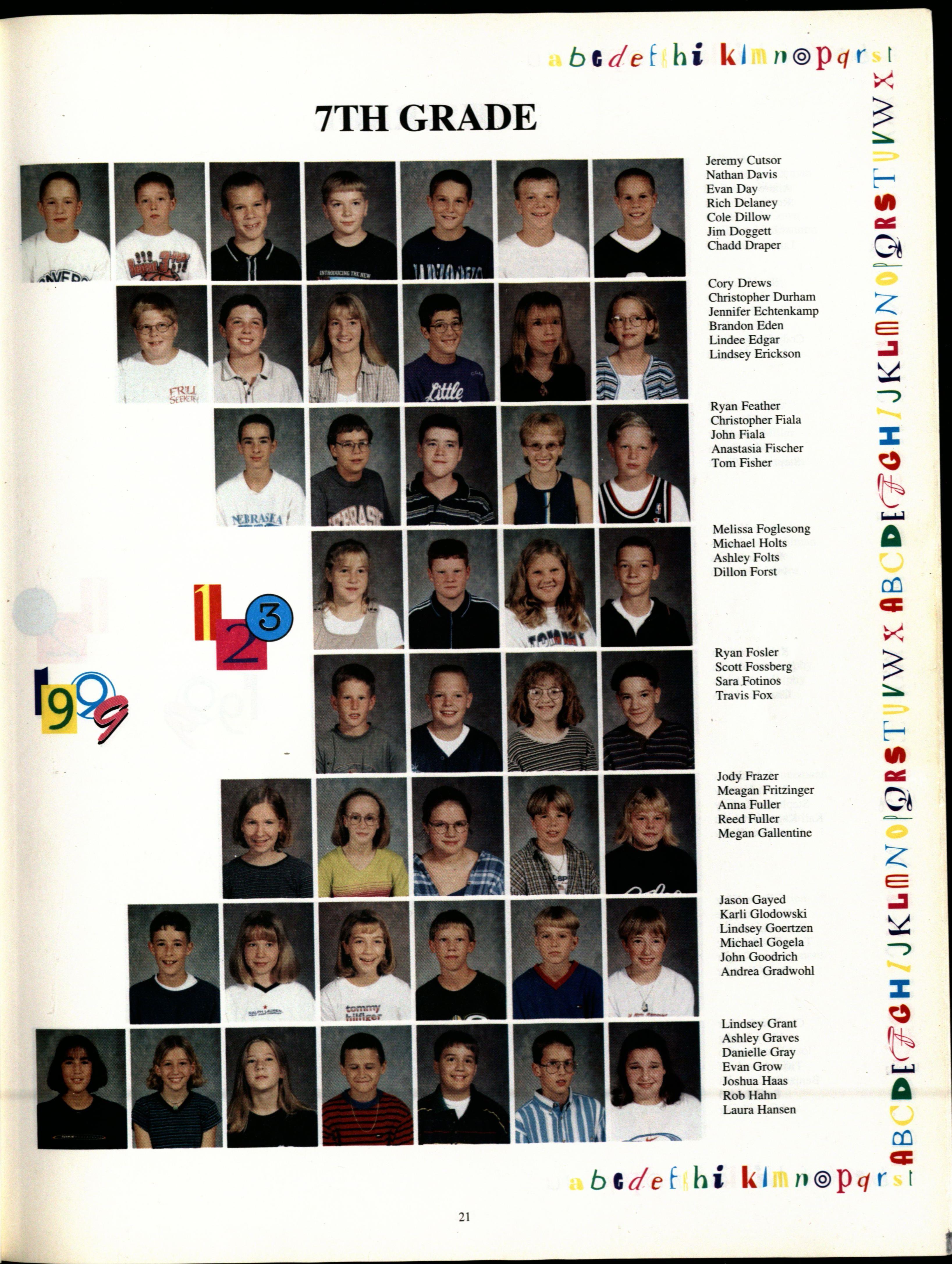 7th Grade Row 1: Ceanna Seaman , Sara Towne , Jessica Lemon , Alisha Oakeson , Sara Born Row 2: Maris a Skopp , Katie Rau sch , Shell y Be ch , Jennie Jones, Jes ica Colson. Row 3: Amanda Peck, Amanda Wismer , Meagan Fritzinger, Katie Rump . Back: Paula Smith , Melissa Robinson , Jodi Frazer , atalie Aksamit, atalie Swenson , Jessica Cain , Ingrid Johnson , Jennifer Branum, Nora Lenz.
