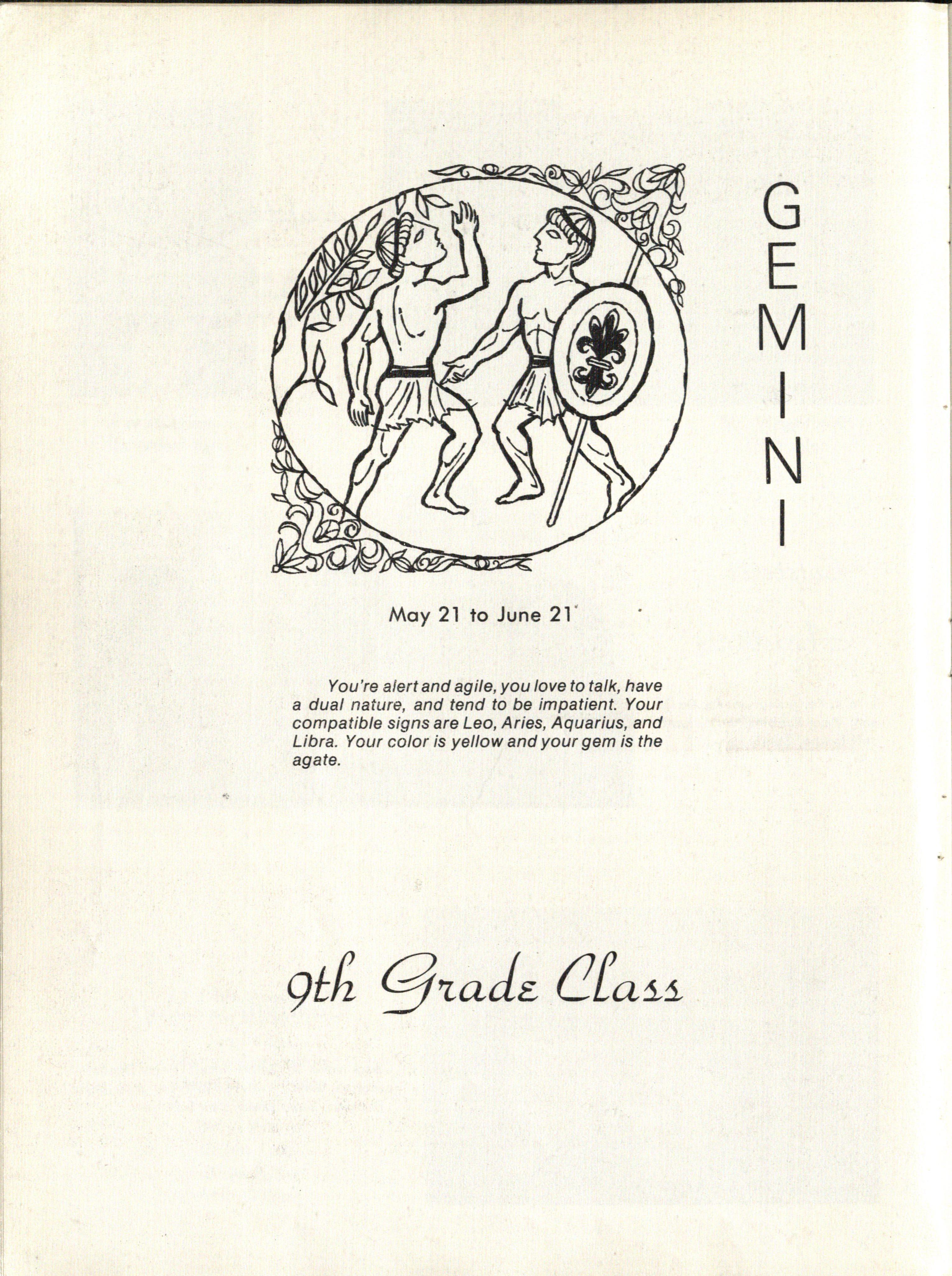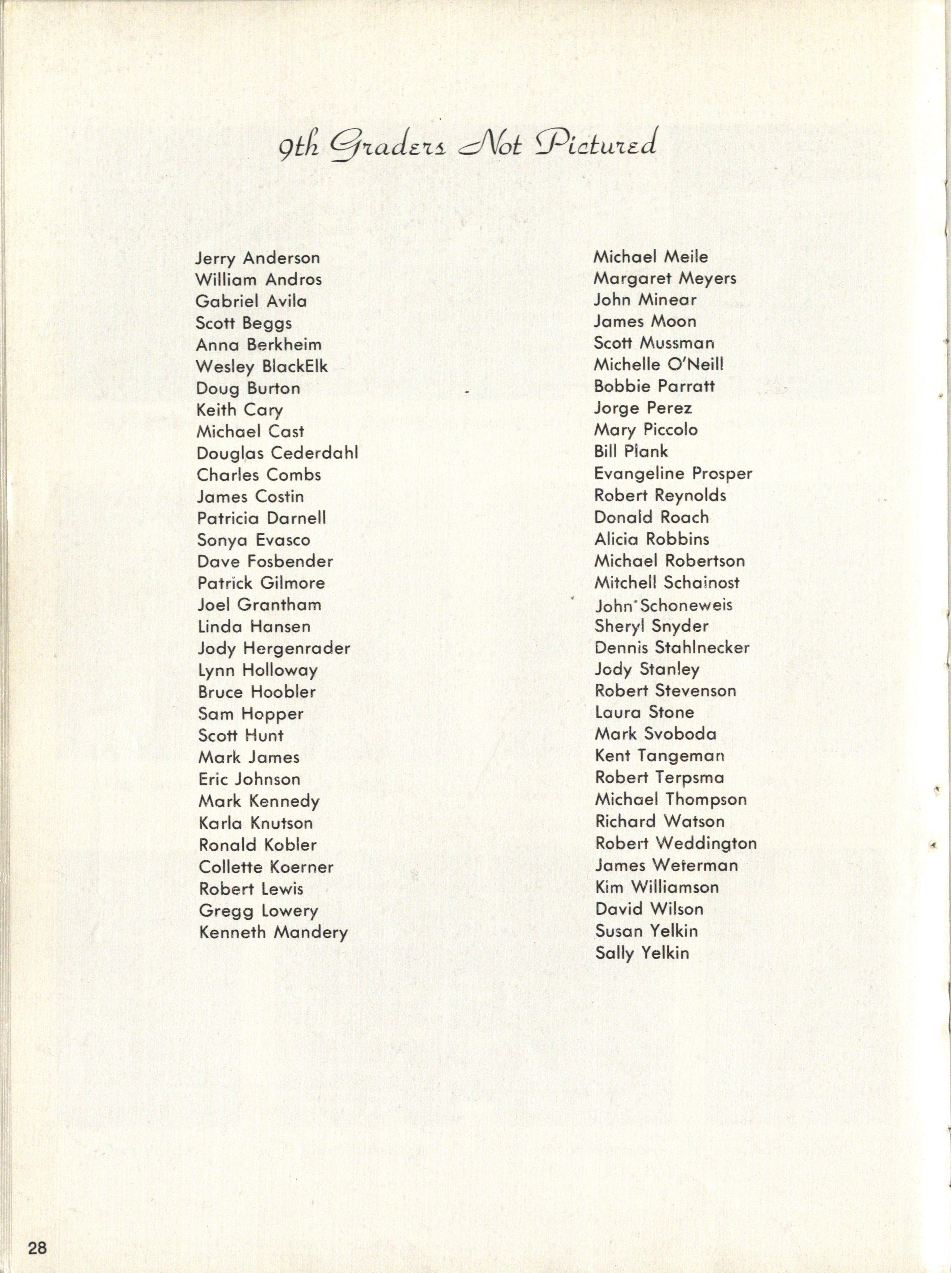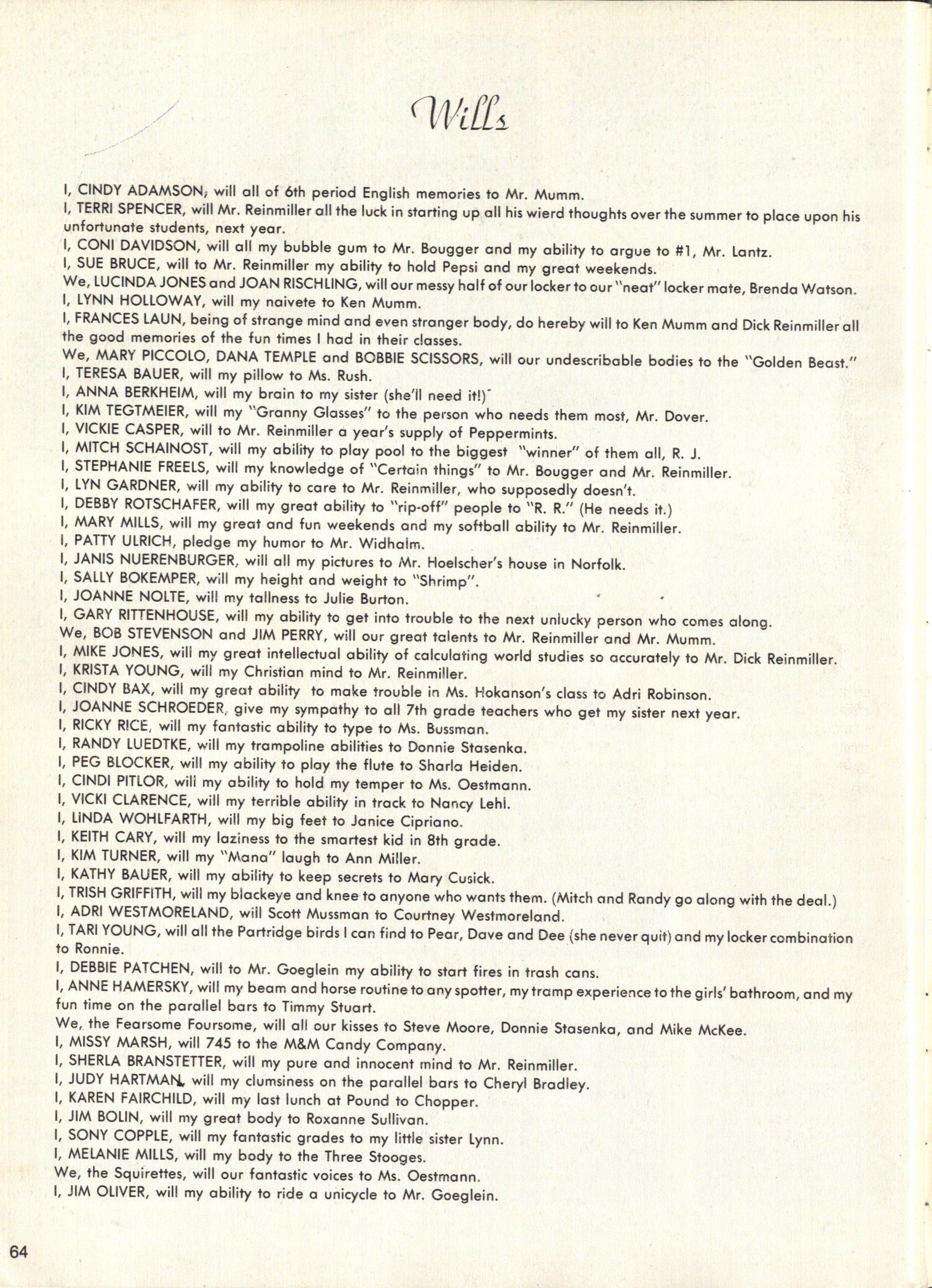 I, PEG BLOCKER, will my ability to play the flute to Sharla Heiden. I, CINDI PITLOR , will my ability to hold my temper to Ms. Oestmann I, VICKI CLARENCE, will my terrible ability in track to Nancy Lehi.
