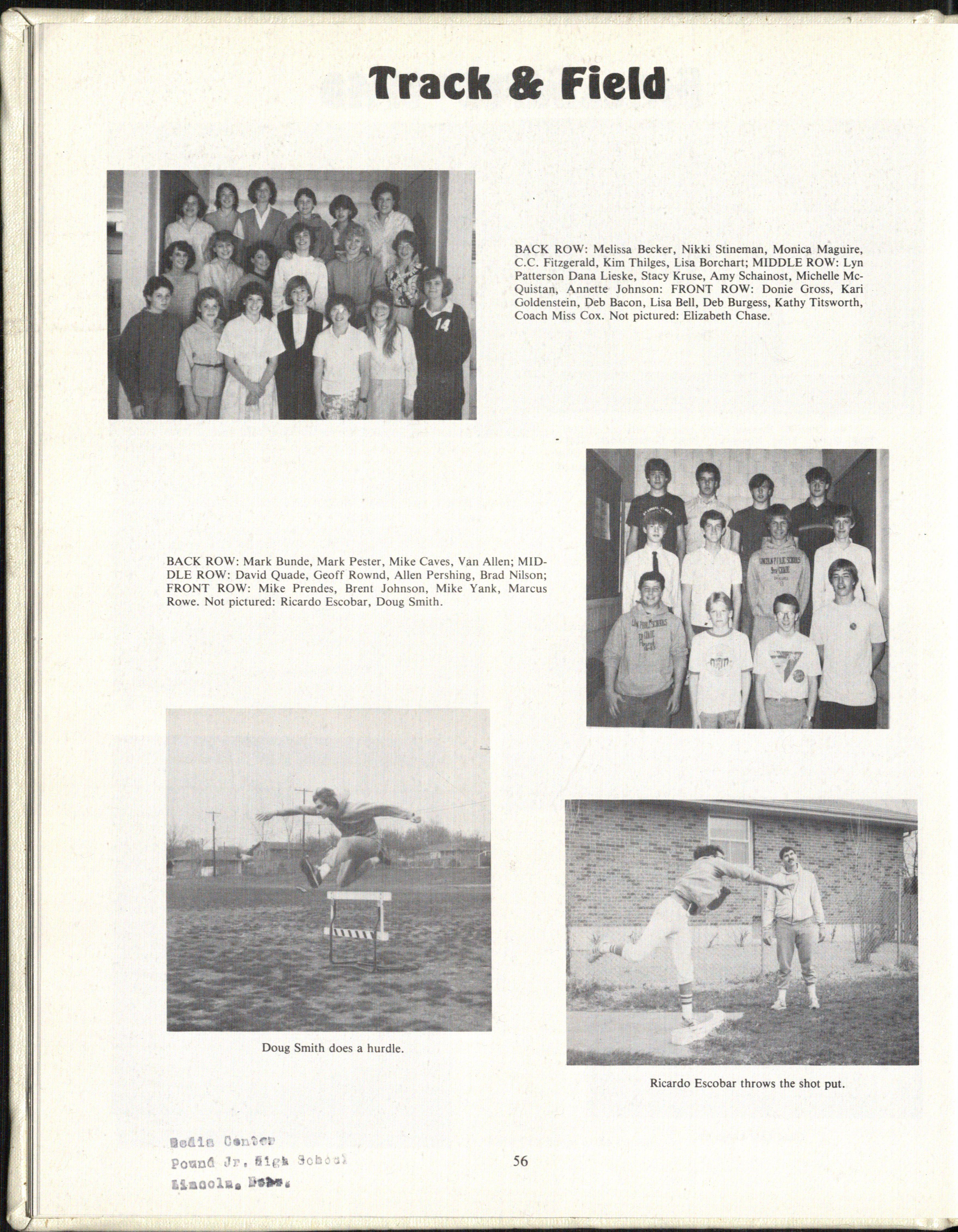 BACK ROW: Melissa Becker, Nikki Stineman, Monica Maguire, C.C. Fitzgerald, Kim Thilges, Lisa Borchart; MIDDLE ROW: Lyn Patterson Dana Lieske, Stacy Kruse, Amy Schainost, Michelle McQuistan, Annette Johnson: FRONT ROW: Danie Gross, Kari Goldenstein, Deb Bacon , Lisa Bell, Deb Burgess, Kathy Titsworth, Coach Miss Cox. Not pictured: Elizabeth Chase.