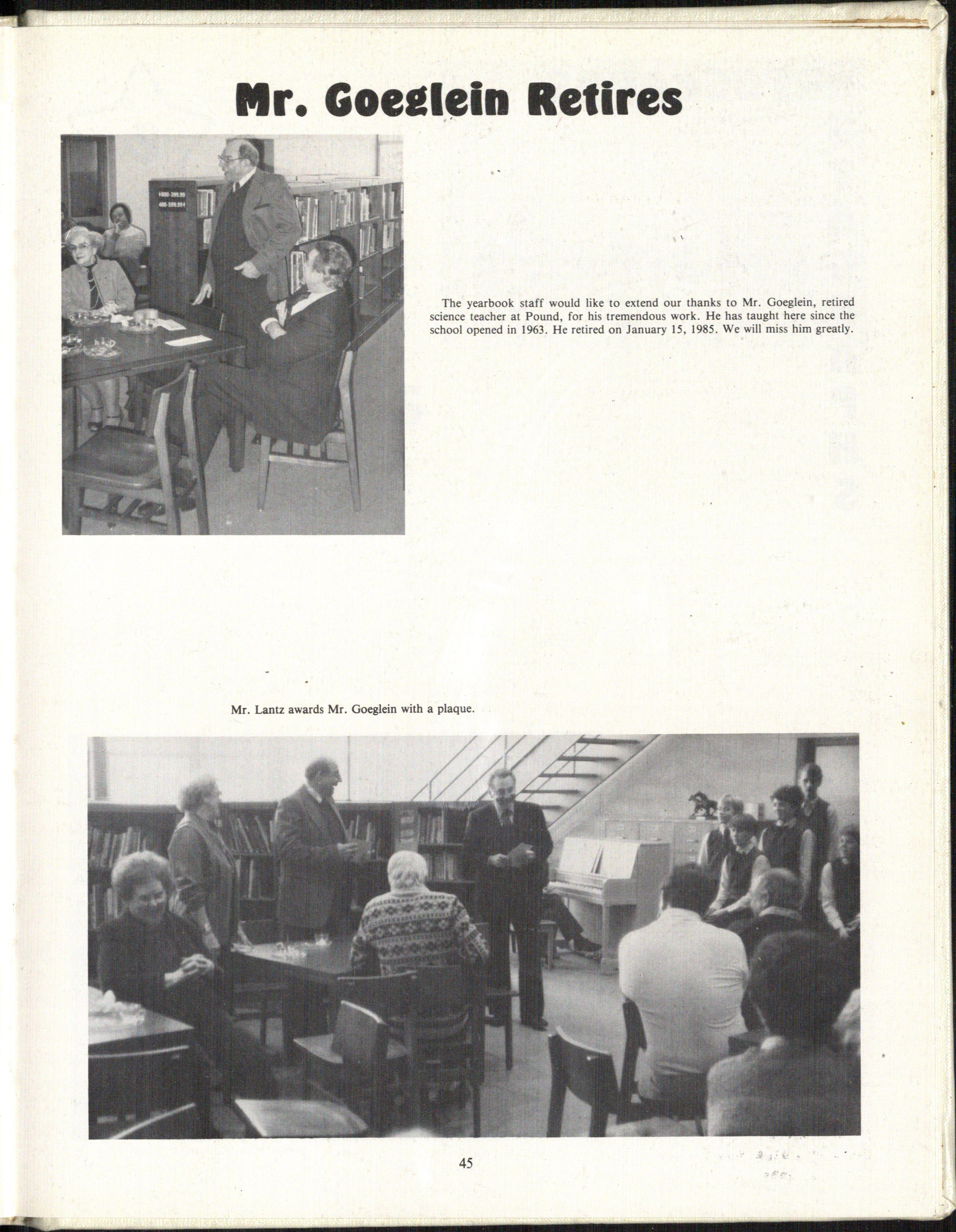 • The yearbook staff would like to extend our thanks to Mr. Goeglein, retired science teacher at Pound, for his tremendous work. He has taught here since the school opened in 1963. He retired on January 15, 1985. We will miss him greatly.